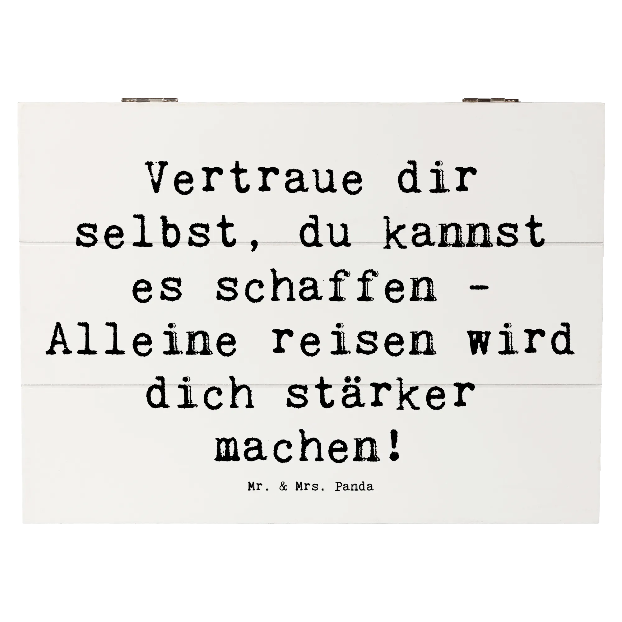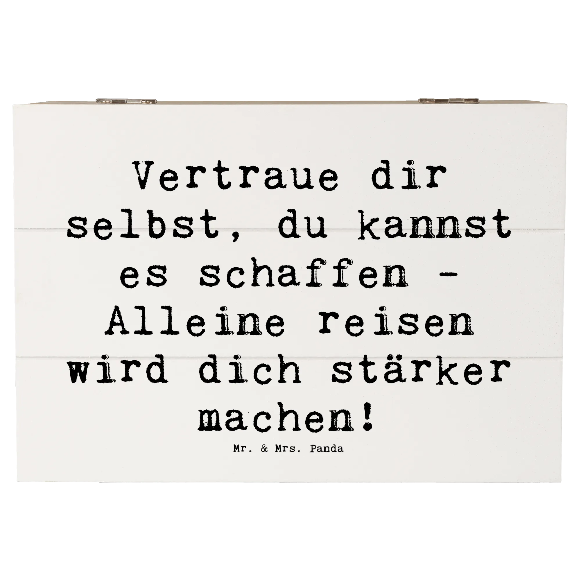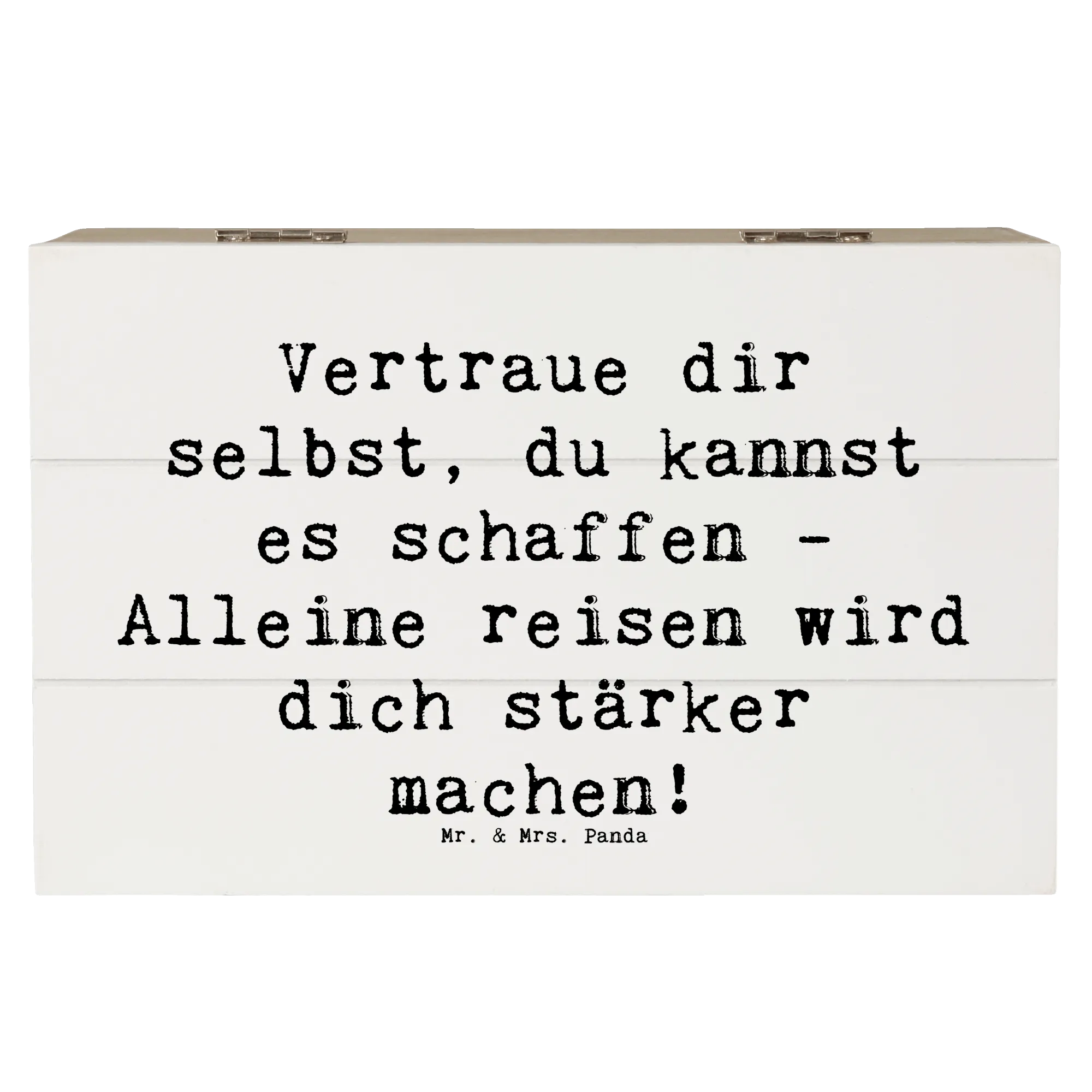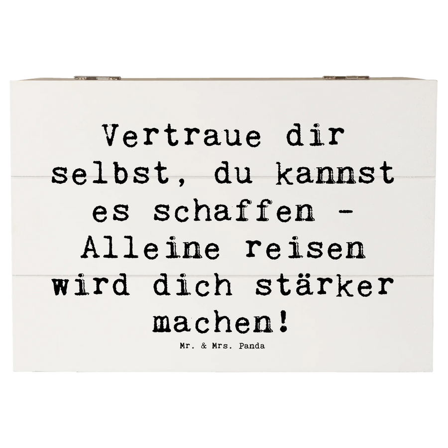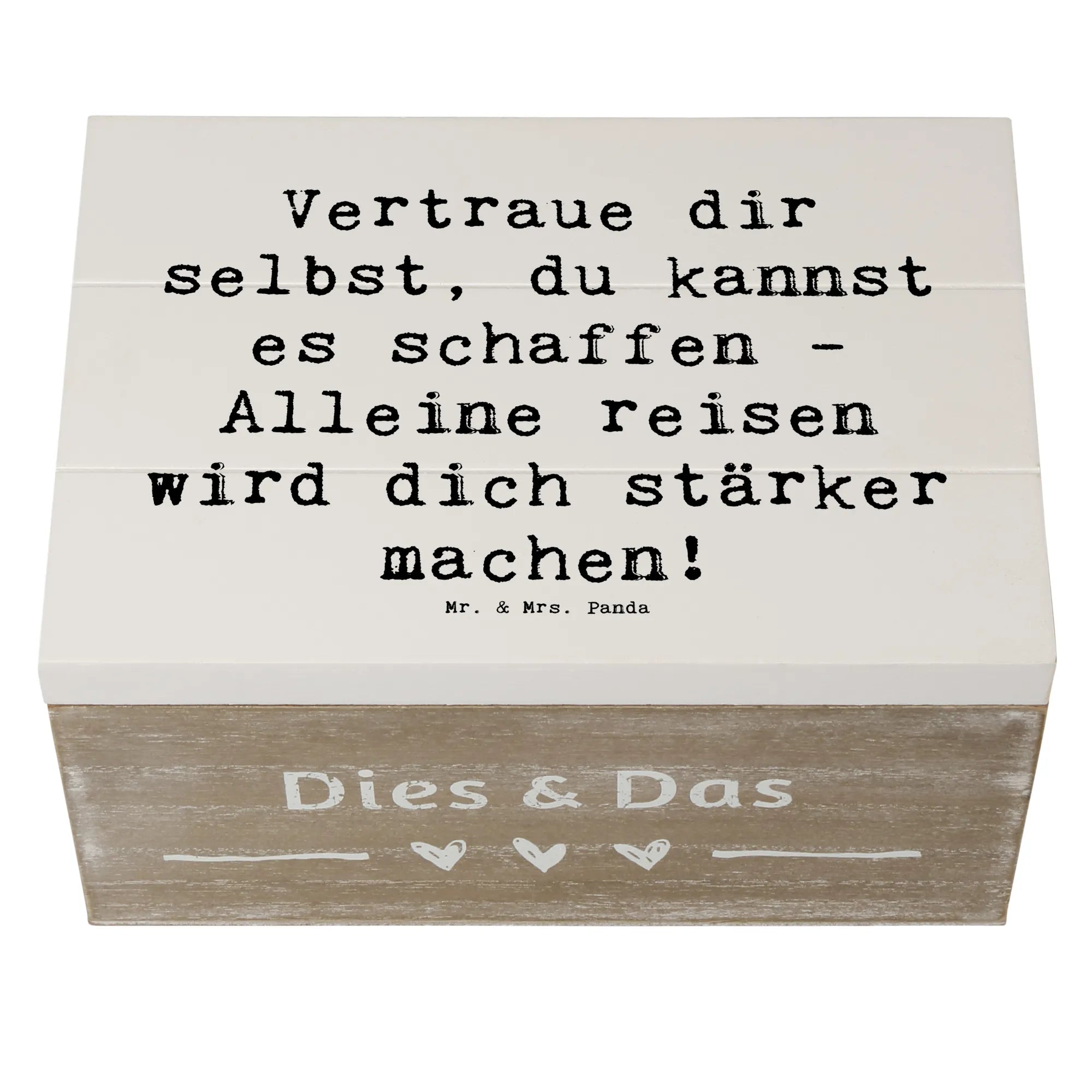 Ob für Fotos von deinen nächsten Abenteuern, kleine Erinnerungen aus deiner Kindheit oder bedeutungsvolle Geschenke - diese Kiste eignet sich ideal für all das und noch viel mehr! Mit dem kraftvollen Spruch "Vertraue dir selbst, du kannst es schaffen - Alleine reisen wird dich stärker machen!" inspiriert diese Holzkiste dazu, eigene Wege zu gehen und die Welt zu erkunden. Sie ist perfekt für all jene Abenteurer und Mutmacher da draußen, die eine besondere Botschaft transportieren wollen.