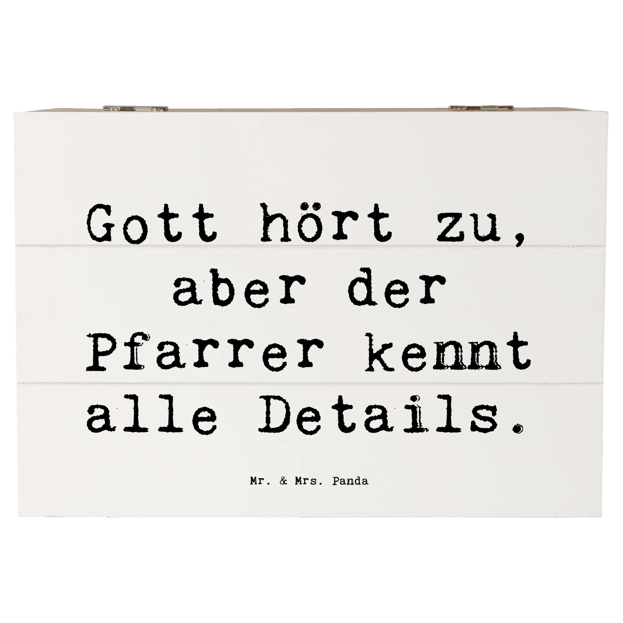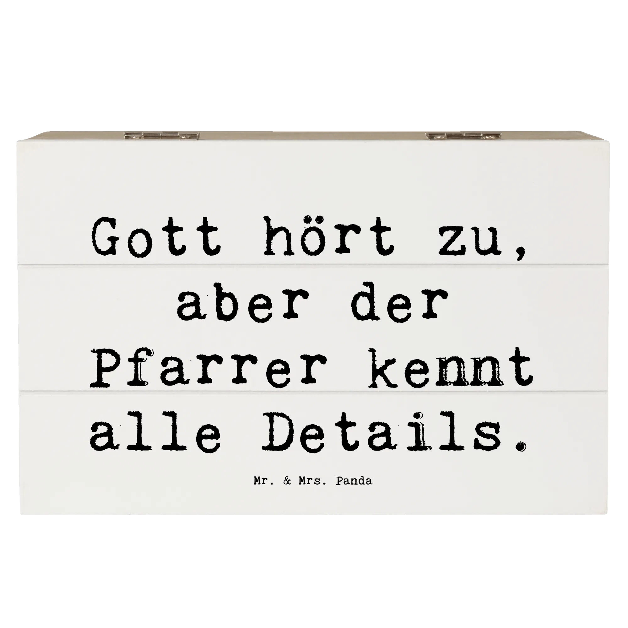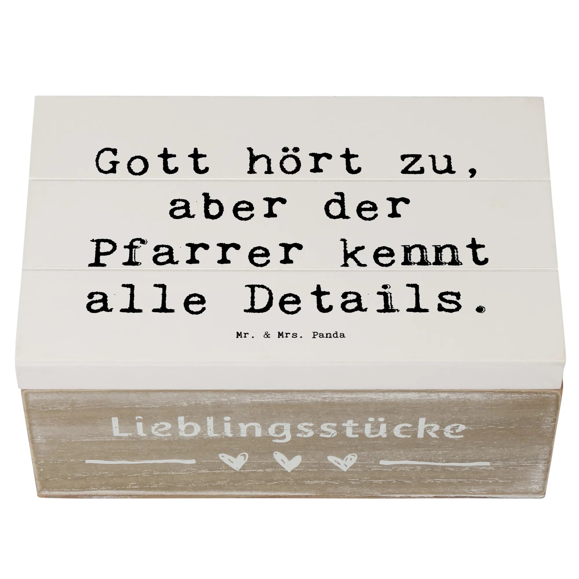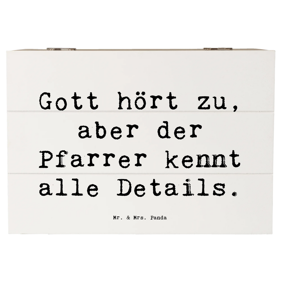 Die Holzkiste "Pfarrer" von Mr. & Mrs. Panda ist das perfekte Geschenk für jeden, der seinen Glauben und seine Berufung liebt. Mit einem liebevoll gestalteten Motiv und dem Spruch "Gott hört zu, aber der Pfarrer kennt alle Details" ist diese Kiste mehr als nur eine Aufbewahrungsbox. Sie wird zum wertvollen Aufbewahrungsort für Erinnerungen und besondere Schätze.