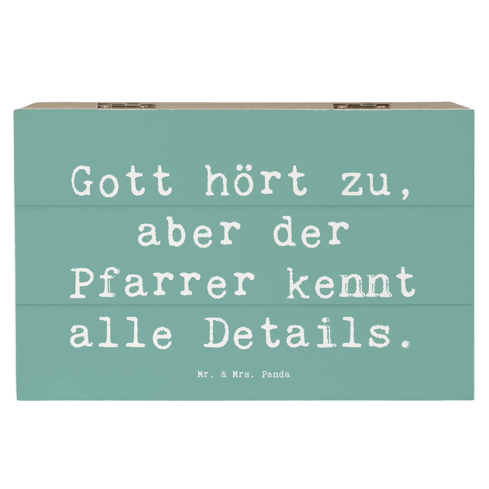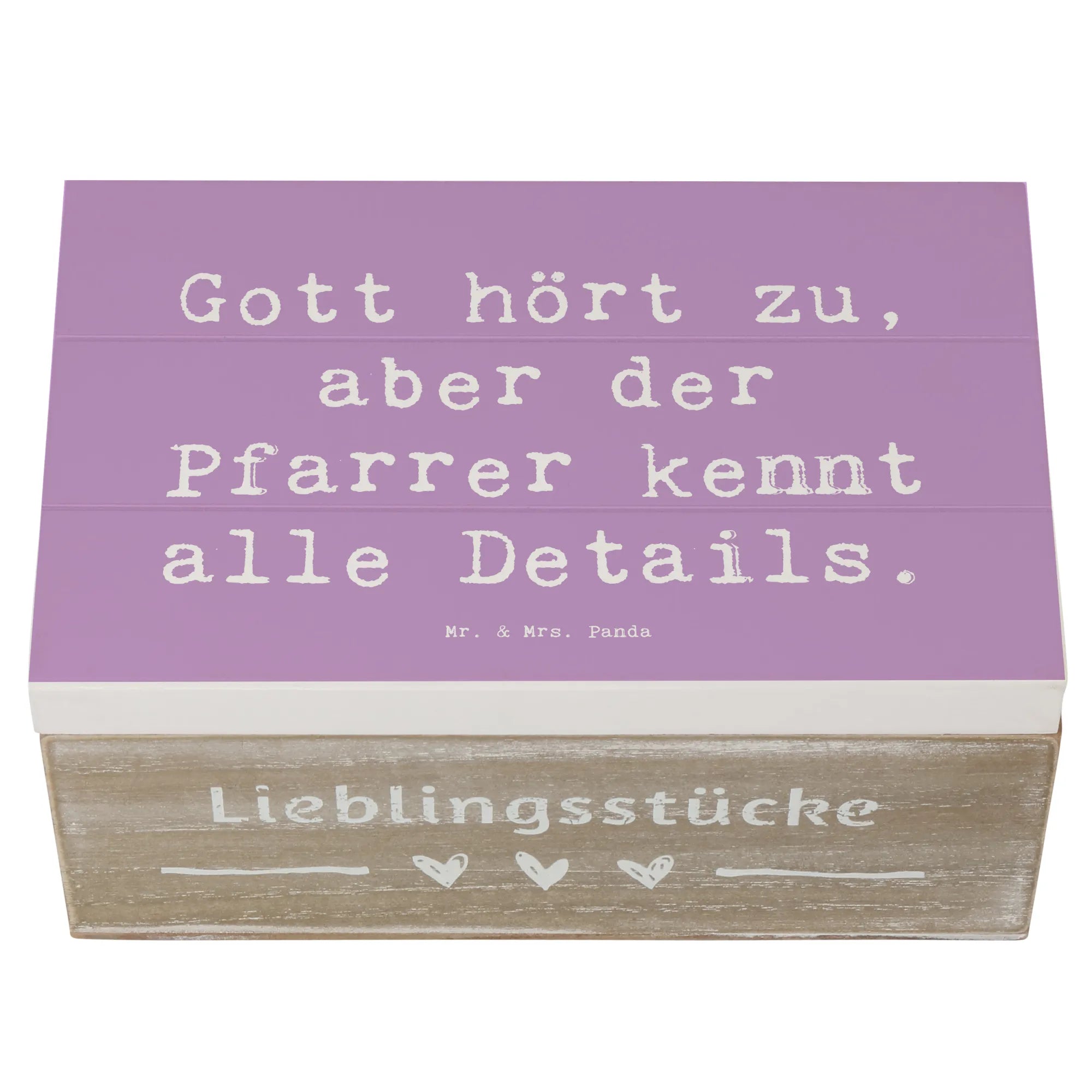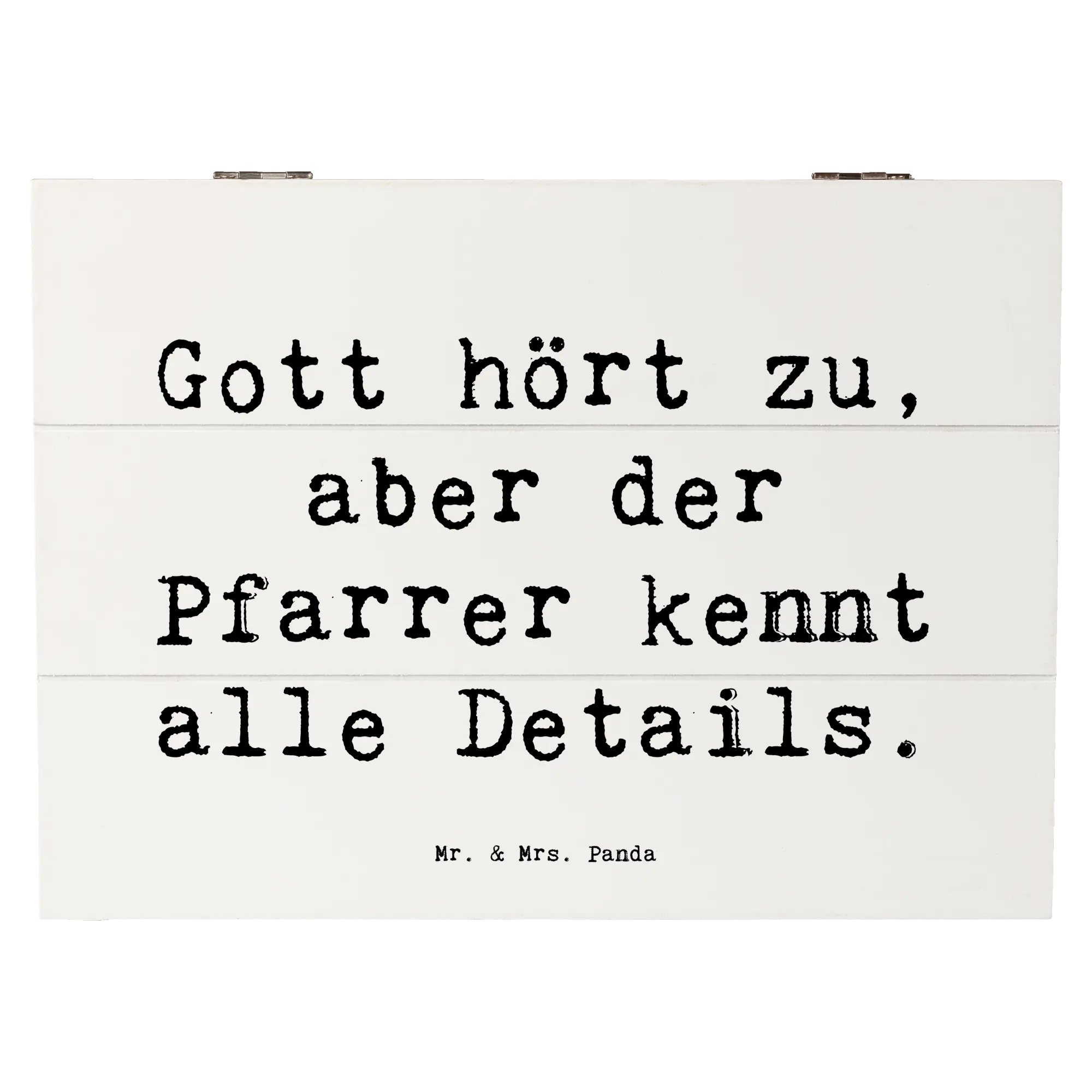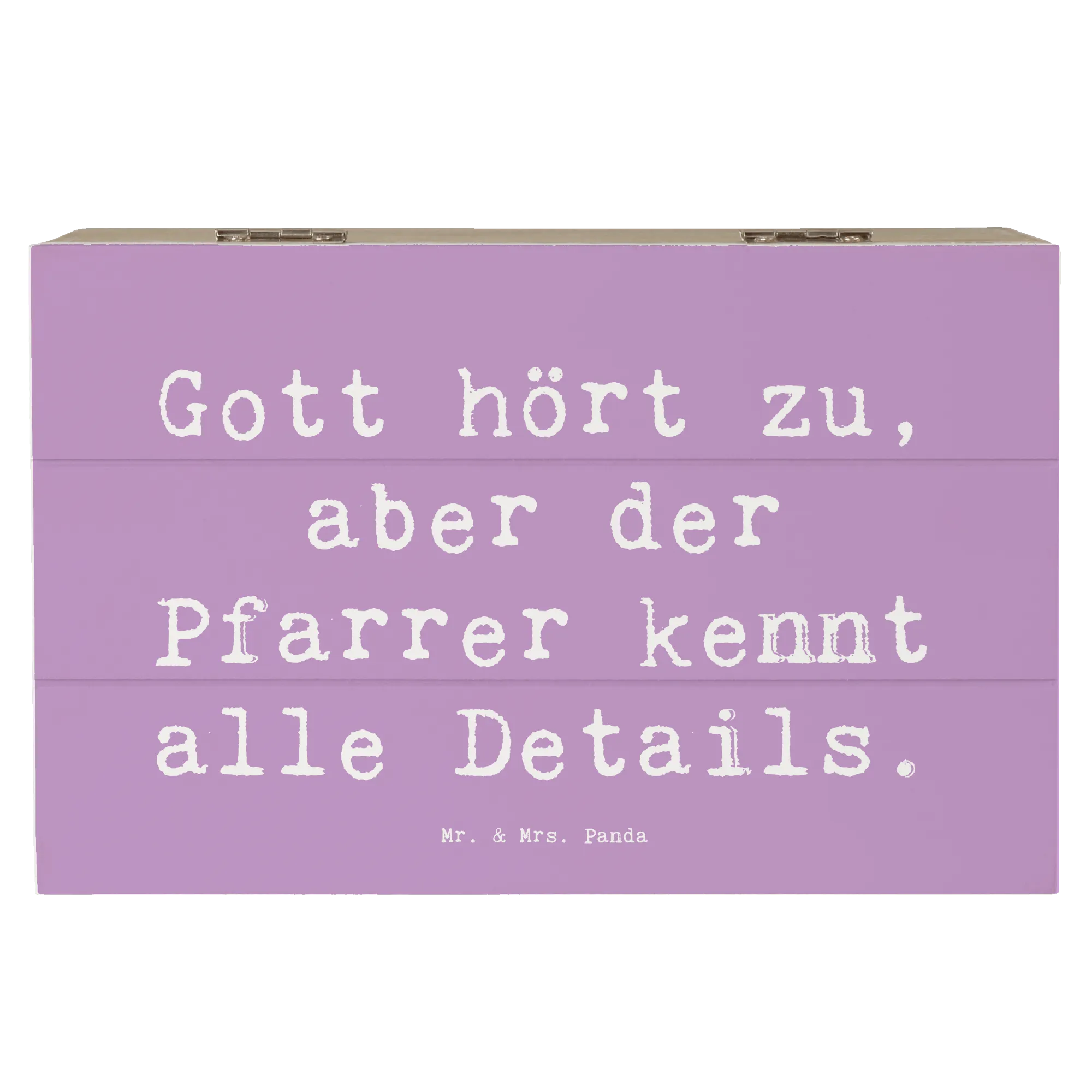 Die Holzkiste "Pfarrer" von Mr. & Mrs. Panda ist das perfekte Geschenk für jeden, der seinen Glauben und seine Berufung liebt. Mit einem liebevoll gestalteten Motiv und dem Spruch "Gott hört zu, aber der Pfarrer kennt alle Details" ist diese Kiste mehr als nur eine Aufbewahrungsbox. Sie wird zum wertvollen Aufbewahrungsort für Erinnerungen und besondere Schätze.