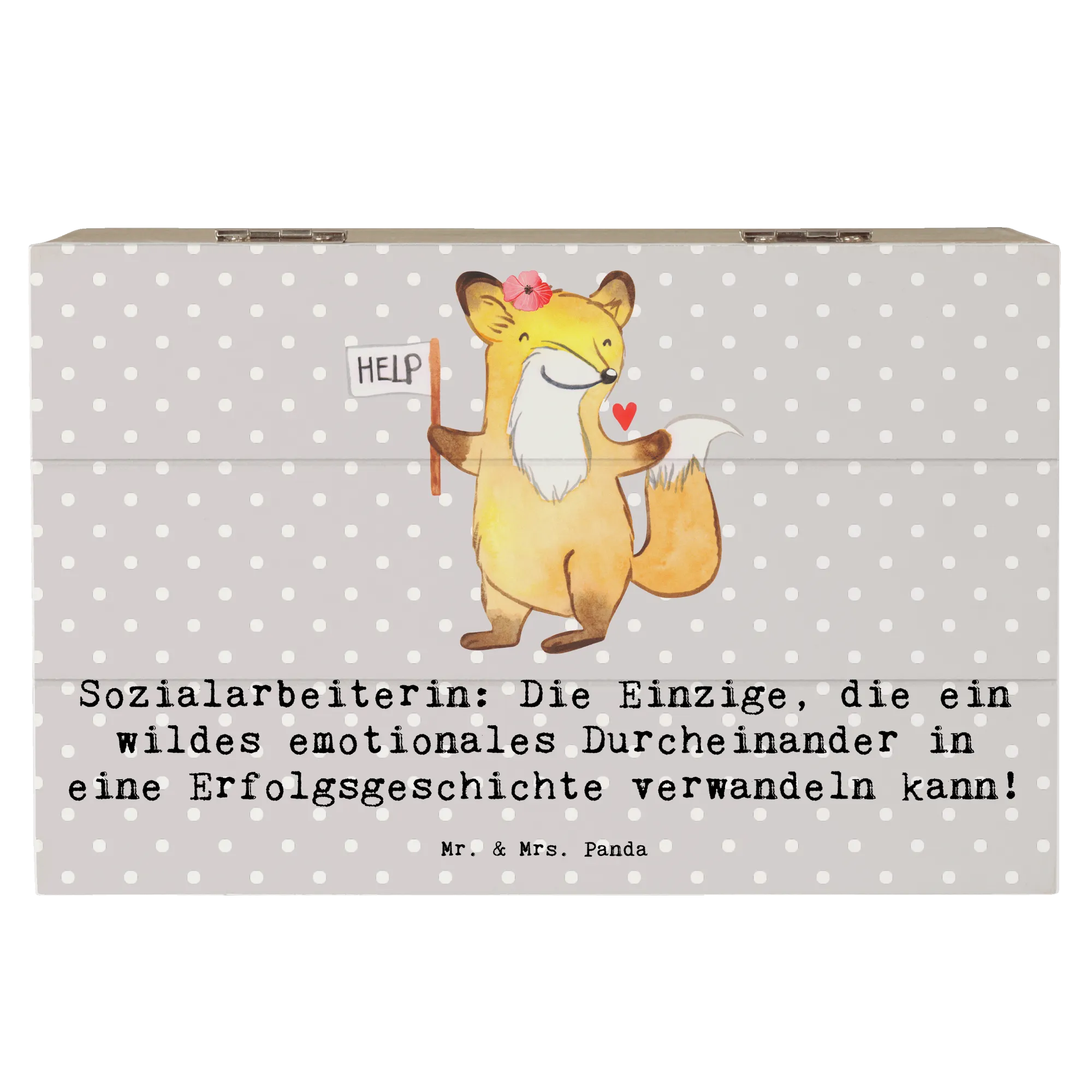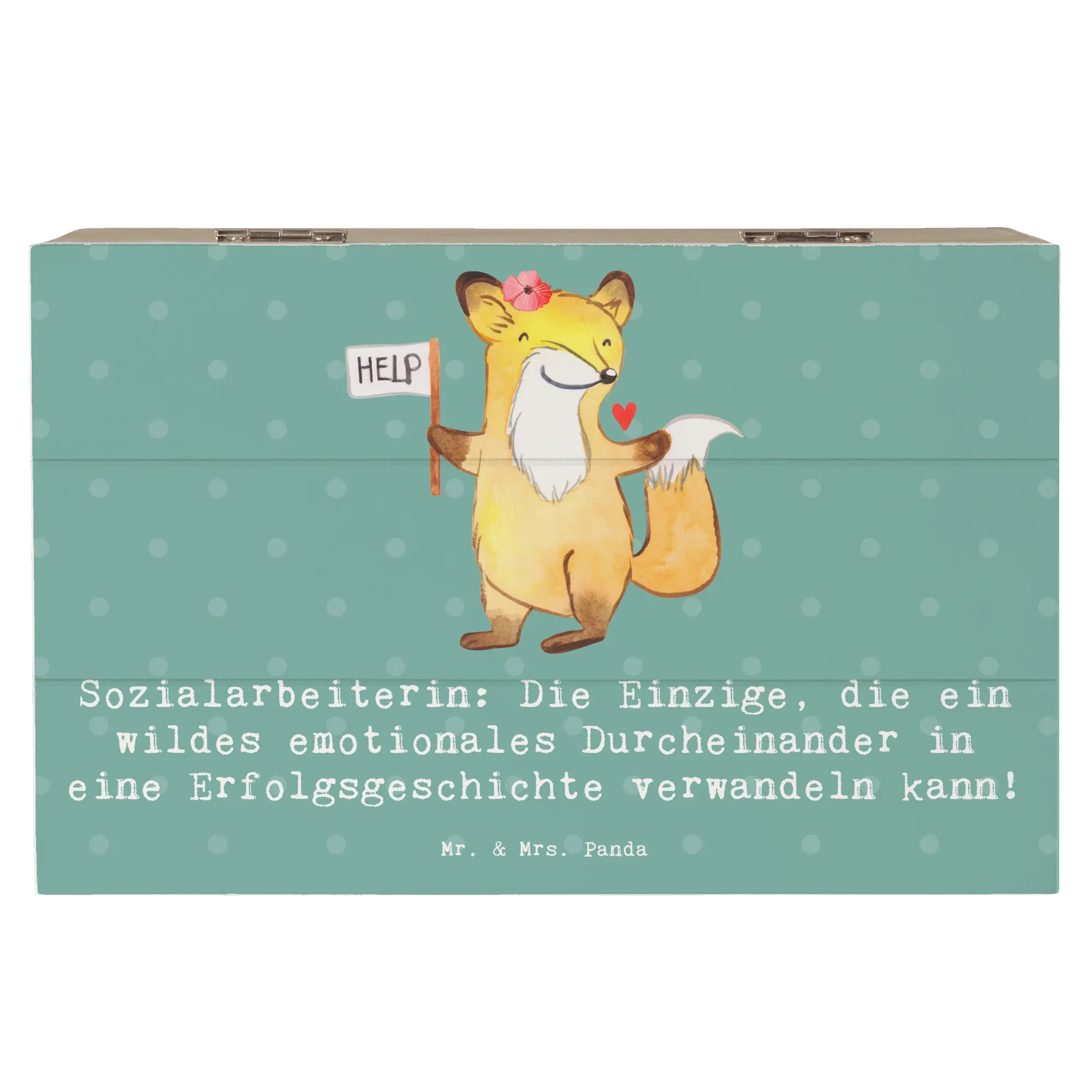 Der liebevoll gestaltete Slogan „Sozialarbeiterin: Die Einzige, die ein wildes emotionales Durcheinander in eine Erfolgsgeschichte verwandeln kann!“ verwandelt die Kiste in eine persönliche Errinnerung an all die positiven Veränderungen, die sie bewirken.