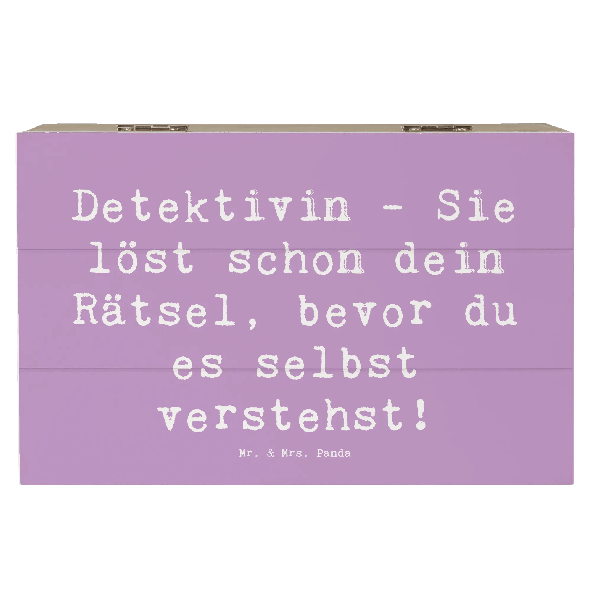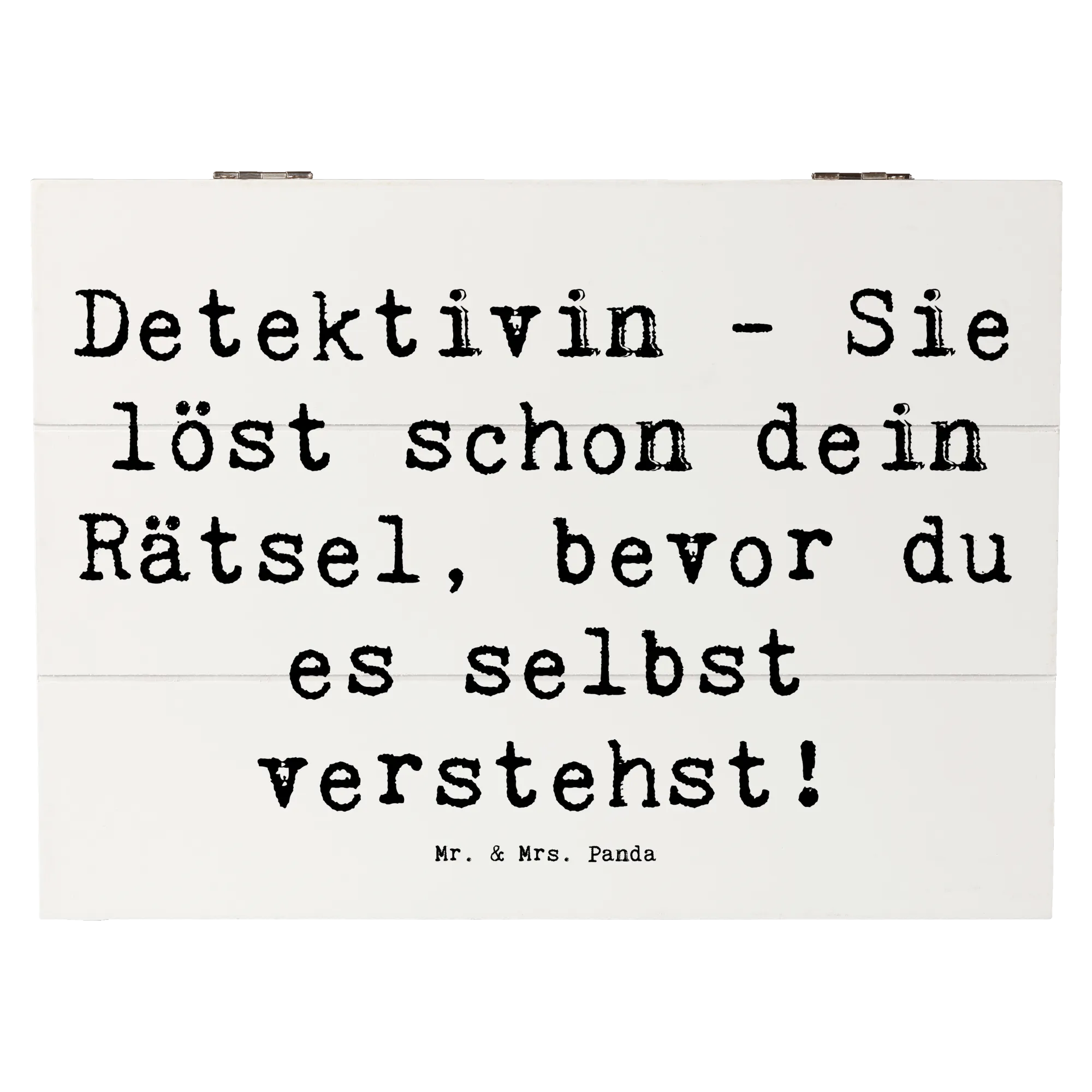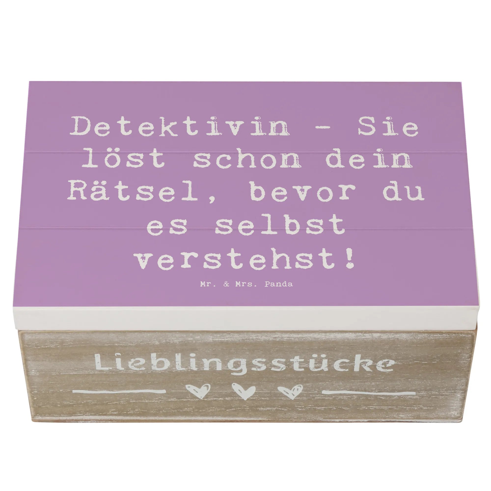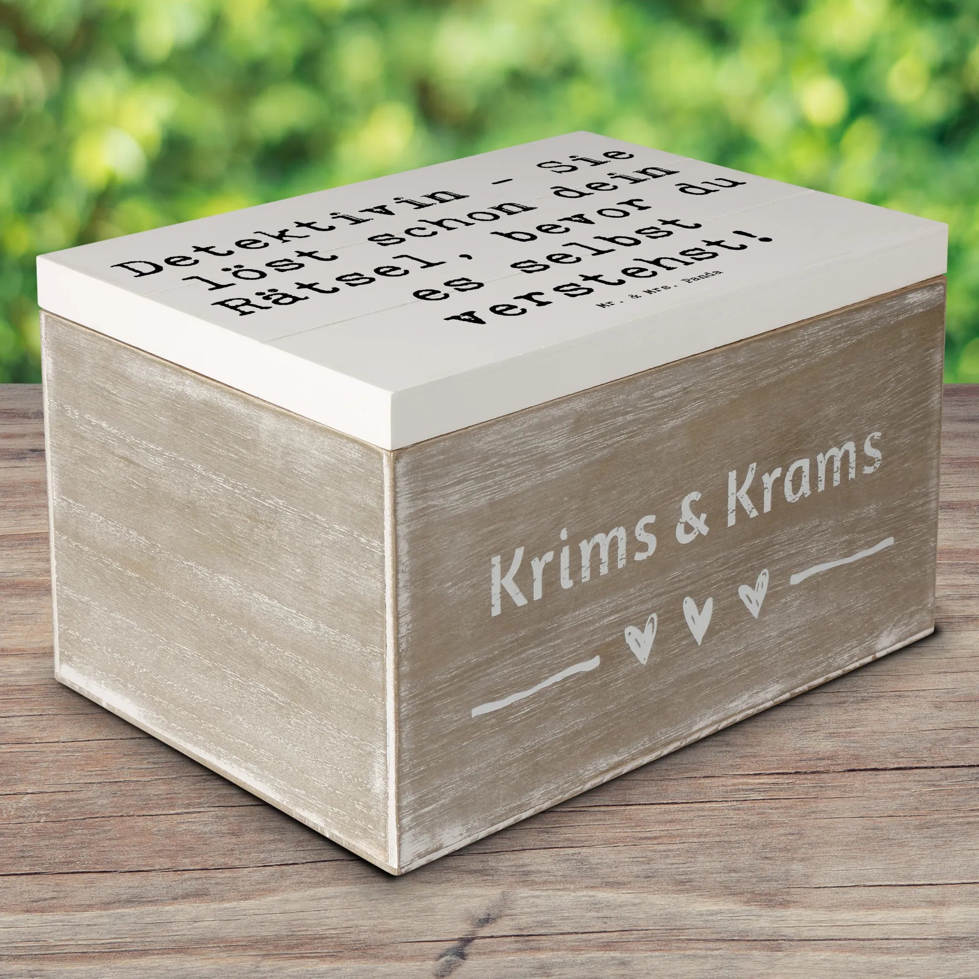 Der Spruch "Detektivin - Sie löst schon dein Rätsel, bevor du es selbst verstehst!" verleiht der Kiste einen charmanten Charakter und macht sie zum idealen Geschenk für alle, die Geheimnisse lieben und gerne rätseln.