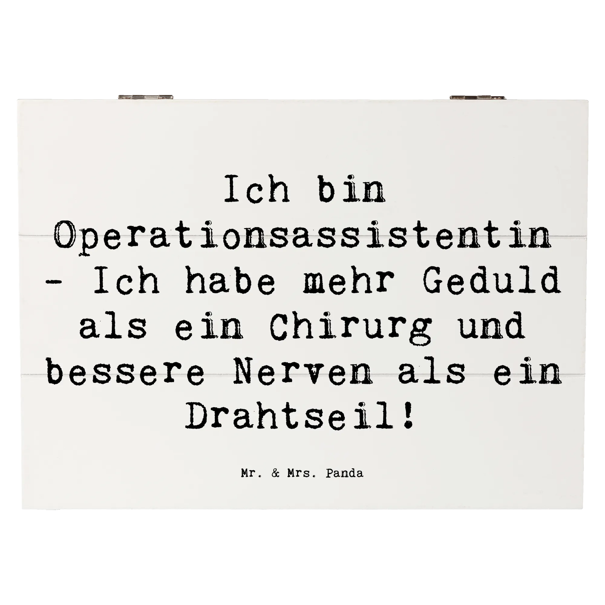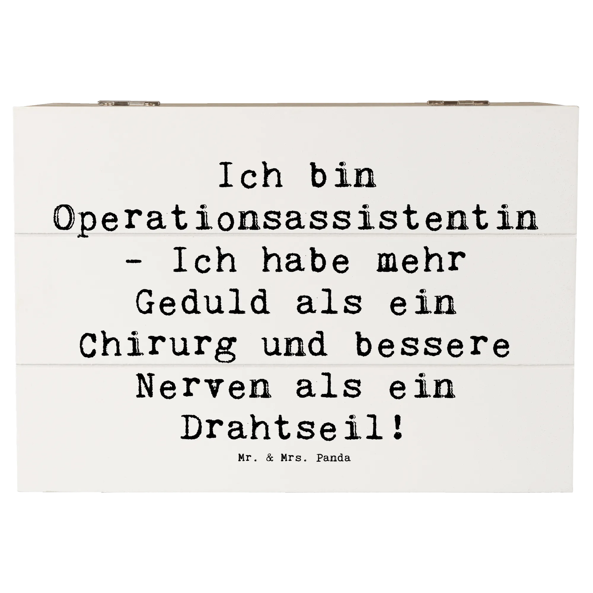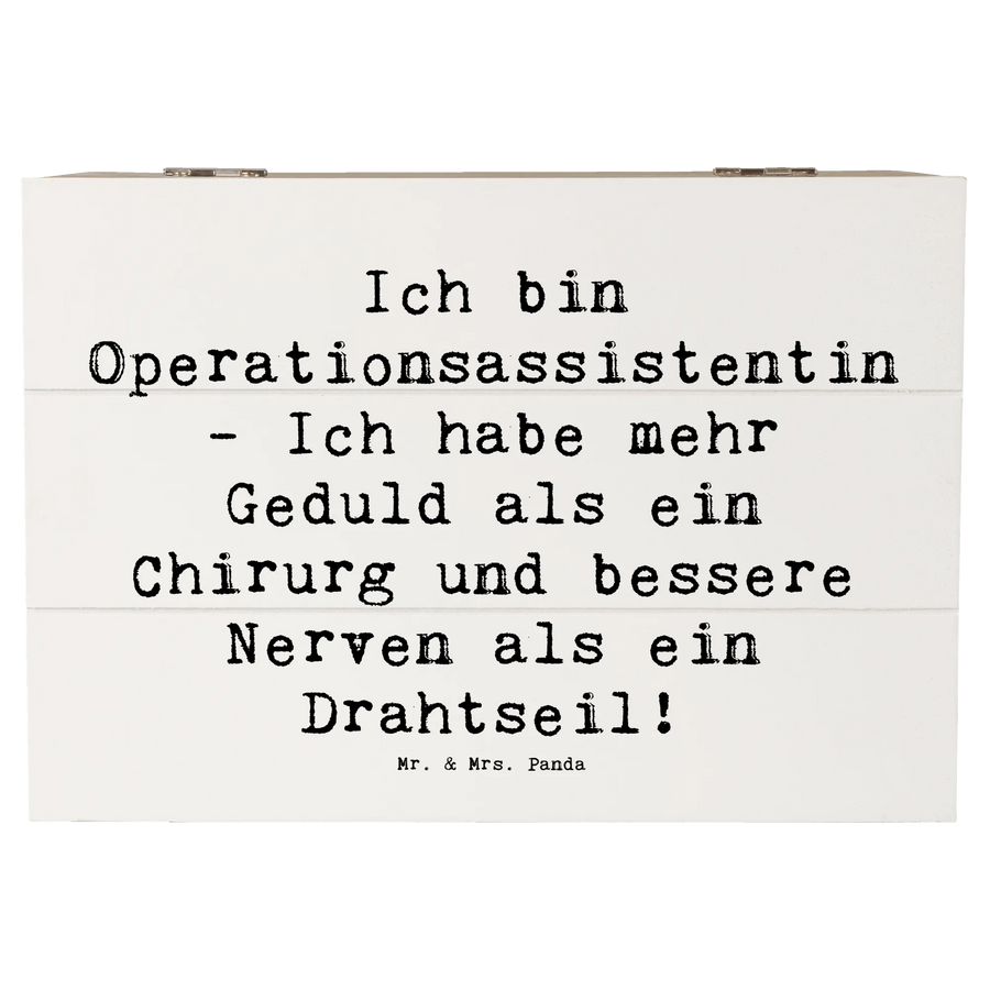 Bist du auf der Suche nach dem perfekten Geschenk für einen Operationsassistenten? Unsere wunderschöne Holzkiste von Mr. & Mrs. Panda ist nicht nur ein praktischer Aufbewahrungsort, sondern auch eine liebevolle Erinnerungskiste, die das Herz höher schlagen lässt! Diese Schatzkiste präsentiert das liebevoll handgezeichnete Motiv "Operationsassistentin" mit dem witzigen Slogan: "Ich bin Operationsassistentin - Ich habe mehr Geduld als ein Chirurg und bessere Nerven als ein Drahtseil!". Ob zur bestandenen Prüfung, zum Hochzeitstag oder einfach als nette Geste zwischendurch – diese Kiste ist ideal, um besondere Erinnerungen sicher aufzubewahren.