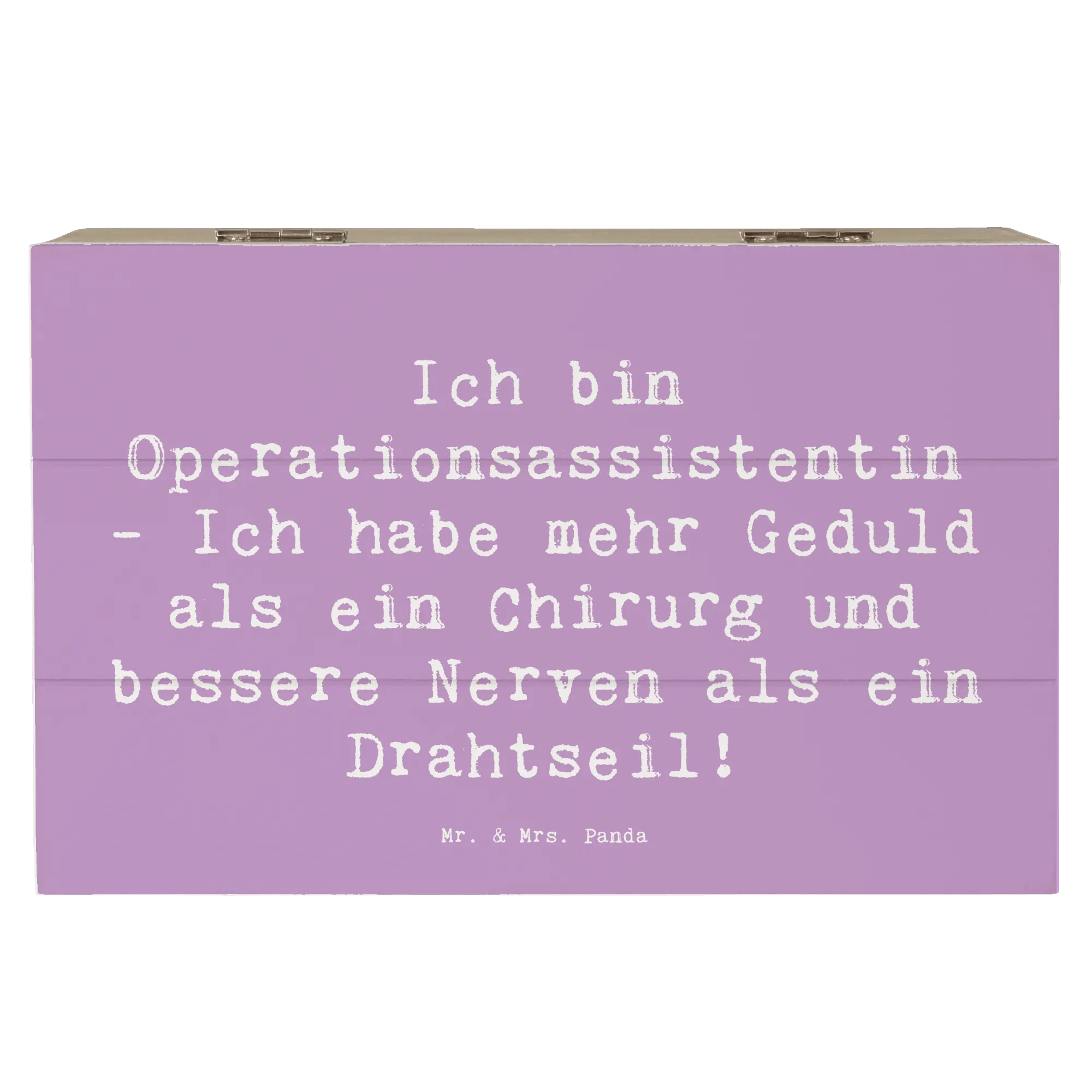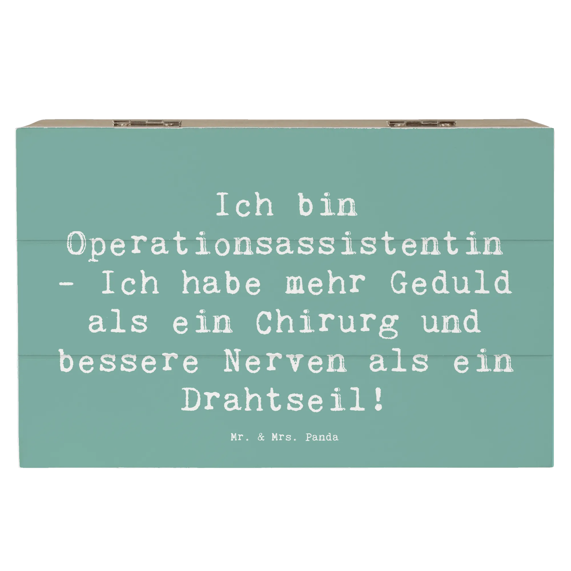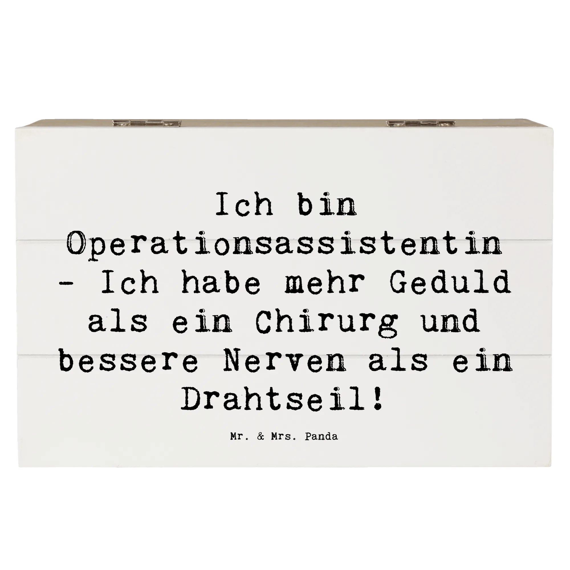 Bist du auf der Suche nach dem perfekten Geschenk für einen Operationsassistenten? Unsere wunderschöne Holzkiste von Mr. & Mrs. Panda ist nicht nur ein praktischer Aufbewahrungsort, sondern auch eine liebevolle Erinnerungskiste, die das Herz höher schlagen lässt! Diese Schatzkiste präsentiert das liebevoll handgezeichnete Motiv "Operationsassistentin" mit dem witzigen Slogan: "Ich bin Operationsassistentin - Ich habe mehr Geduld als ein Chirurg und bessere Nerven als ein Drahtseil!". Ob zur bestandenen Prüfung, zum Hochzeitstag oder einfach als nette Geste zwischendurch – diese Kiste ist ideal, um besondere Erinnerungen sicher aufzubewahren.