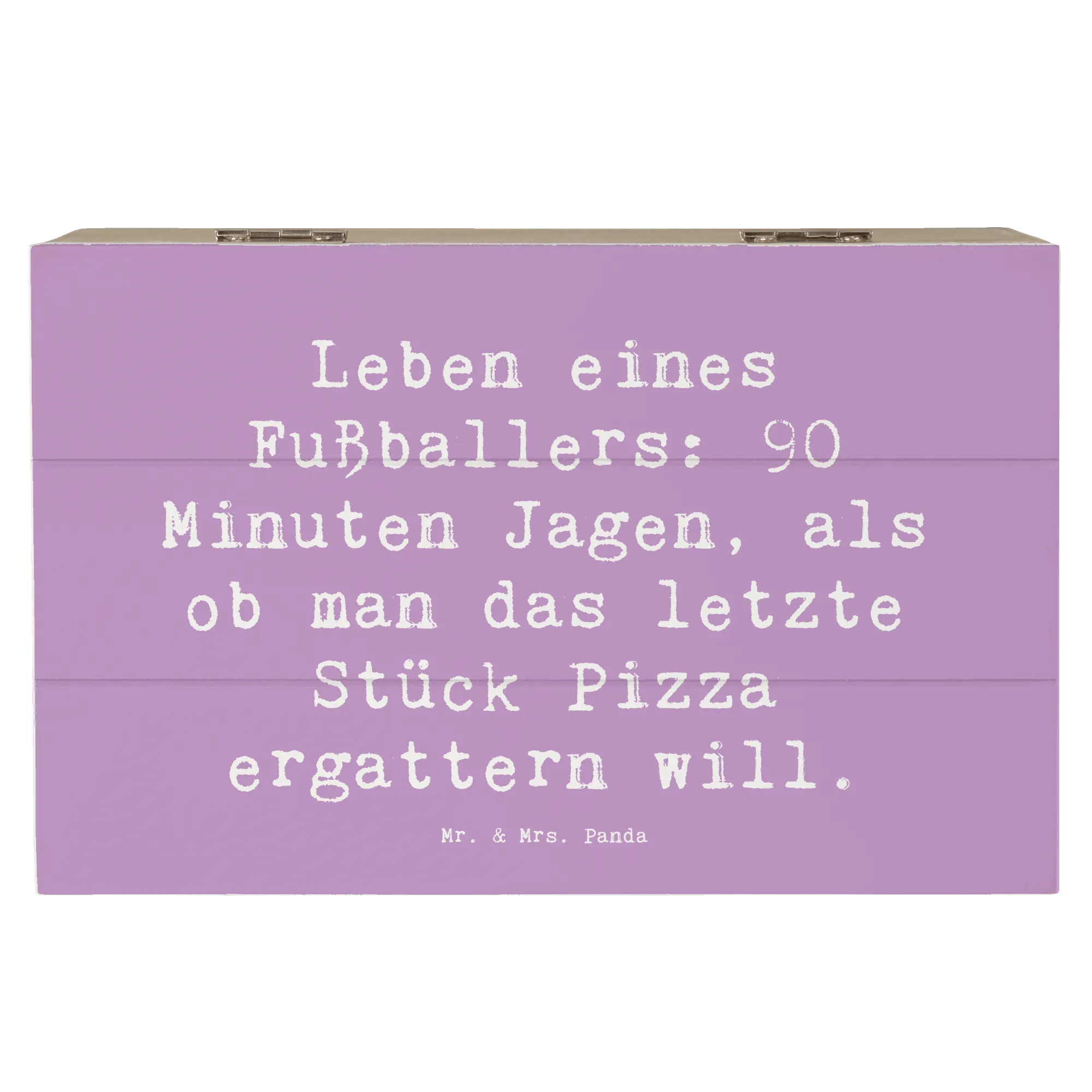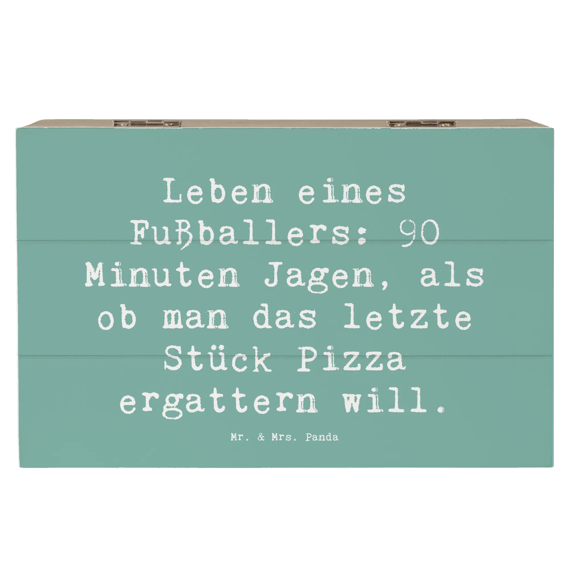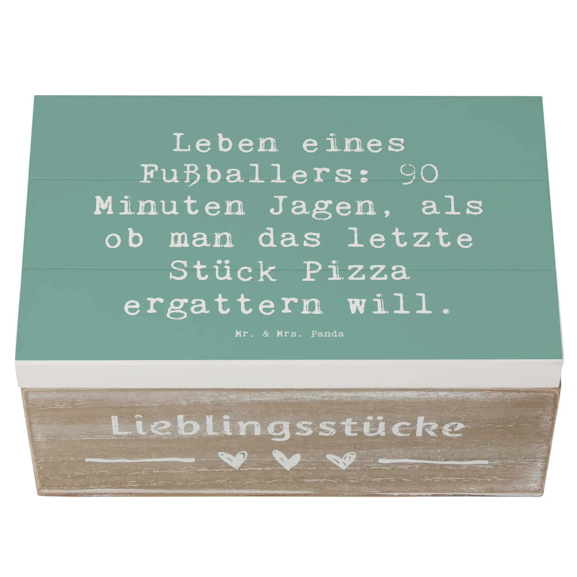 Die Holzkiste Fußballer von Mr. & Mrs. Panda ist das perfekte Geschenk für alle Fußballfans und Sportbegeisterte! Mit dem liebevoll gestalteten Motiv und dem humorvollen Spruch 'Leben eines Fußballers: 90 Minuten Jagen, als ob man das letzte Stück Pizza ergattern will' bringt diese Kiste ein Lächeln auf jedes Gesicht. Egal, ob zum Geburtstag, zu Weihnachten oder als kleines Dankeschön: Diese charmante Schatzkiste eignet sich ideal für besondere Anlässe und wird schnell zum neuen Lieblingsaccessoire.