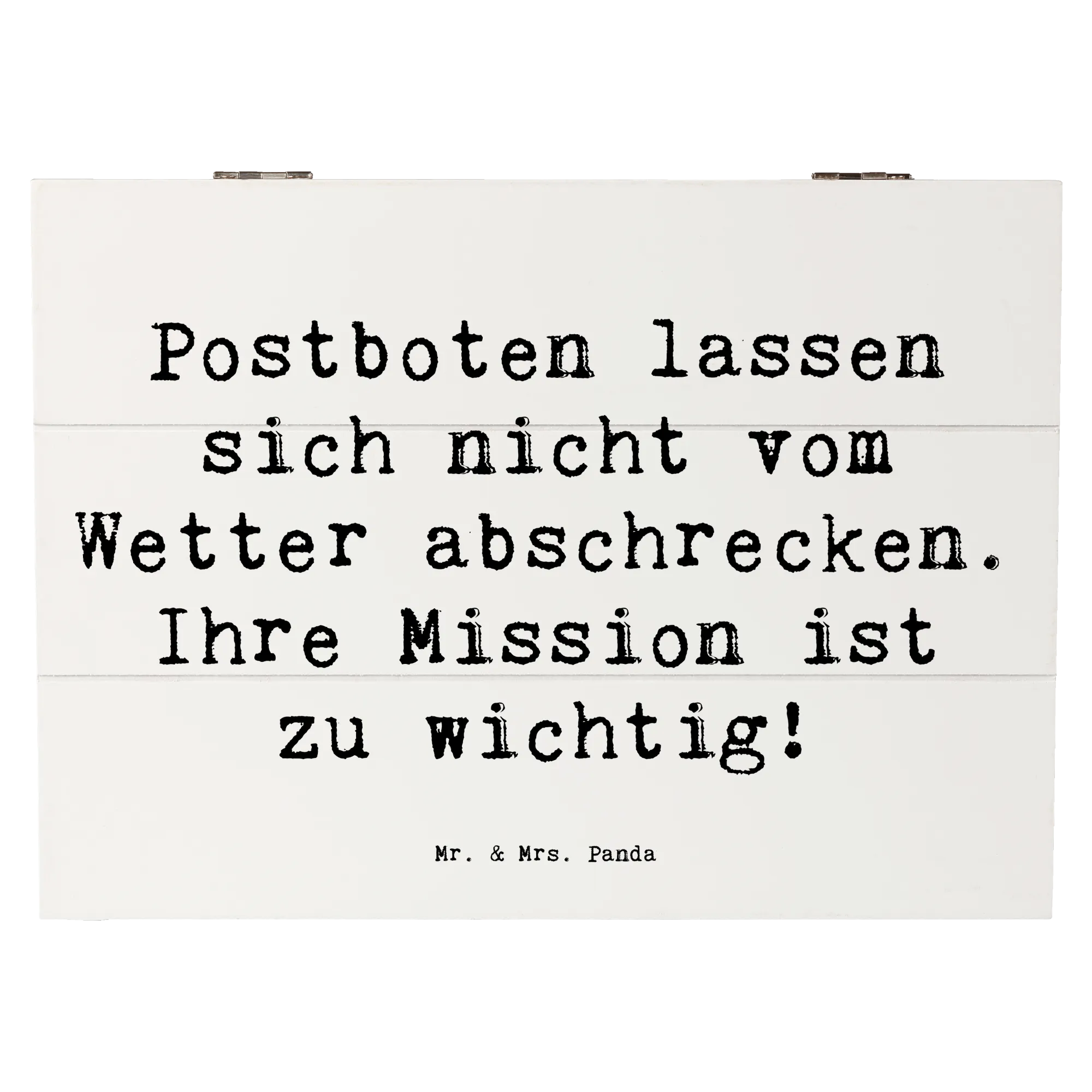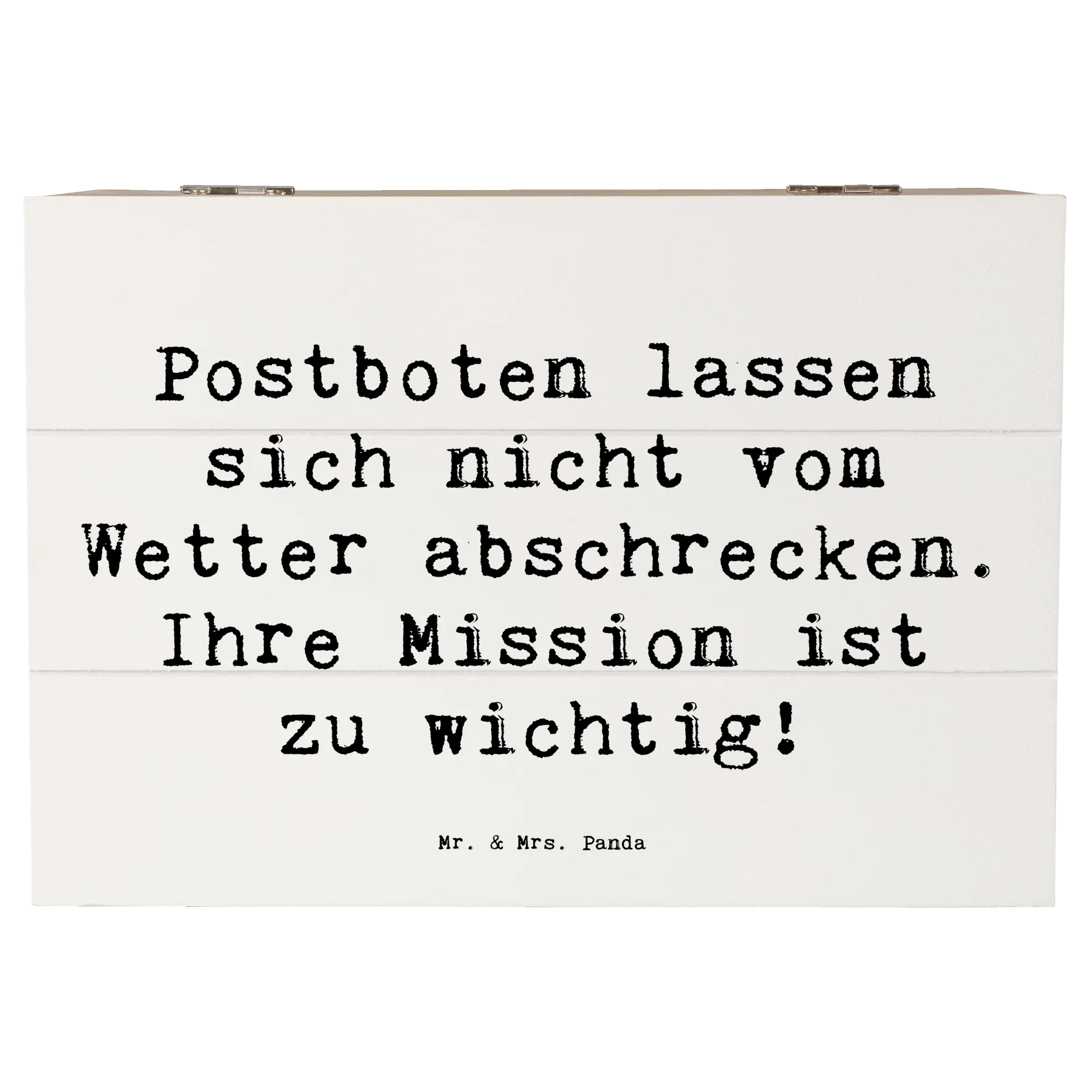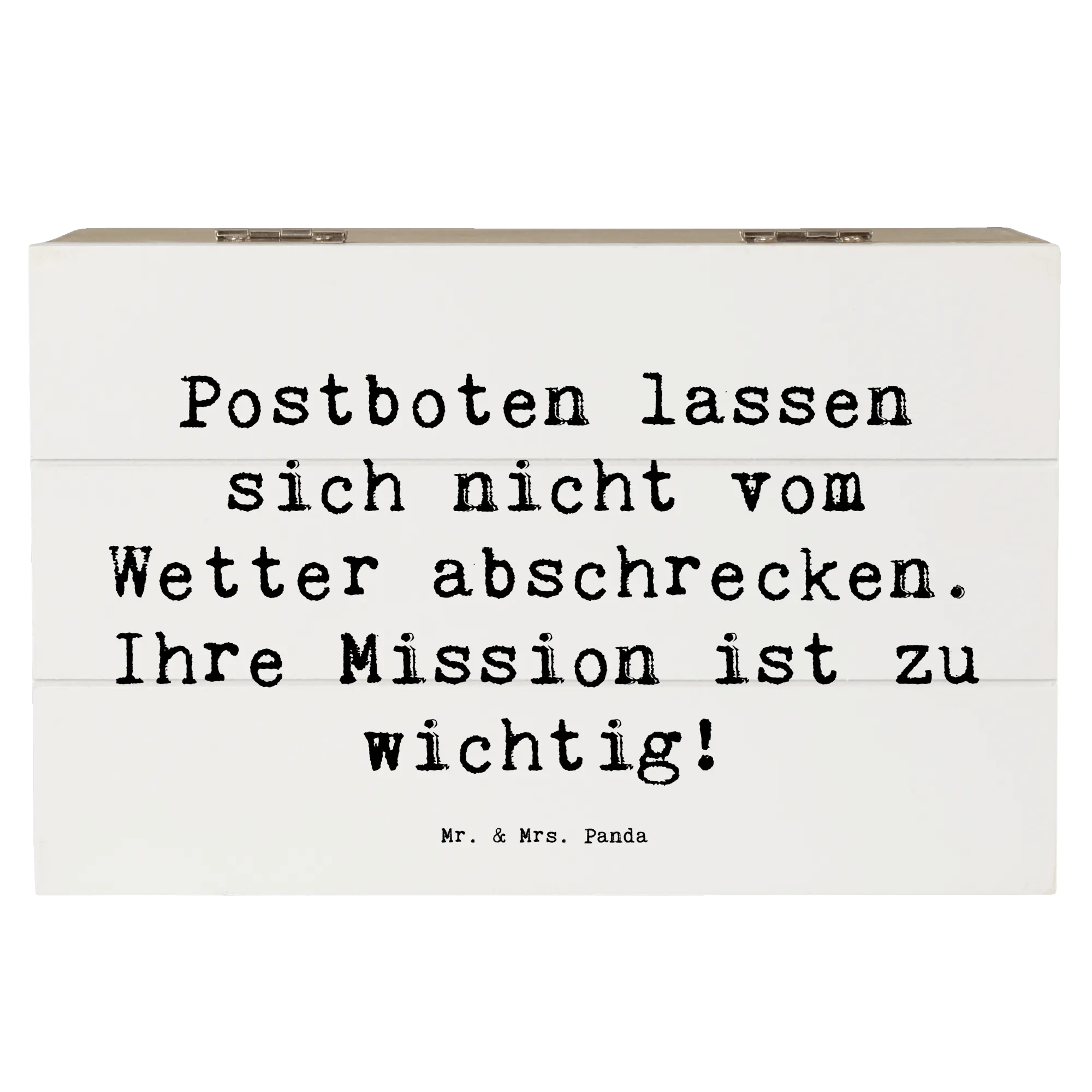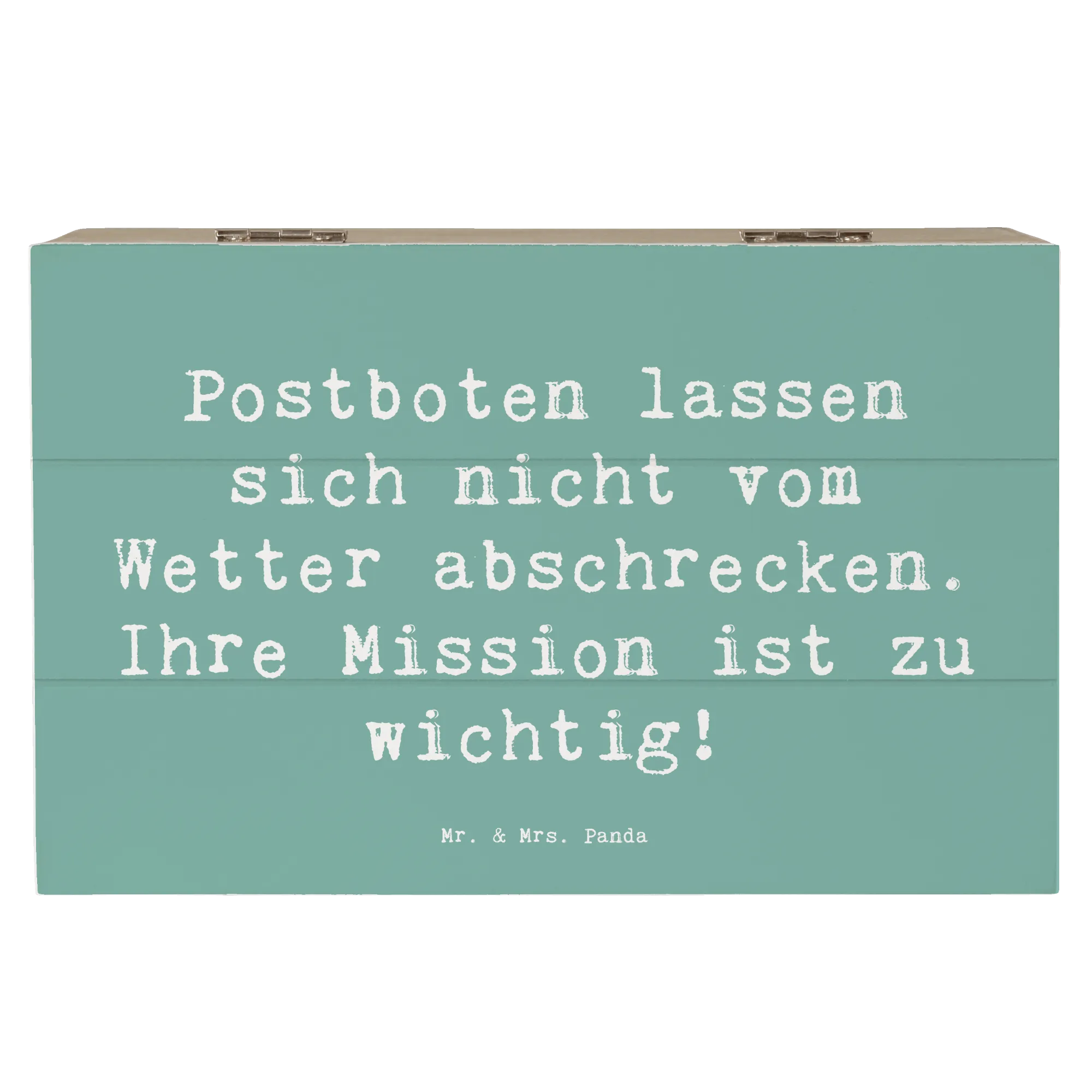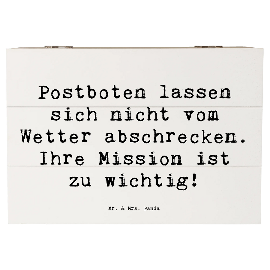 Die Holzkiste "Postbote" von Mr. & Mrs. Panda ist nicht nur eine wunderbare Aufbewahrungsbox, sondern auch ein liebevolles Geschenk für alle, die diesen wichtigen Beruf ausüben. Mit einem inspirierenden Slogan "Postboten lassen sich nicht vom Wetter abschrecken. Ihre Mission ist zu wichtig!" ist diese Kiste ein Blickfang in jedem Zuhause.