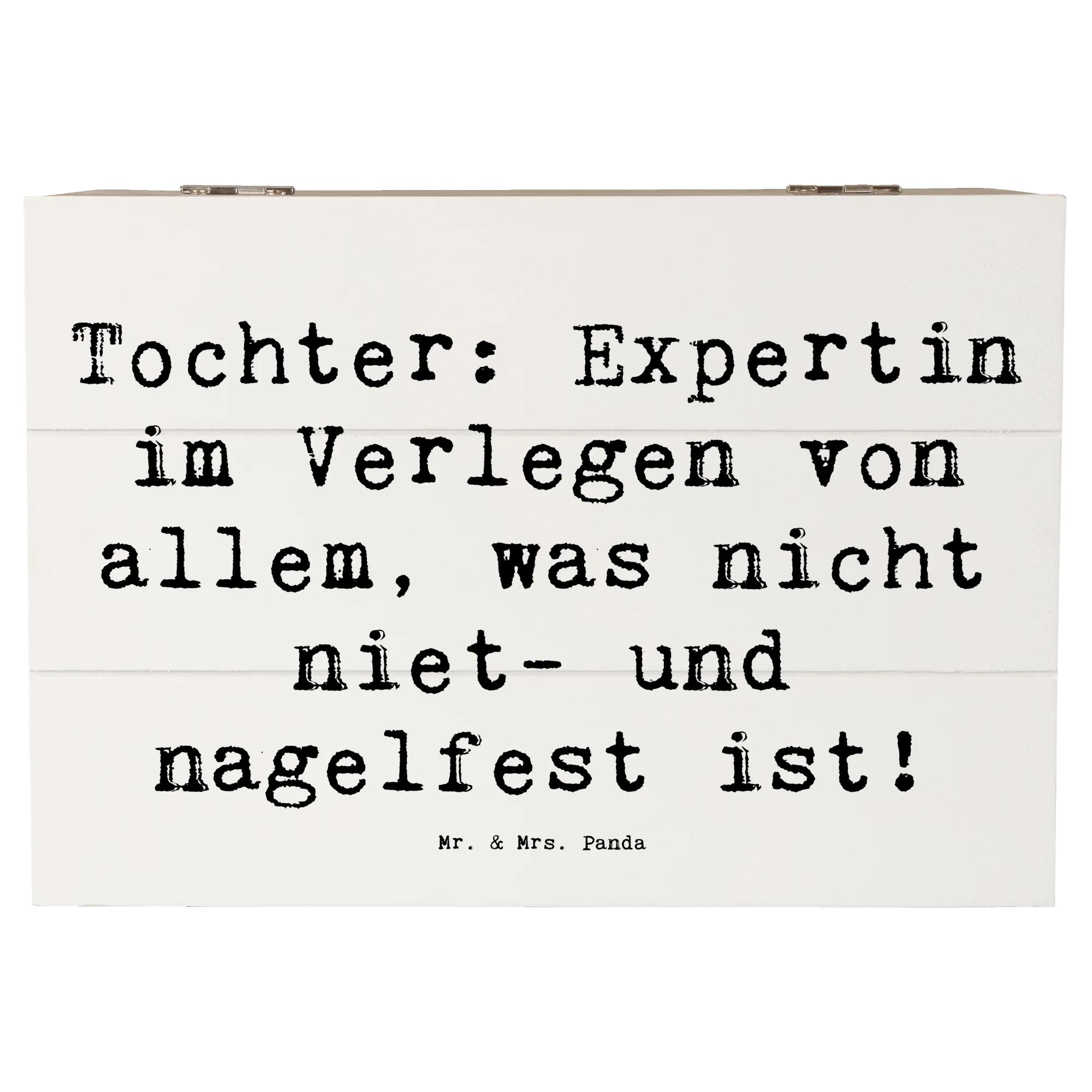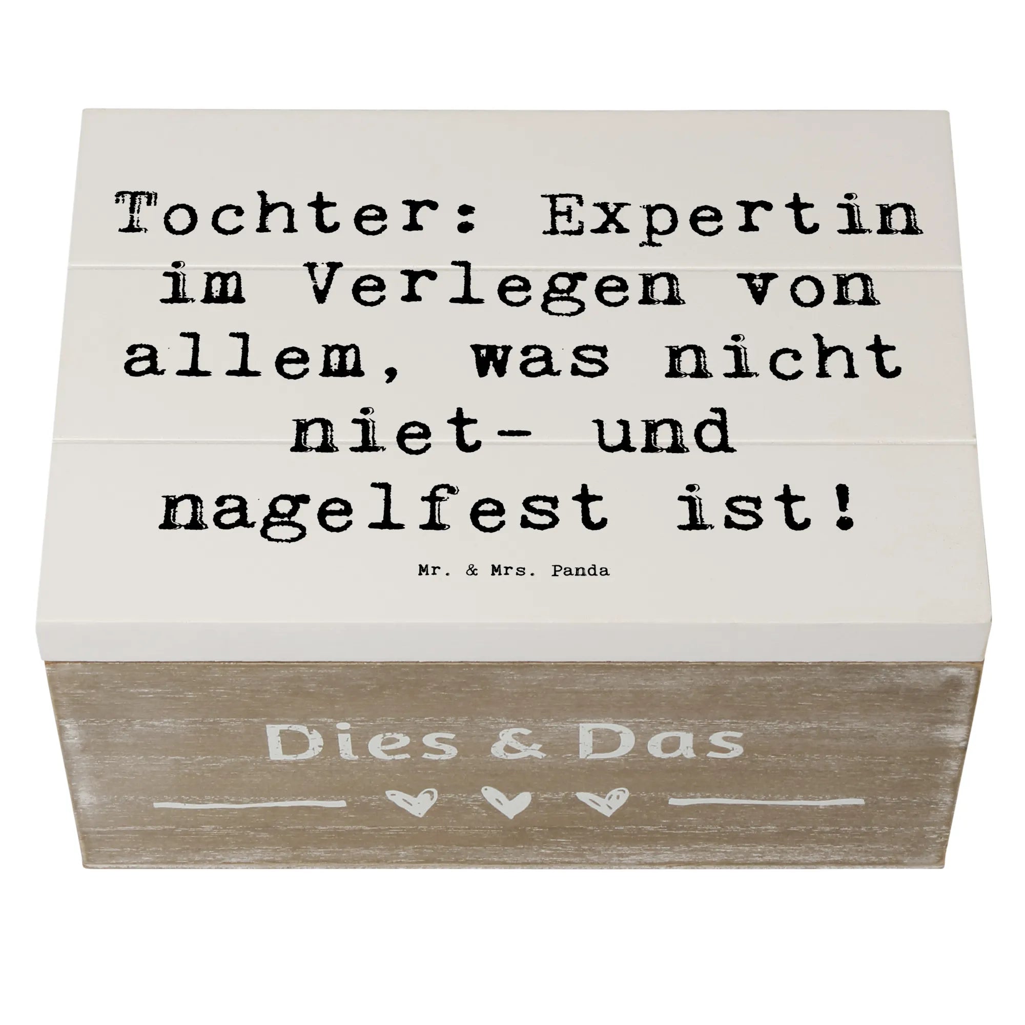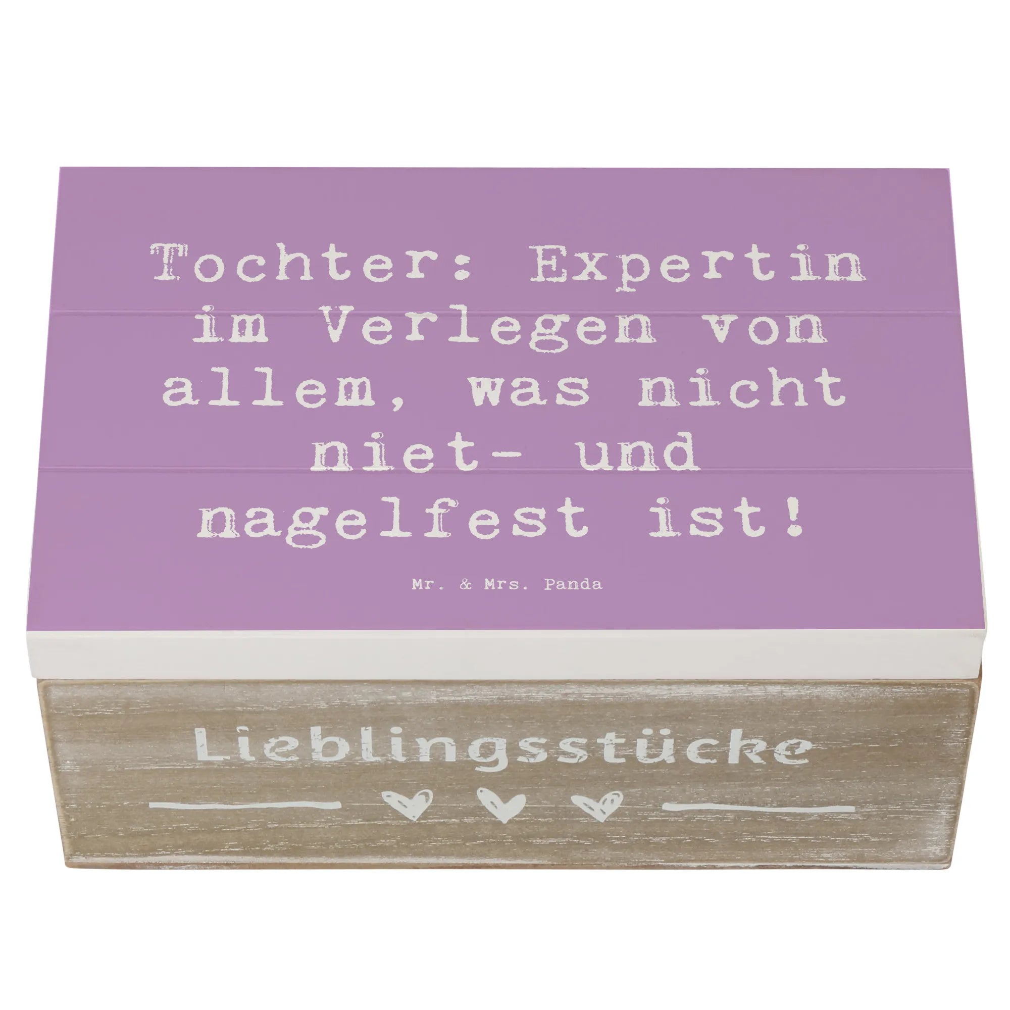 Entdecke die liebevoll gestaltete Holzkiste von Mr. & Mrs. Panda, die das perfekte Geschenk für deine Tochter ist! Diese wunderschöne Erinnerungskiste ist mehr als nur ein Aufbewahrungsort für besondere Schätze – sie ist ein Ort der Freude, des Stolzes und der liebevollen Erinnerungen. Mit dem Spruch 'Tochter: Expertin im Verlegen von allem, was nicht niet- und nagelfest ist!' bringt die Kiste ein Lächeln auf jedes Gesicht.