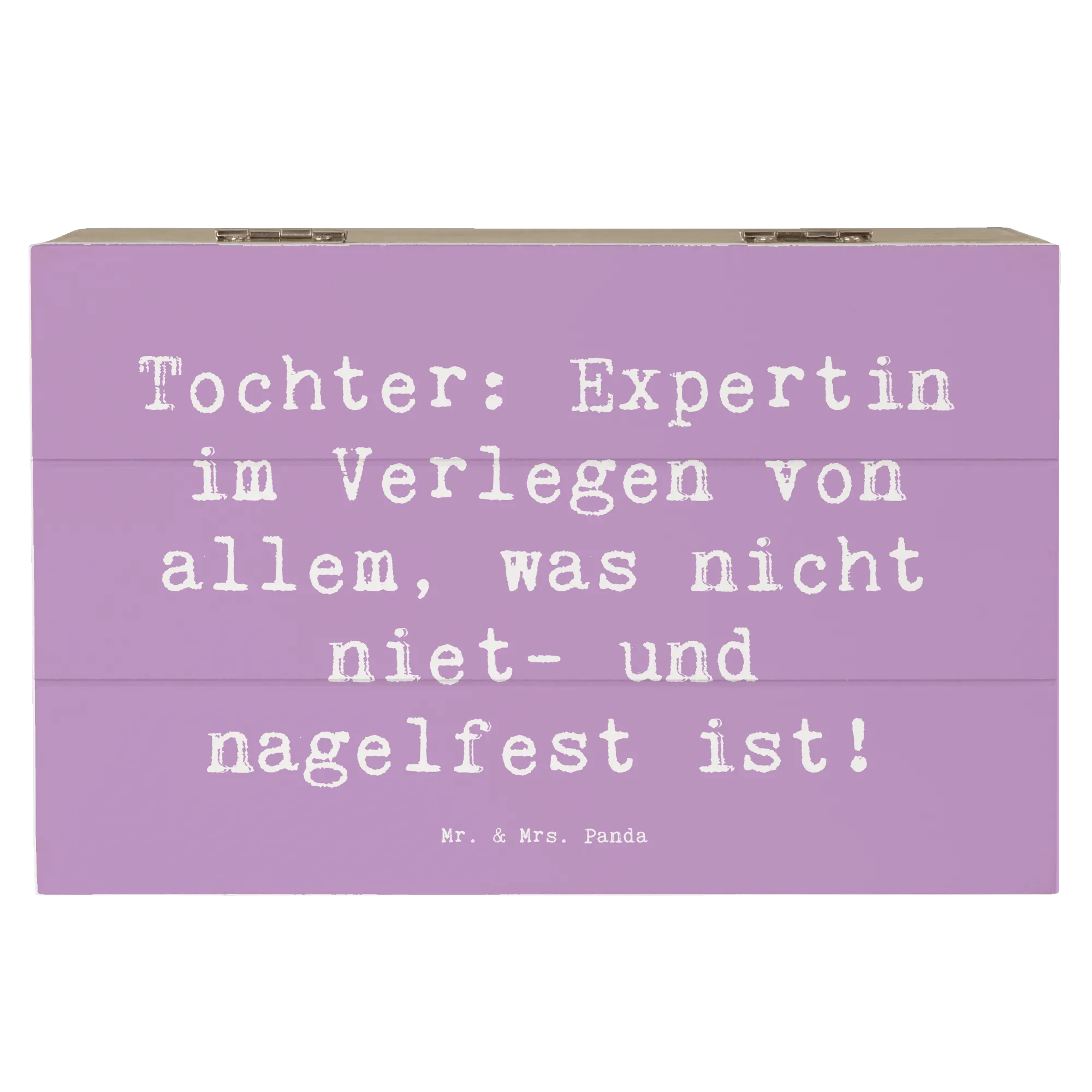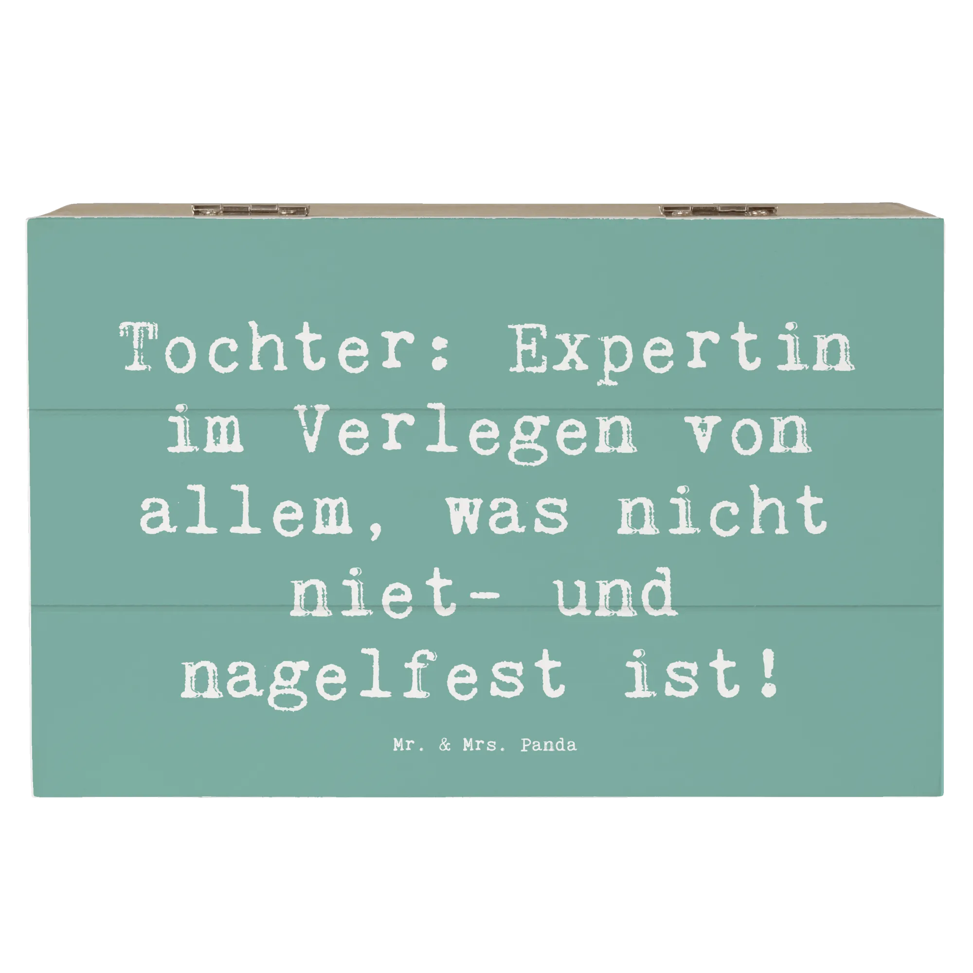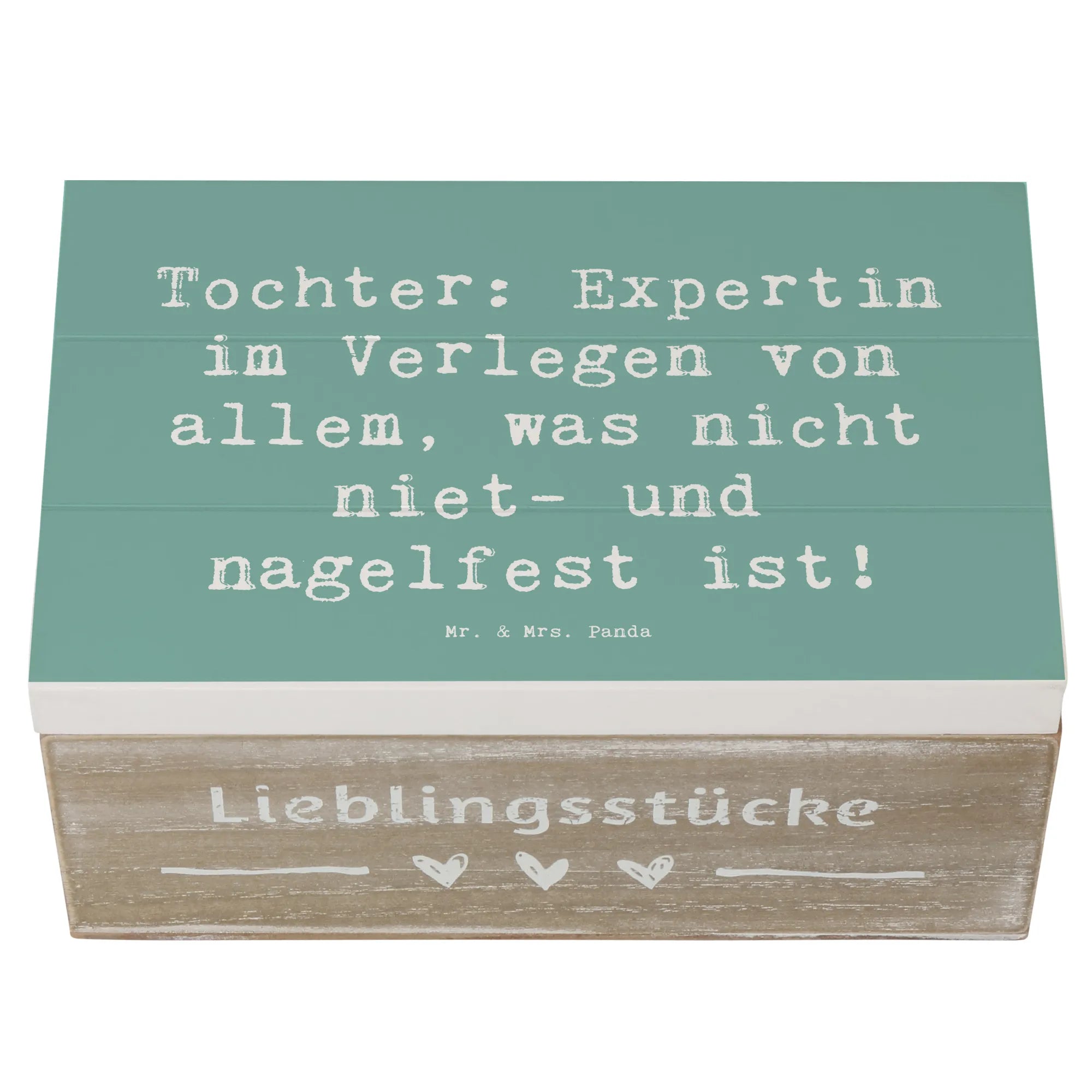 Entdecke die liebevoll gestaltete Holzkiste von Mr. & Mrs. Panda, die das perfekte Geschenk für deine Tochter ist! Diese wunderschöne Erinnerungskiste ist mehr als nur ein Aufbewahrungsort für besondere Schätze – sie ist ein Ort der Freude, des Stolzes und der liebevollen Erinnerungen. Mit dem Spruch 'Tochter: Expertin im Verlegen von allem, was nicht niet- und nagelfest ist!' bringt die Kiste ein Lächeln auf jedes Gesicht.