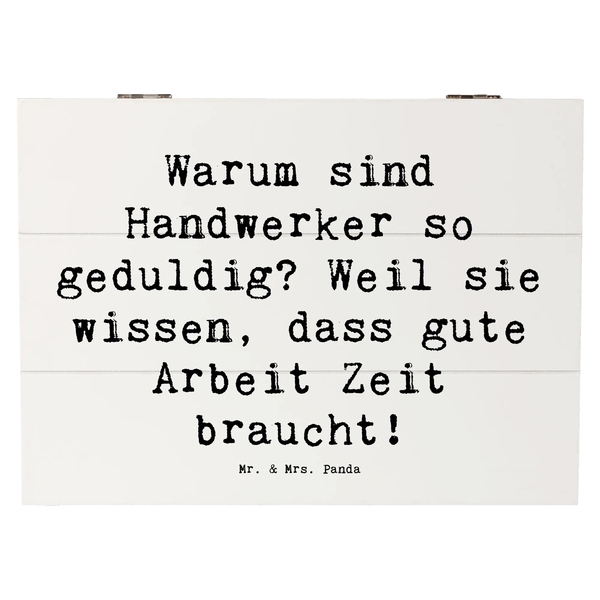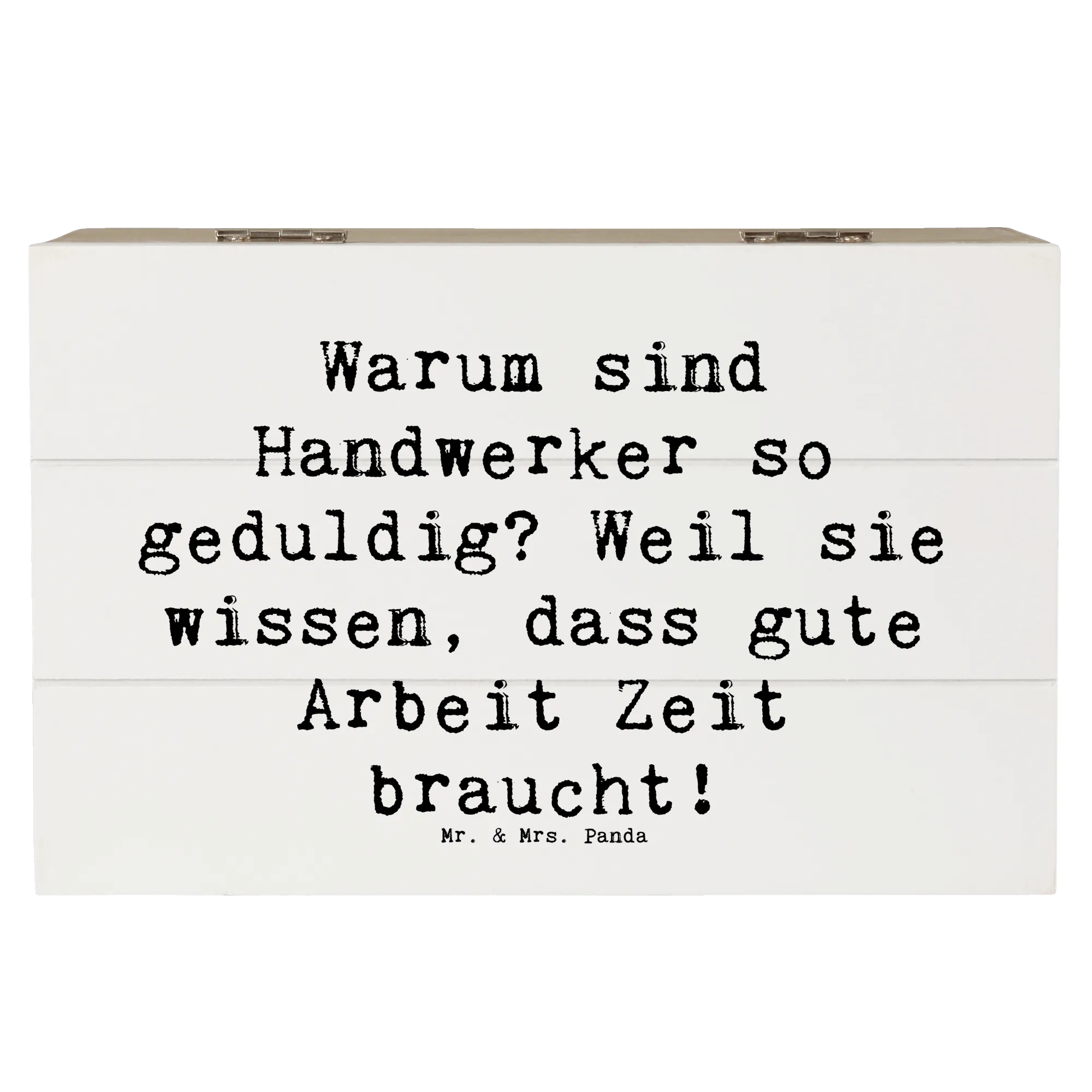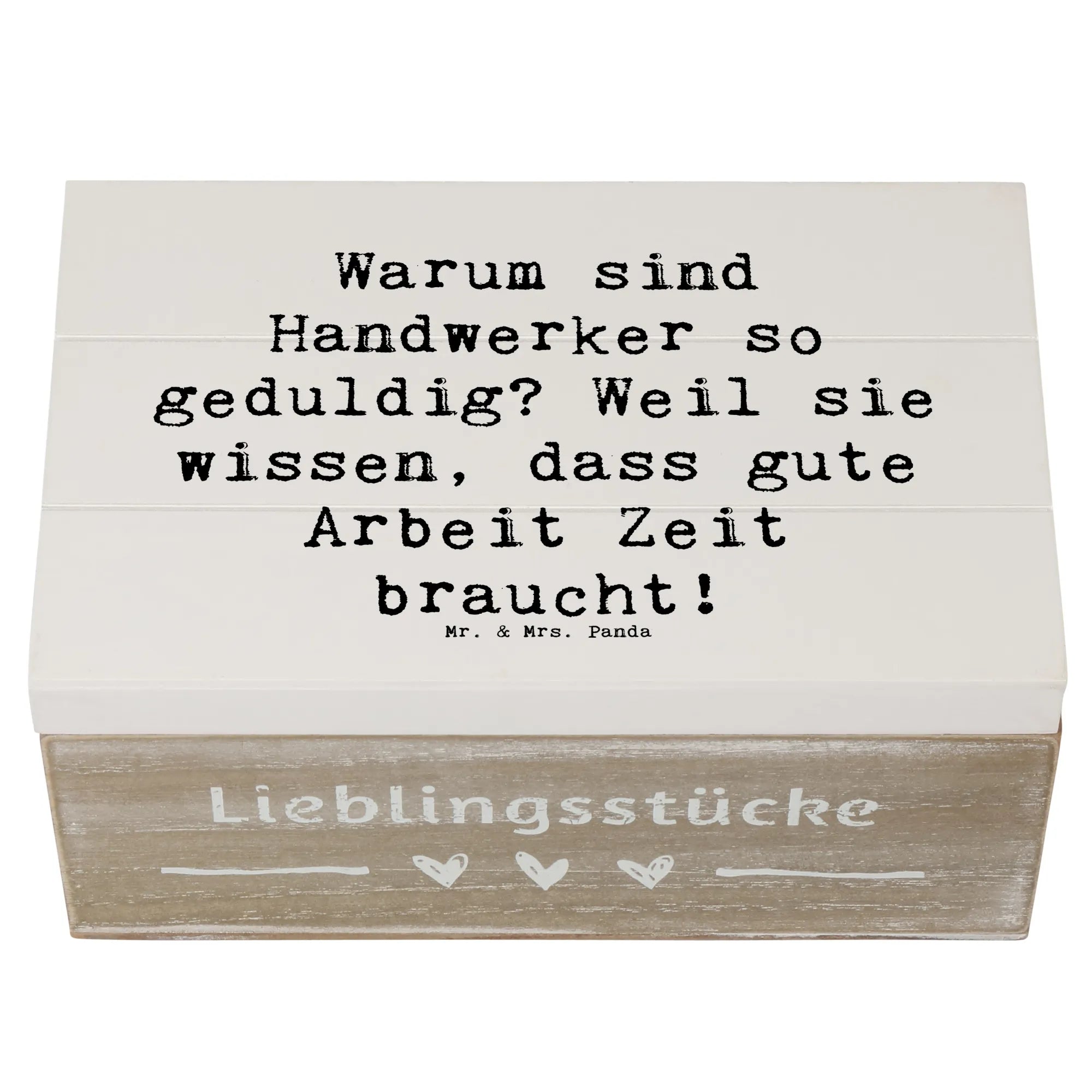 Eine wunderschöne Holzkiste von Mr. & Mrs. Panda – mehr als nur Ordnung: sie ist ein liebevolles Geschenk, das Geschichten bewahrt. Unsere Holzkiste aus der Kollektion „Berufe“ trägt das charmante Handwerker-Motiv mit dem Spruch: „Warum sind Handwerker so geduldig? Weil sie wissen, dass gute Arbeit Zeit braucht!“ – liebevoll von Mrs. Panda handgezeichnet.