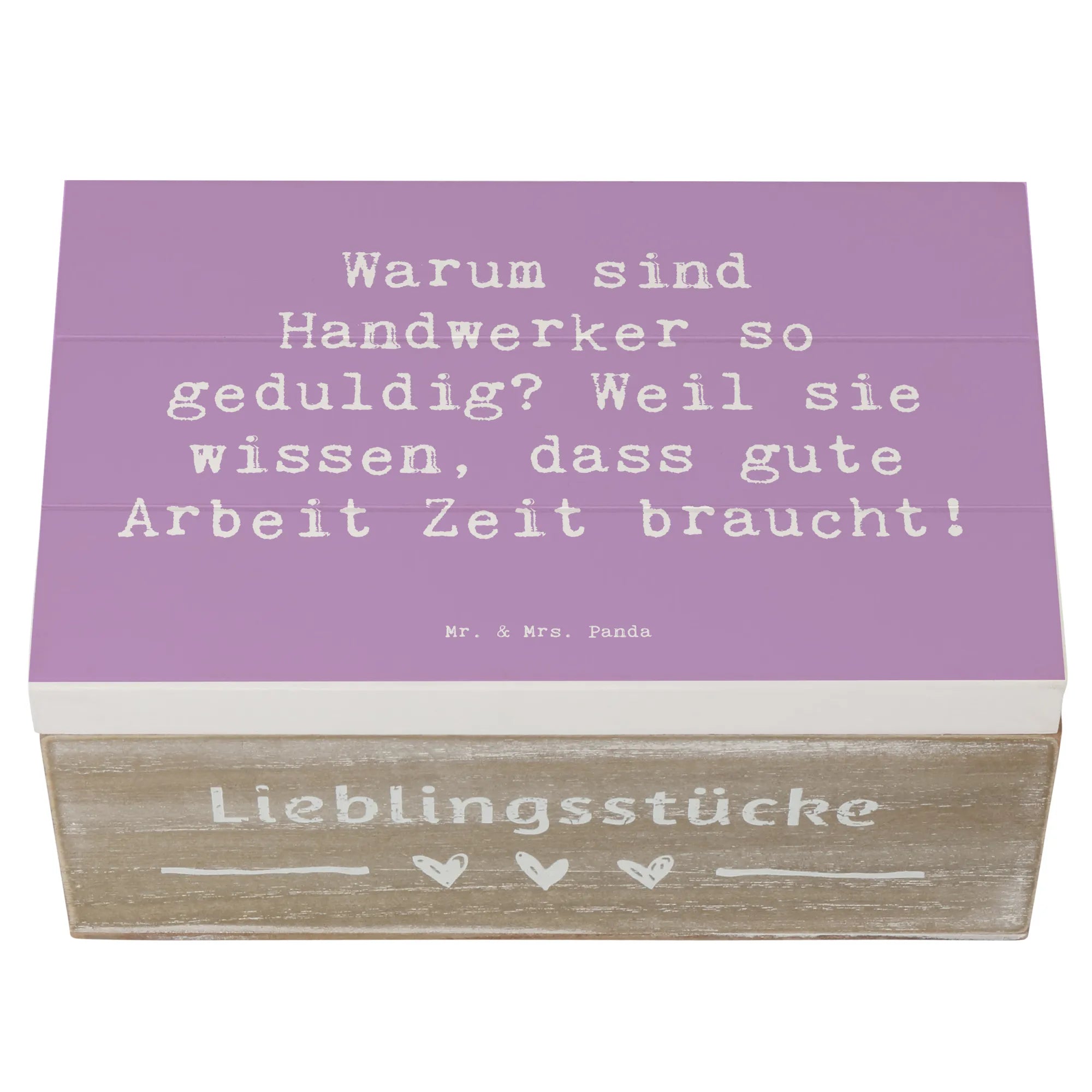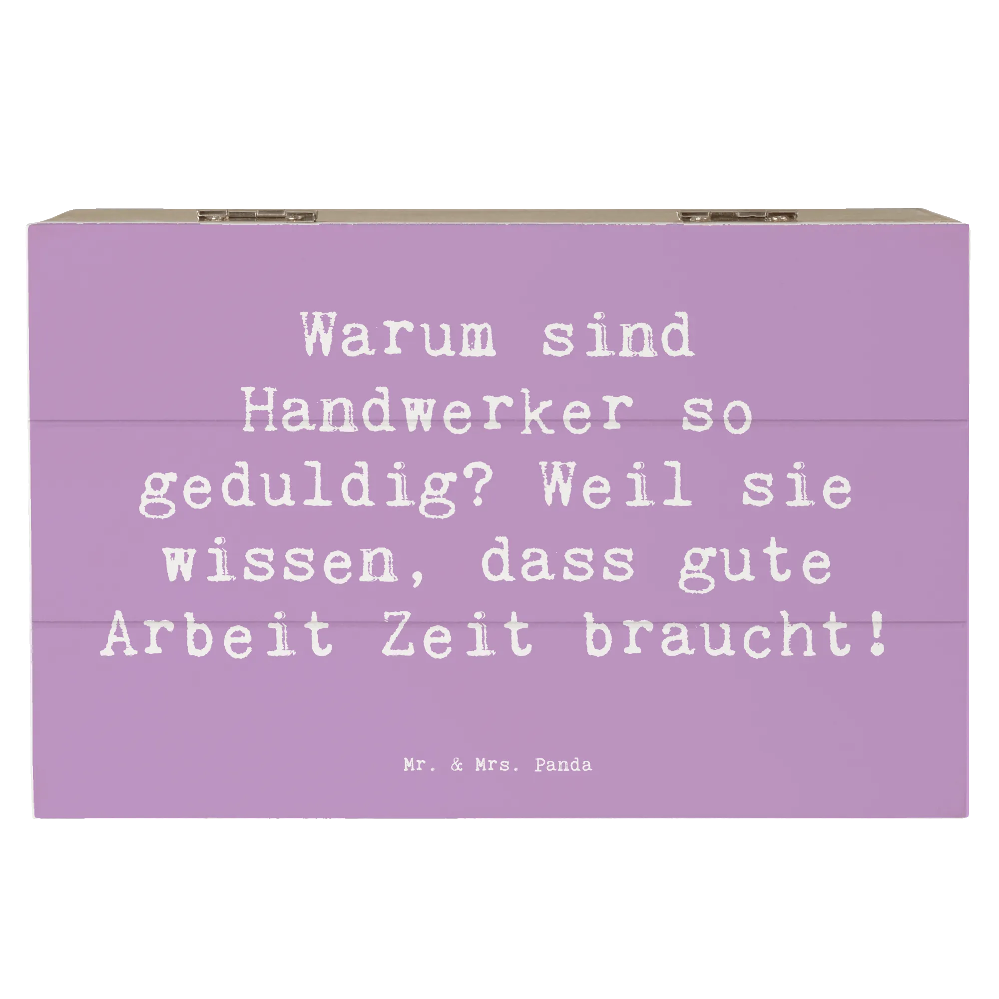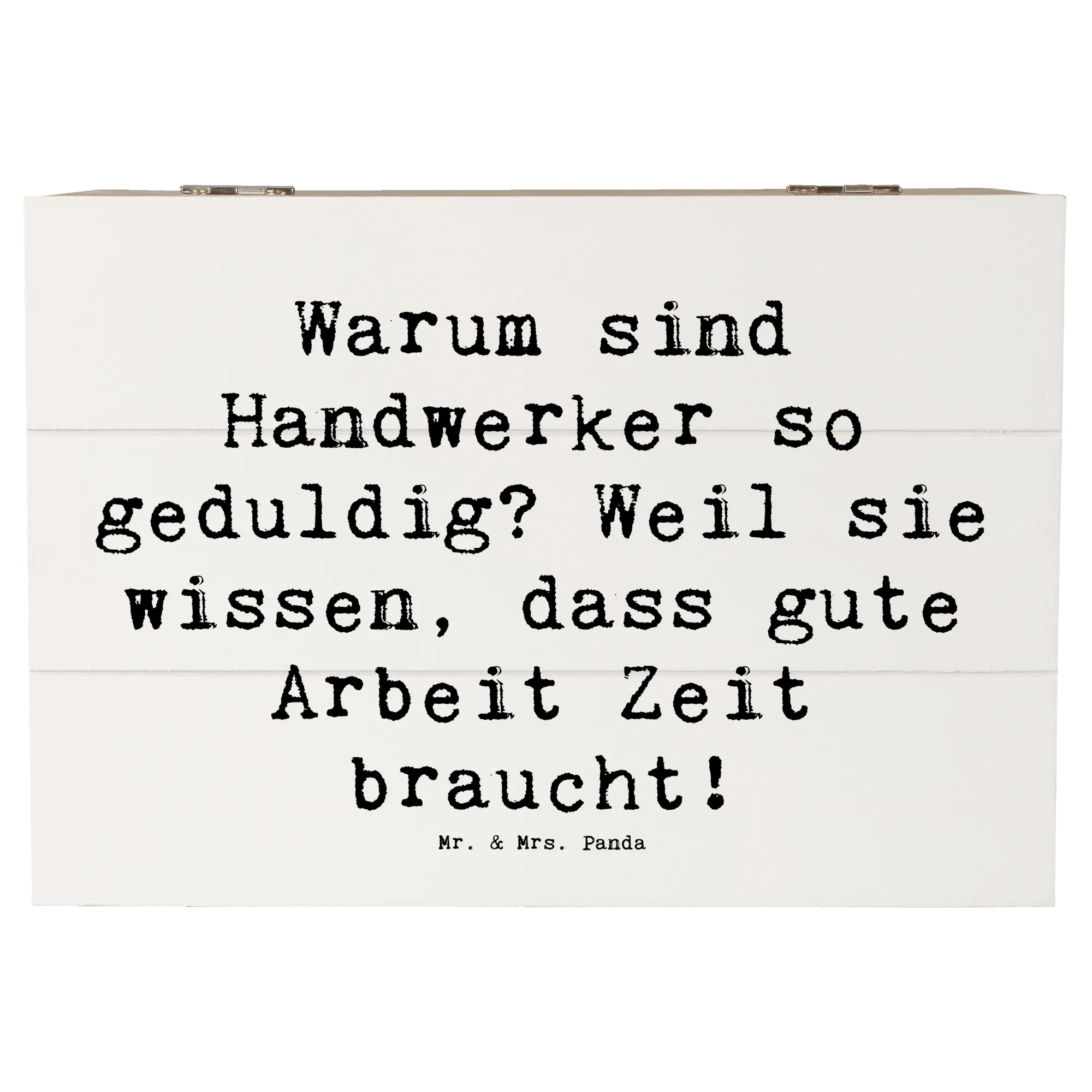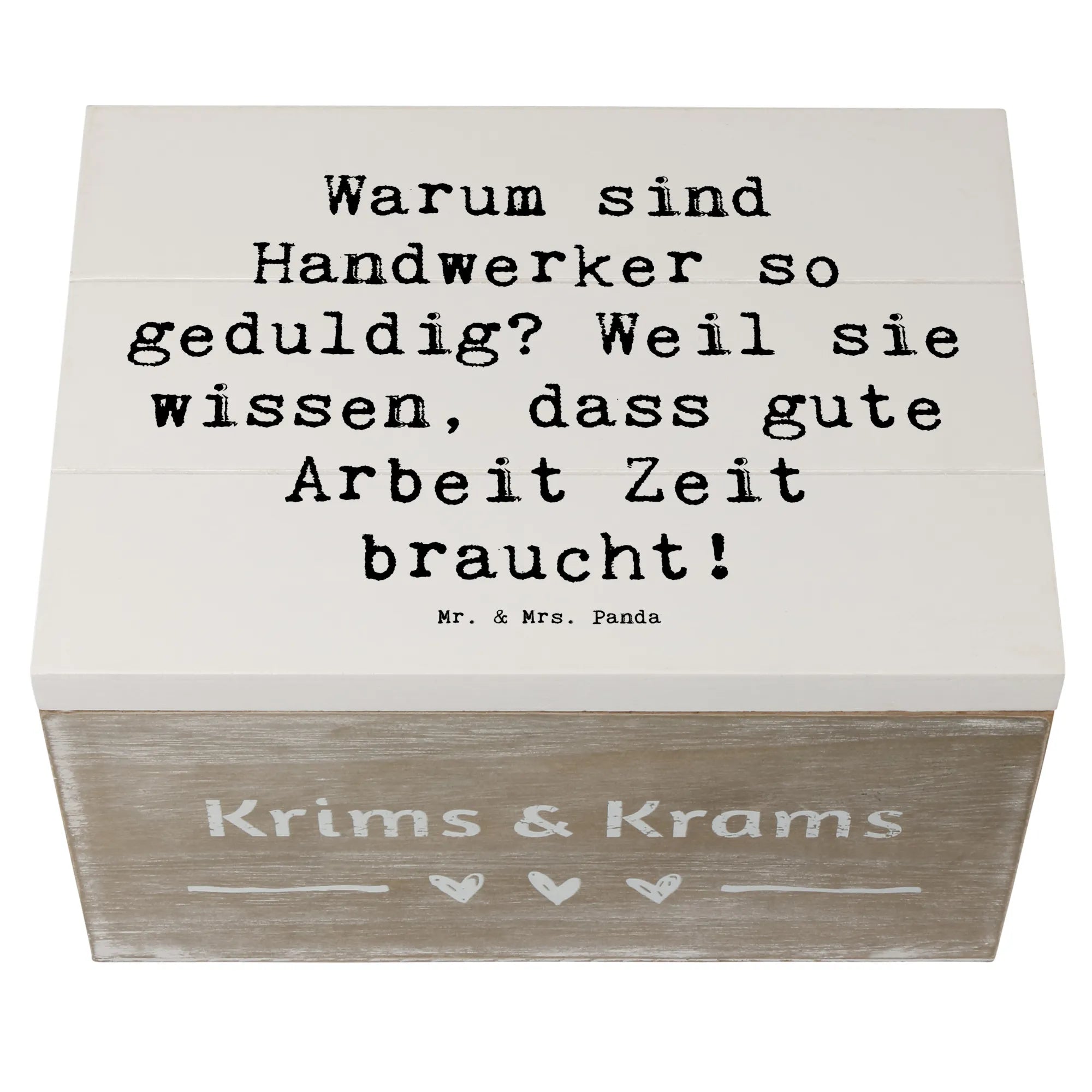 Eine wunderschöne Holzkiste von Mr. & Mrs. Panda – mehr als nur Ordnung: sie ist ein liebevolles Geschenk, das Geschichten bewahrt. Unsere Holzkiste aus der Kollektion „Berufe“ trägt das charmante Handwerker-Motiv mit dem Spruch: „Warum sind Handwerker so geduldig? Weil sie wissen, dass gute Arbeit Zeit braucht!“ – liebevoll von Mrs. Panda handgezeichnet.