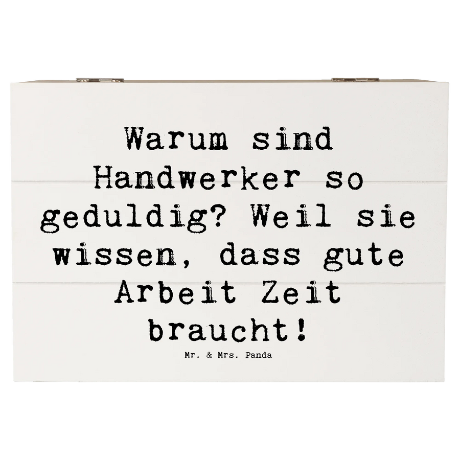Der Spruch "Warum sind Handwerker so geduldig? Weil sie wissen, dass gute Arbeit Zeit braucht!" ist ein Herzensthema des Handwerks und macht die Box zu einem liebevollen Geschenk für jeden, der in diesem Beruf tätig ist. Die Einschlagscharniere ermöglichen ein einfaches Öffnen und Schließen, sodass die Kiste bequem zugänglich ist – ideal für persönliche Erinnerungen wie Fotos, Andenken oder kleine Kostbarkeiten.