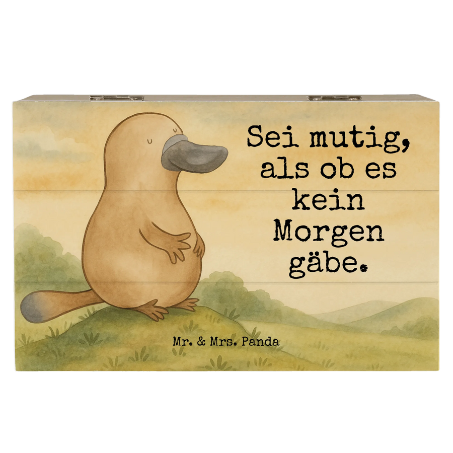 Das Motiv zeigt das liebenswerte Schnabeltier Konrad, das uns mit seinem sanften Lächeln daran erinnert, worauf es wirklich ankommt: Mut zu beweisen. Der Slogan 'Sei mutig, als ob es kein Morgen gäbe' ziert diese besondere Truhe und macht sie zum perfekten Geschenk für jeden, der gerade vor einem Neuanfang steht, eine Weltreise plant oder einfach einen kleinen Motivationsschub im Alltag gebrauchen kann. 🌊