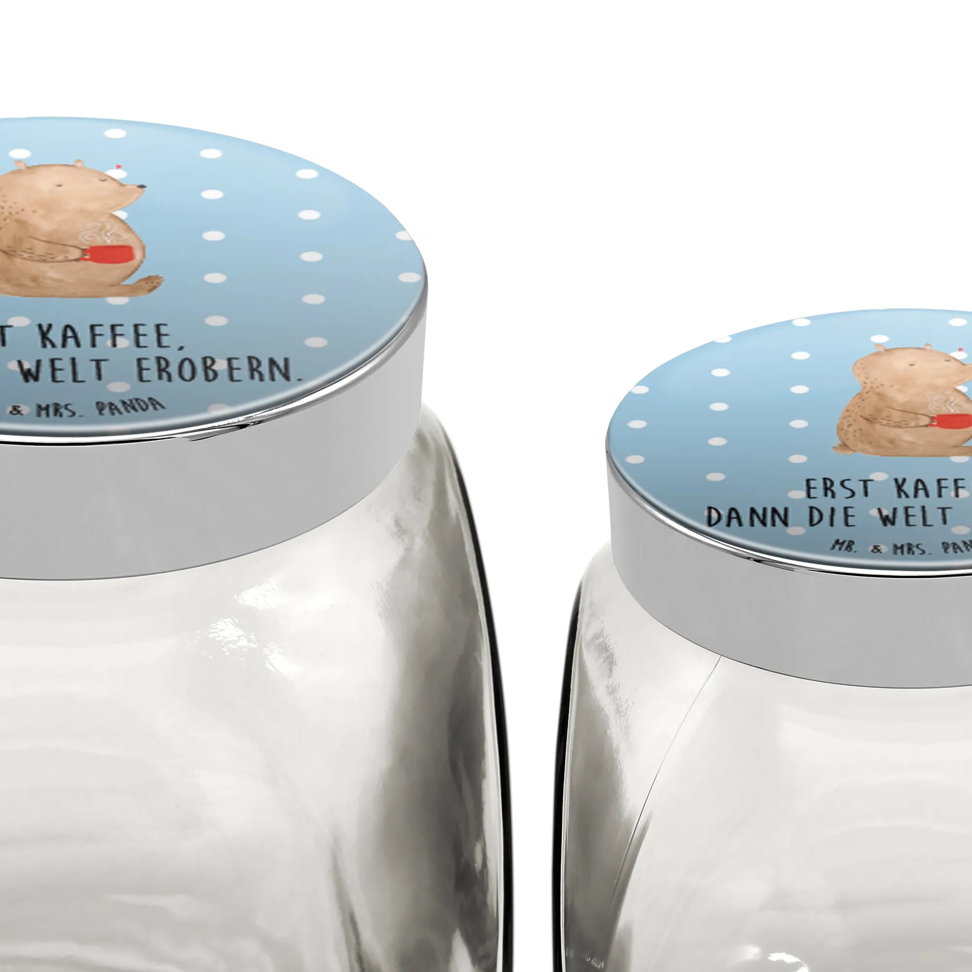 Das Bonbonglas mit dem süßen Bären Motiv "Kaffee" von Mr. & Mrs. Panda ist das perfekte Geschenk für alle Bärenliebhaber und Kaffeegenießer! Mit dem charmanten Spruch "Erst Kaffee, dann die Welt erobern" bringt dieses Glas nicht nur eine Portion Freude in die Küche, sondern erinnert auch täglich daran, dass der gute Morgen mit einer Tasse Kaffee beginnt.