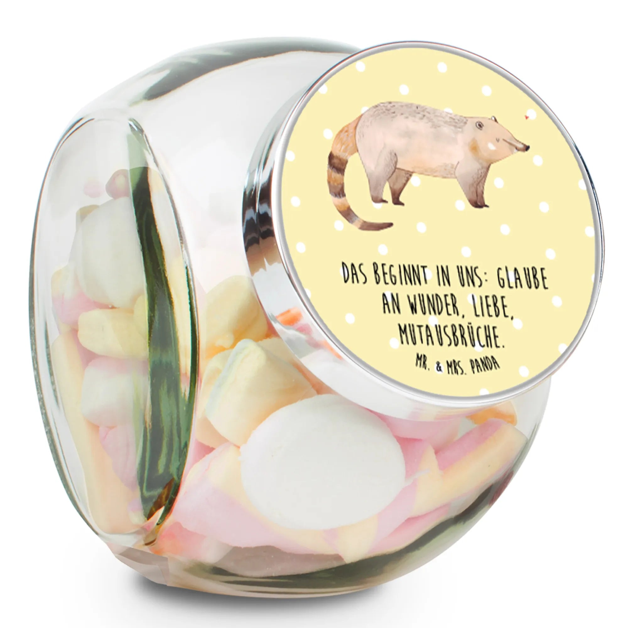 Das wunderschöne Bonbonglas mit dem süßen Nasenbär-Motiv aus der Small World Kollektion von Mr. & Mrs. Panda ist das perfekte Geschenk für Tierliebhaber und Süßigkeitenfans! Dieses hochwertige Glas fasst stolze 2000 ml und eignet sich hervorragend für die Aufbewahrung von Bonbons, Keksen, Kaffee, Tee und anderen Leckereien.