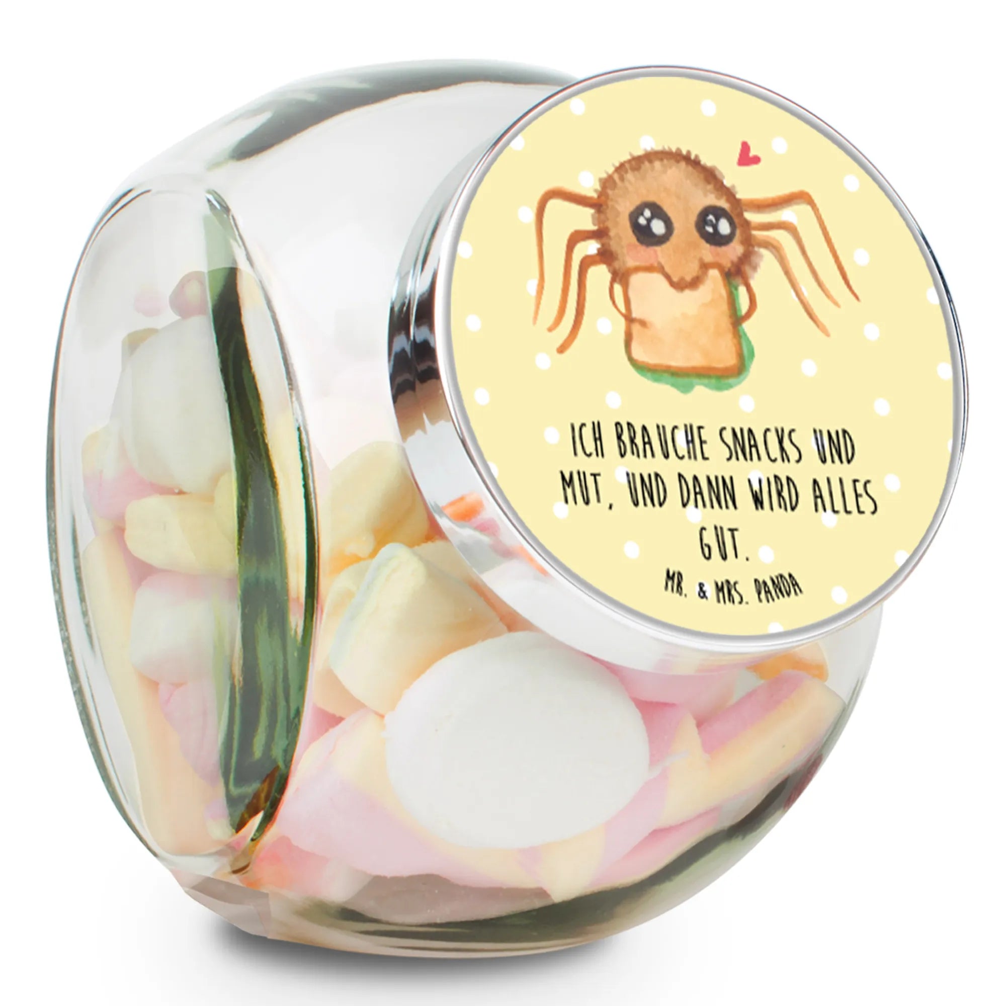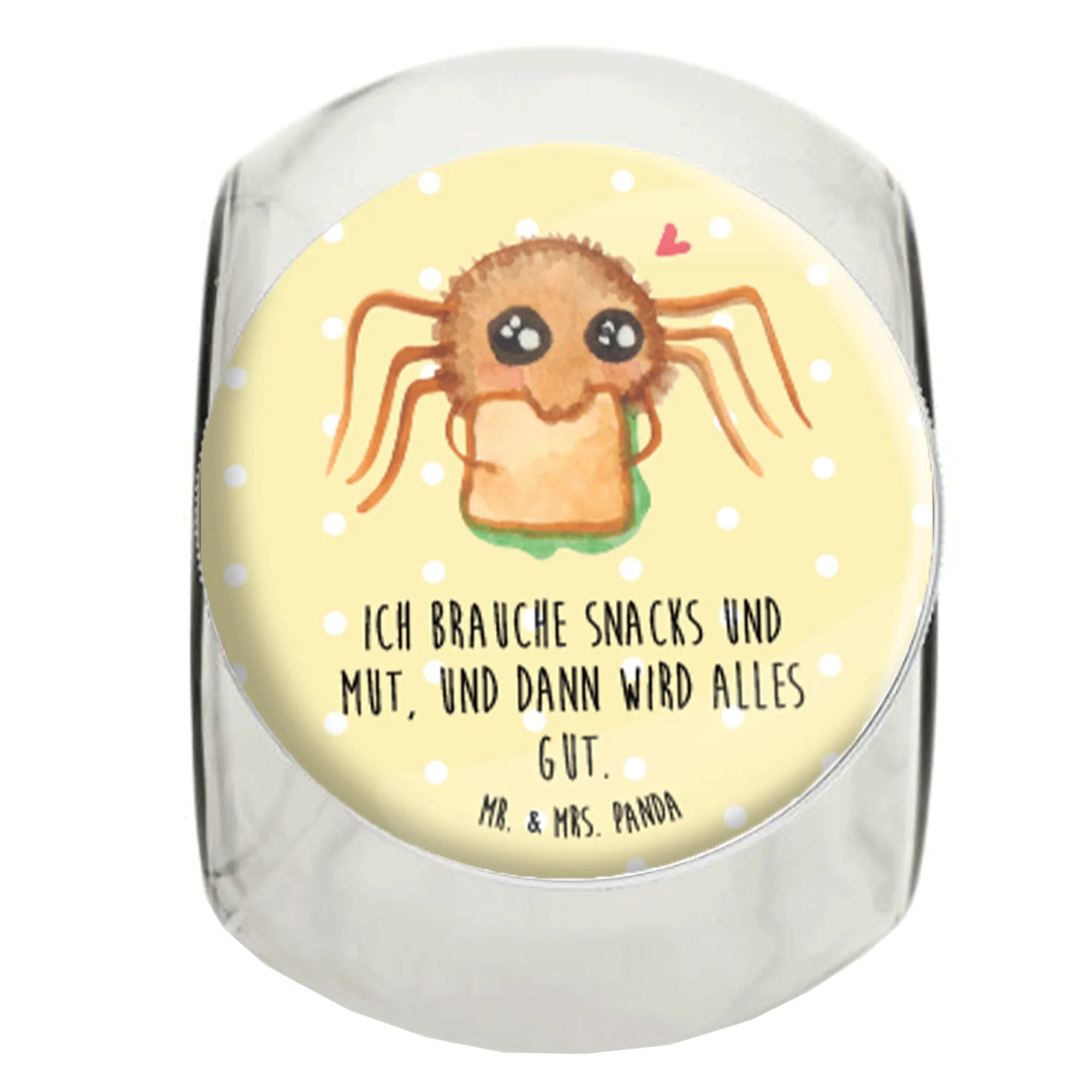 Das wunderschöne Bonbonglas von Mr. & Mrs. Panda mit dem einzigartigen Motiv Spinne Agathe Sandwich ist das perfekte Geschenk für alle Naschkatzen und Kaffeeliebhaber! Mit einem Füllvolumen von 870 ml bietet es genügend Platz für deine Lieblingsleckereien. Ob Bonbons, Kekse, Kaffee oder Tee - hier bleibt die Frische garantiert im Glas!