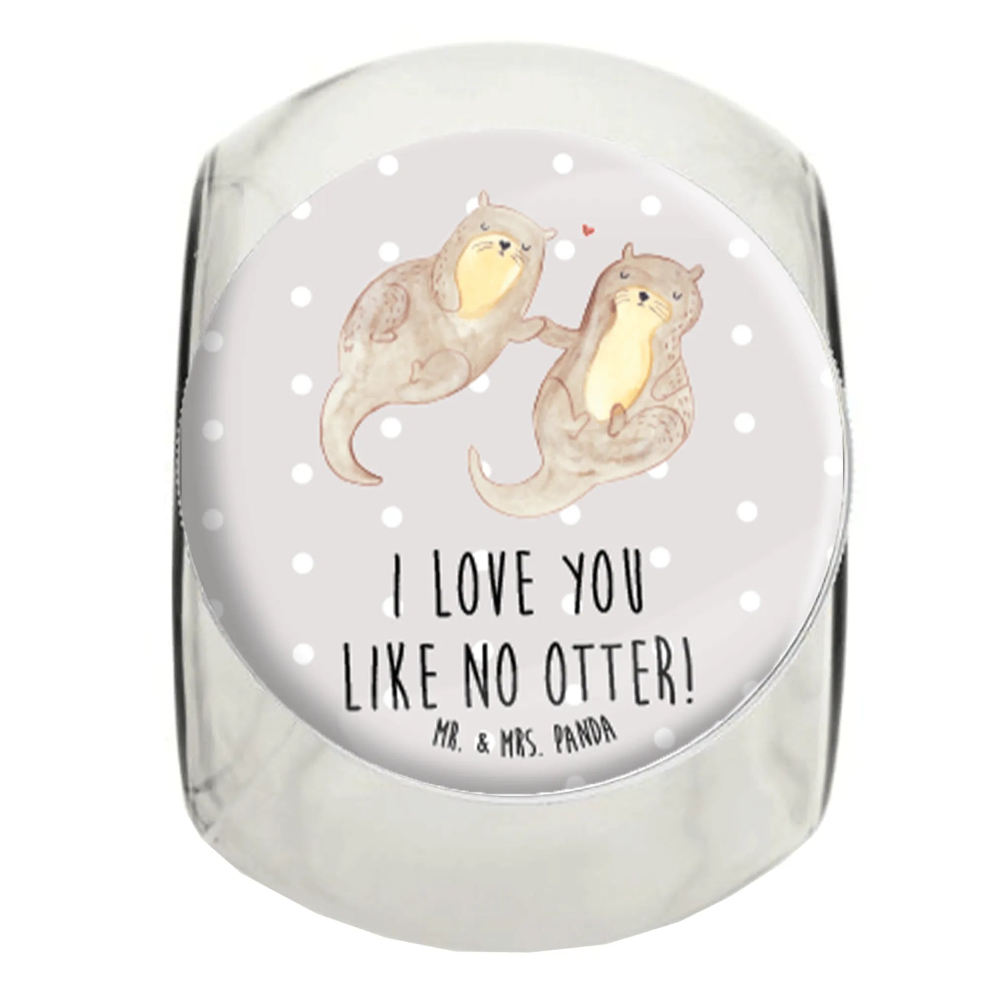 Mr. & Mrs. Panda Bonbonglas „Otter händchenhaltend“ – das perfekte Zusammenspiel aus Funktion und Herzenswärme. Zwei verliebte Seeotter schwimmen auf dem Rücken und halten Händchen. Dieses Motiv aus der Otter - Kollektion bringt sofort gute Laune und zaubert ein Lächeln auf dein Gesicht. Ideal als Bonbonglas, Vorratsglas oder Naschdose für jede Küche.