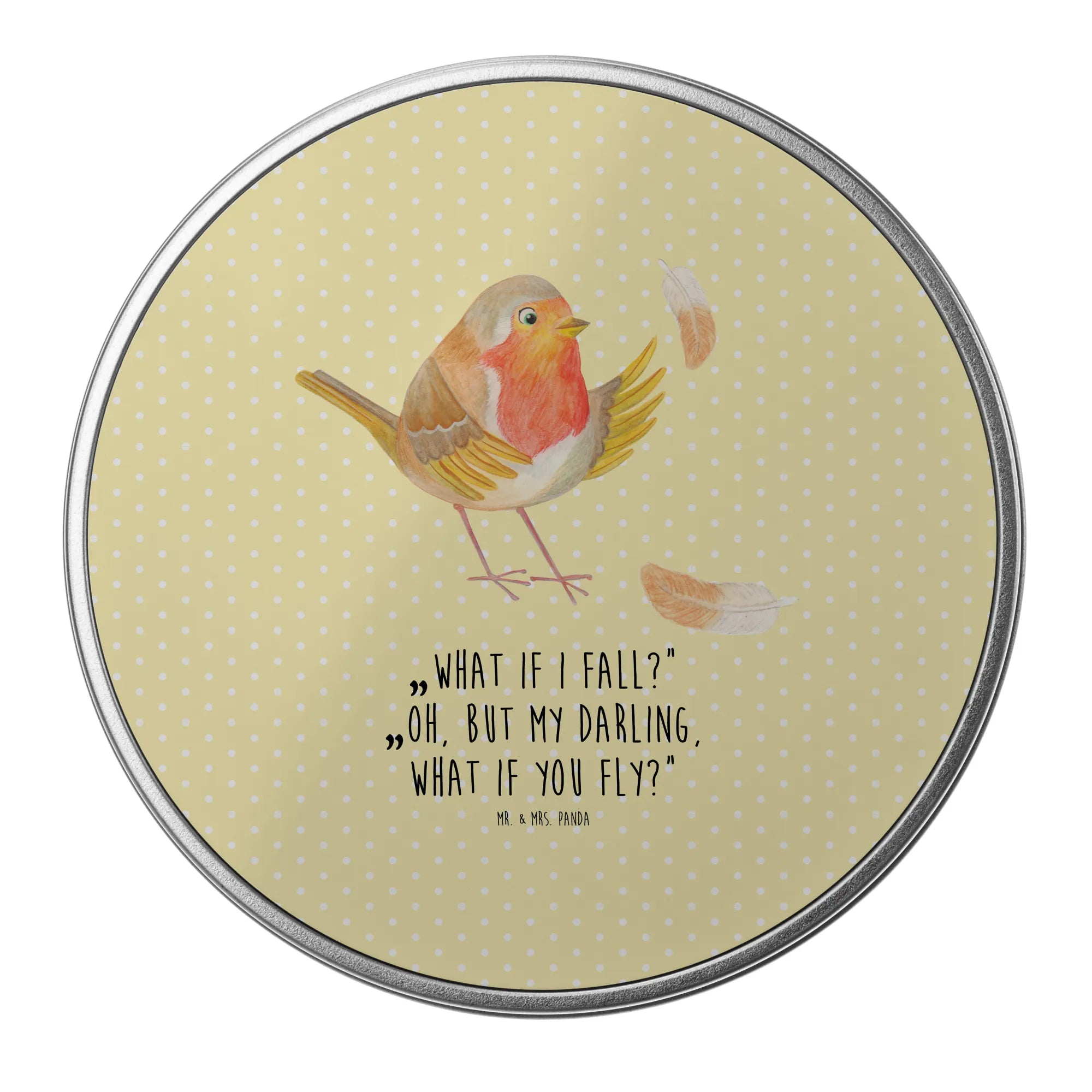 okrągła puszka z blachy rudzik Pióra - z napisem