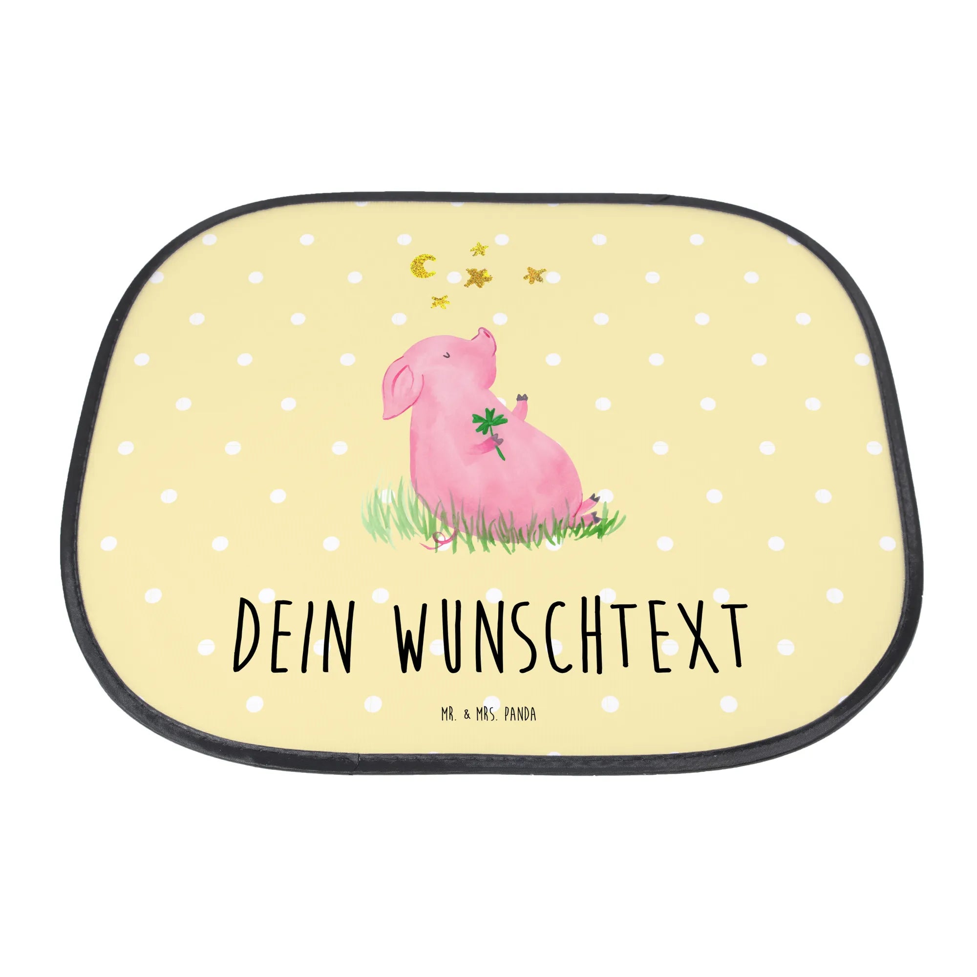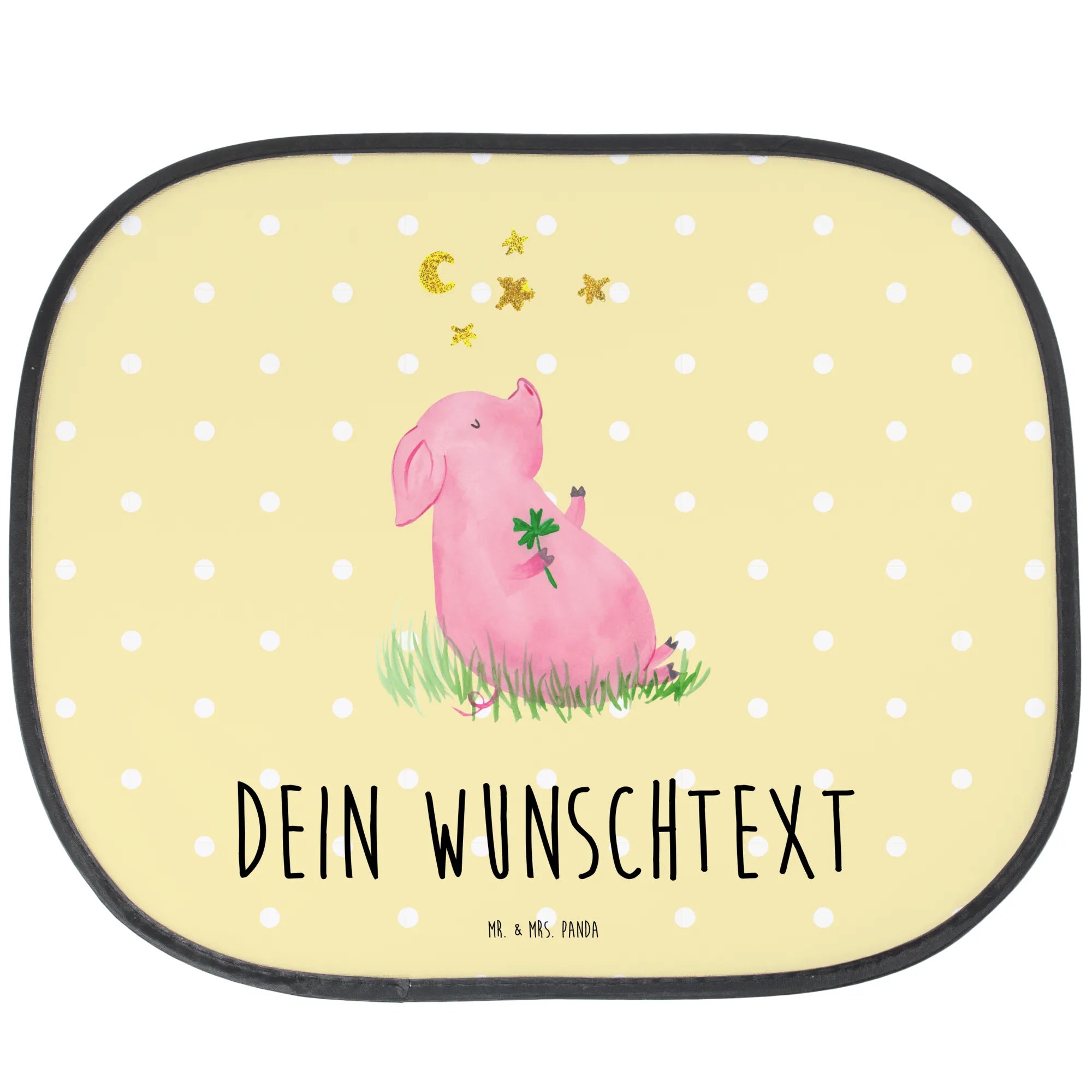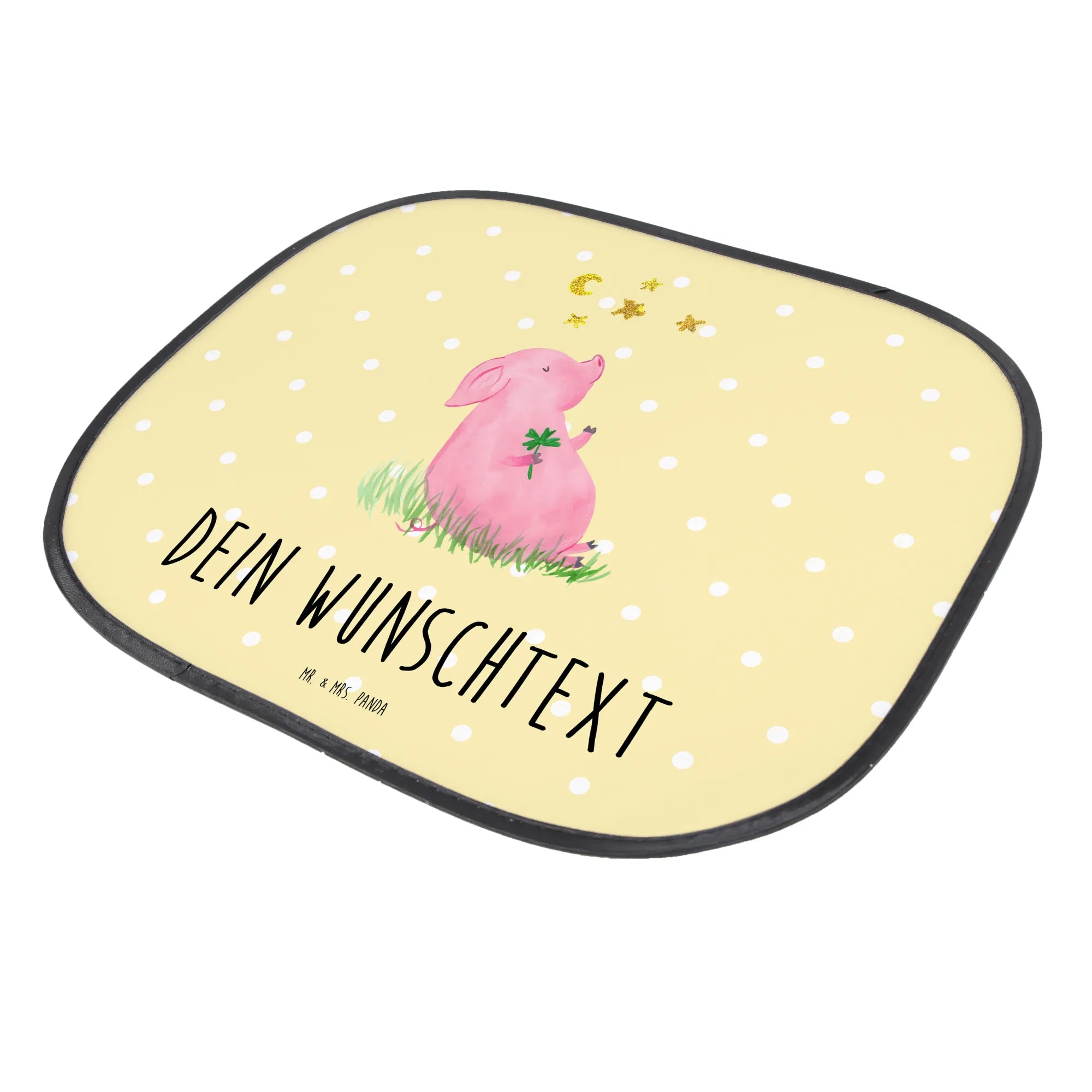 Entdecke den personalisierbaren Auto Sonnenschutz von Mr. & Mrs. Panda mit dem liebevollen Motiv des Glücksschweins aus der Small World Kollektion.