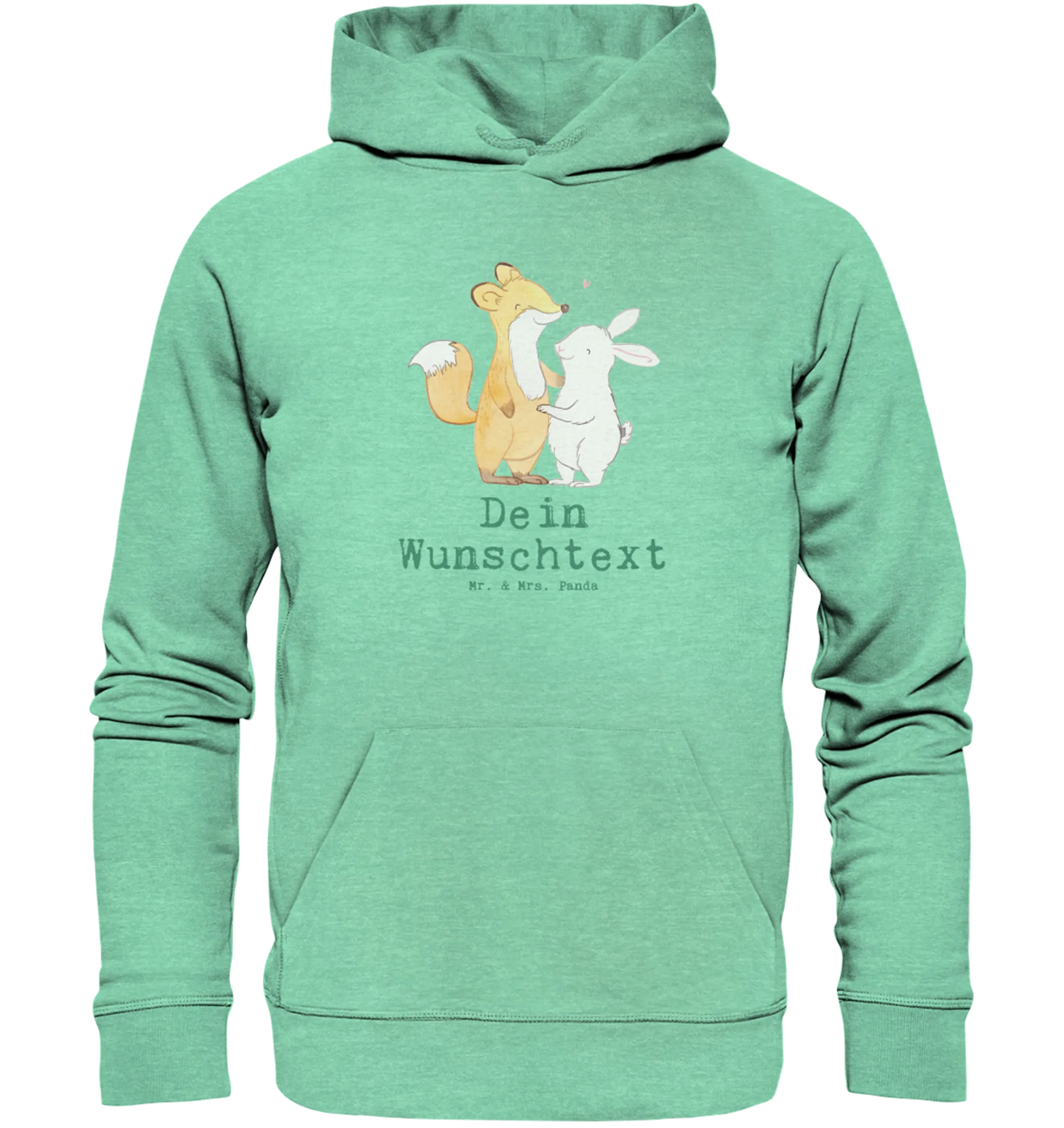 Der personalisierte Hoodie Fuchs Hase Freunde treffen Tage ist das perfekte Geschenk für alle, die Freude am Leben und an besonderen Momenten mit Freunden haben. In einem tollen Mid Heather Green, der an die frische Natur erinnert, kommt dieser Hoodie in einer wunderschönen, flauschigen Bio-Baumwolle, die nicht nur komfortabel ist, sondern auch mit einem süßen Motiv und einem liebevollen Spruch ausgestattet ist.