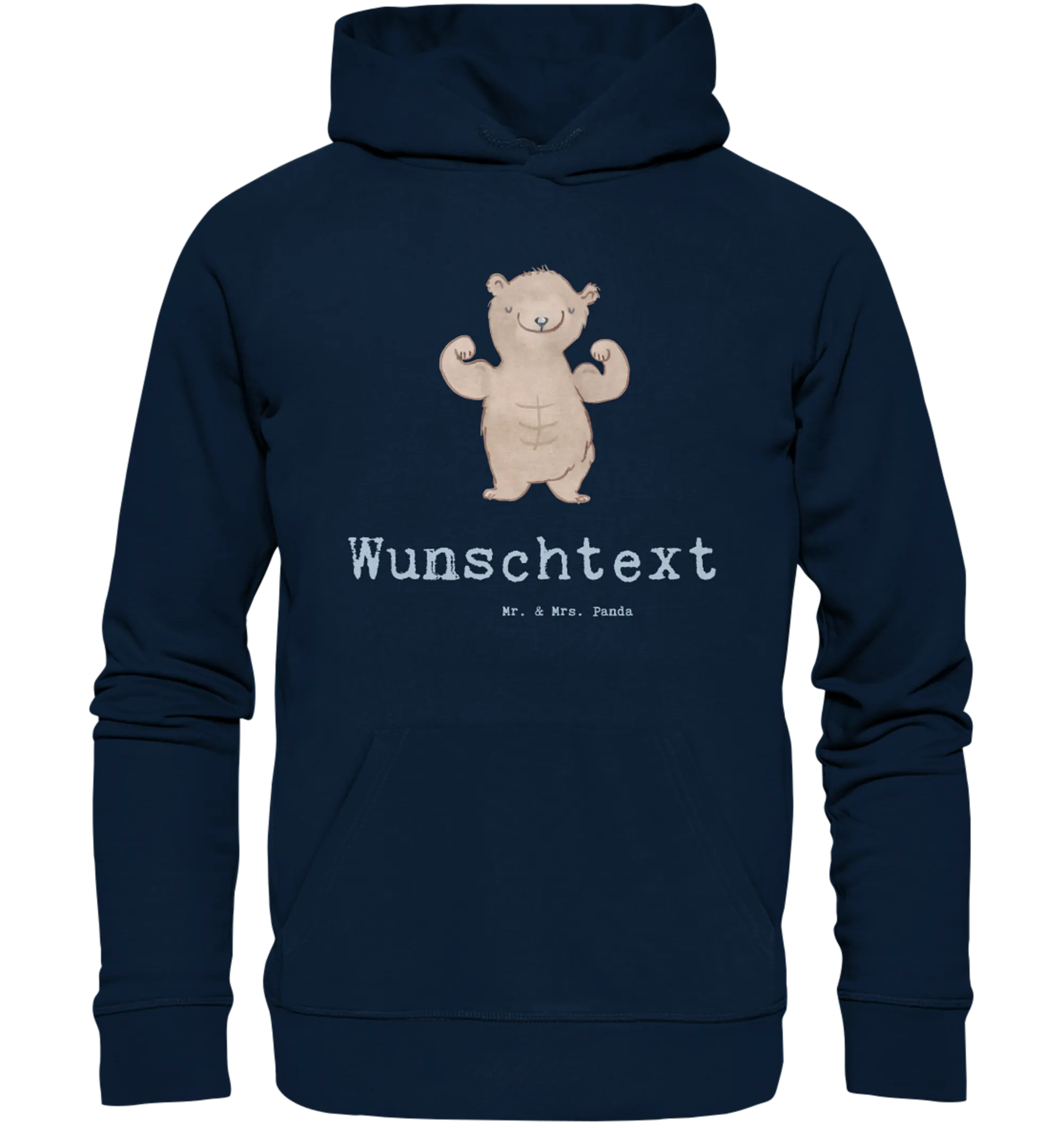 Individualisiert mit deinem Wunschtext oder Namen wird dieser Kapuzenpullover zu einem unverwechselbaren Teil deiner Garderobe. Das Motiv zeigt einen niedlichen Bären, der stolz seine Muskeln präsentiert.