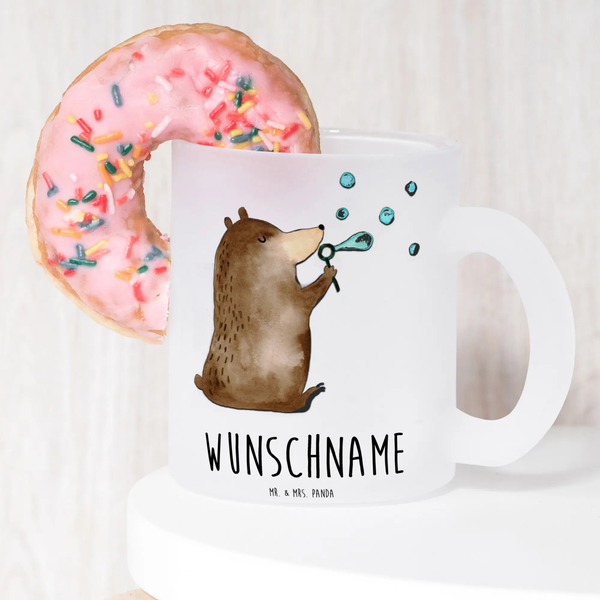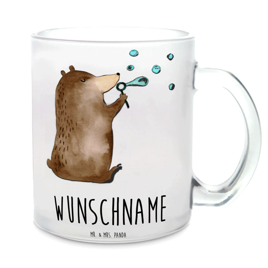 Die personalisierte Teetasse mit dem fröhlichen Bären-Motiv und den Seifenblasen von Mr. & Mrs. Panda ist nicht nur ein wunderschönes Geschenk, sondern bringt auch jede Menge Freude in die Tasse! Ob für den besten Freund, die liebe Mama oder die süße Enkelin - diese Tasse ist perfekt für alle, die ein Stück Glück in ihrem Alltag suchen. Mit dem lustigen Spruch 'Warum Trübsal blasen, wenn man doch auch Seifenblasen kann?!' zaubert sie jedem ein Lächeln ins Gesicht. Der süße Bär, der fröhlich Seifenblasen bläst, wird dein Herz im Sturm erobern!