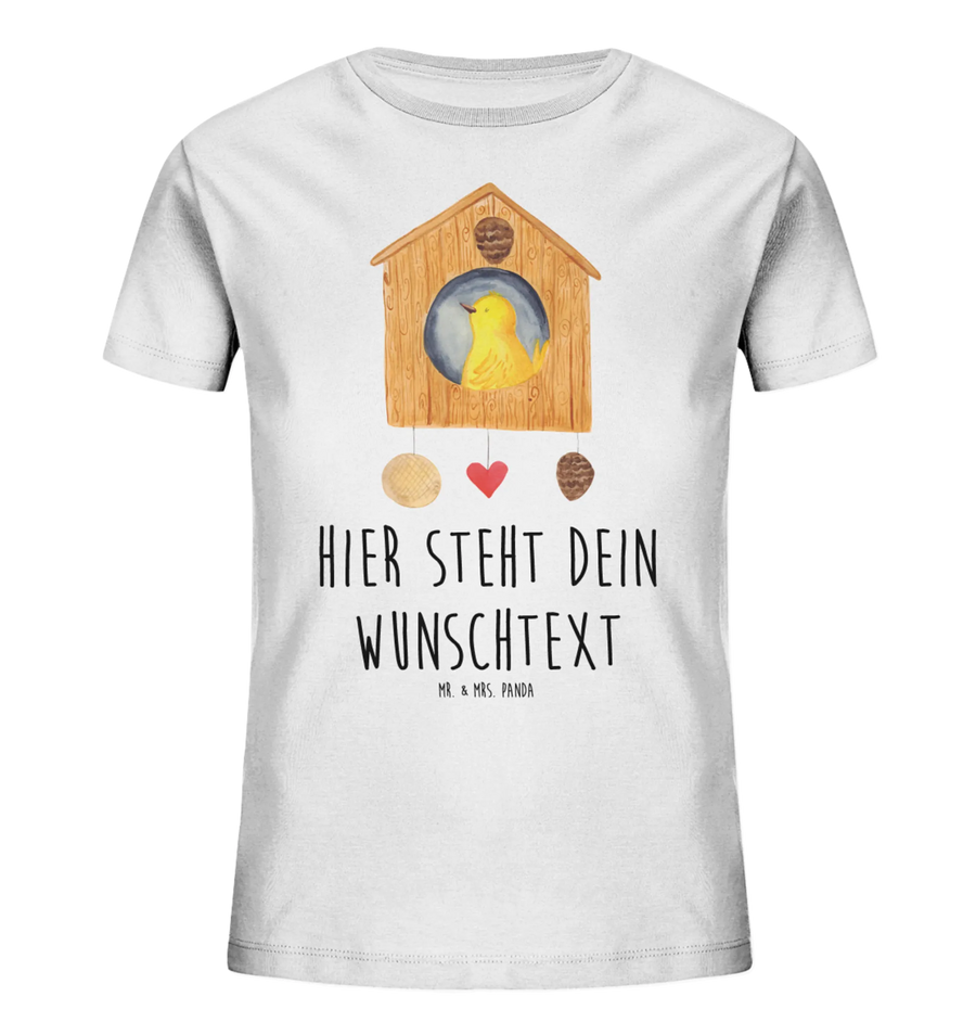 Das niedliche Motiv zeigt einen gelben Vogel, der zufrieden in seinem Vogelhaus sitzt und sich wohlfühlt – so wie jedes Kind in seinem Zuhause. Ob zum Geburtstag, zu Weihnachten oder einfach nur als liebevolle Überraschung zwischendurch, dieses personalisierte T-Shirt macht jeden Anlass zu etwas Besonderem.