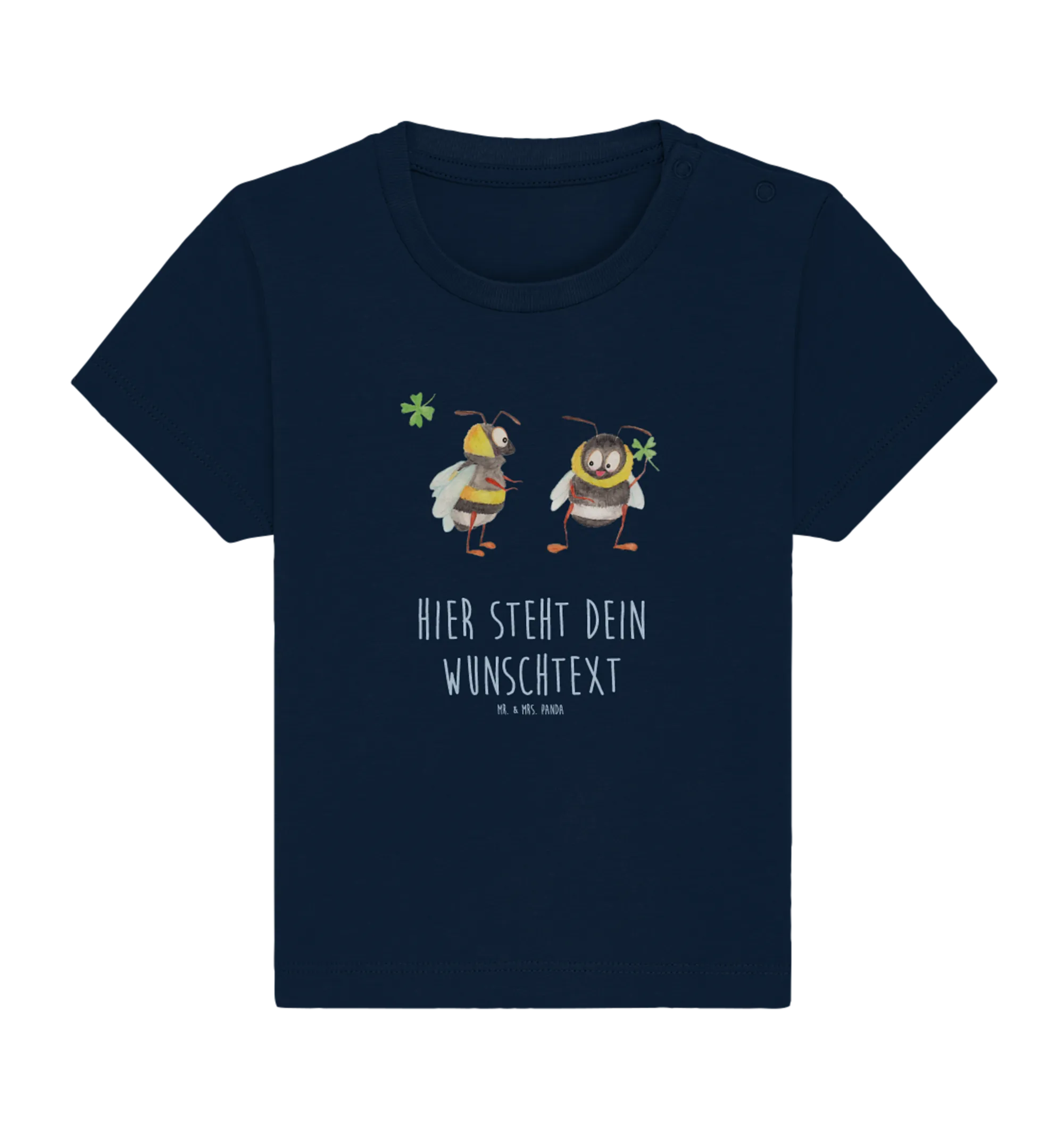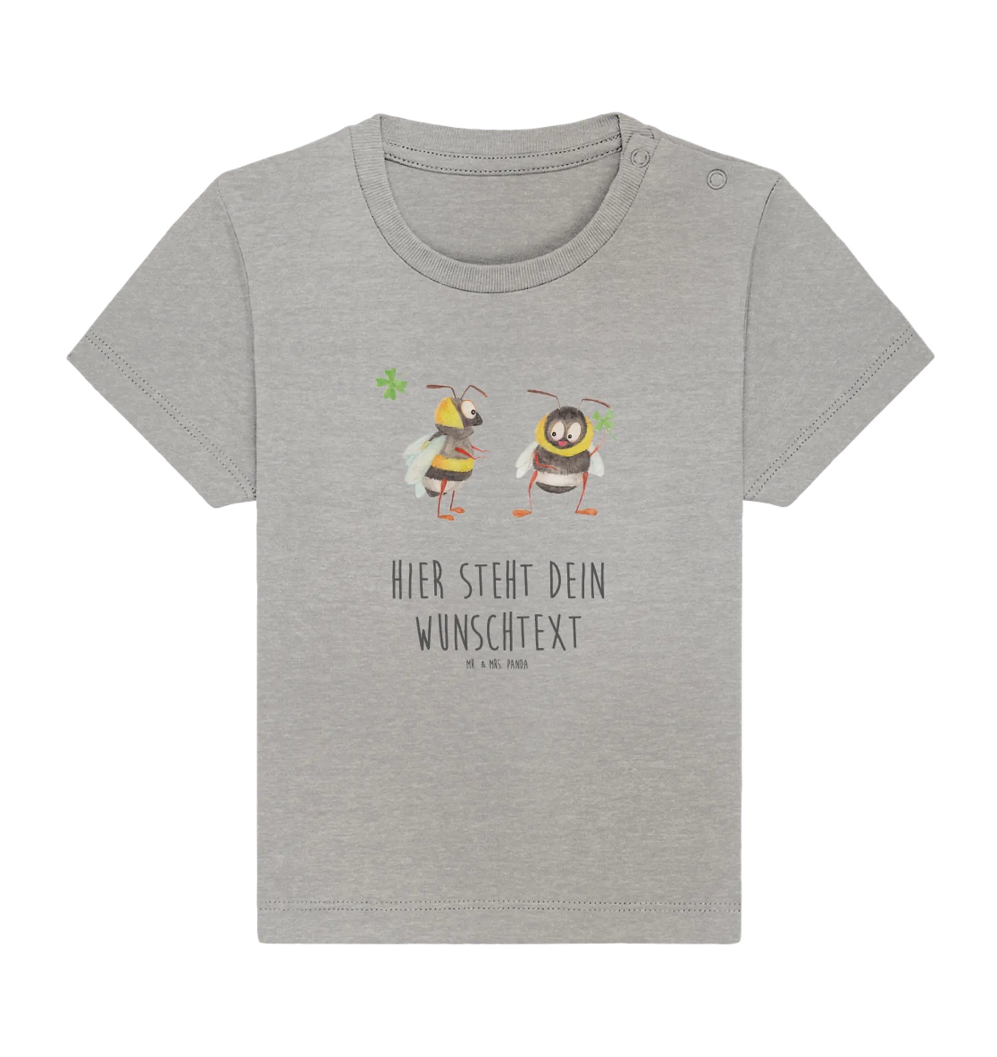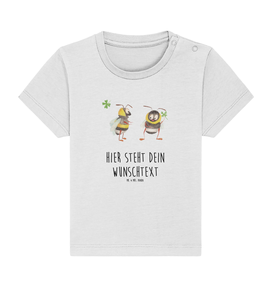 Das personalisierte Baby T-Shirt mit dem zauberhaften Motiv "Hummeln mit Kleeblatt" aus der einzigartigen Small World Kollektion von Mr. & Mrs. Panda ist das perfekte Geschenk für deinen kleinen Liebling oder als Geschenk zur Geburt. Die zwei niedlichen Hummeln, die sich freudig gegenüberstehen und ein Kleeblatt in ihren kleinen Händen halten, symbolisieren die Freude und das Glück, das ein neues Leben mit sich bringt. Denn wenn du dir ein Kind wünscht, dann kommt auch immer das Glück dazu!
