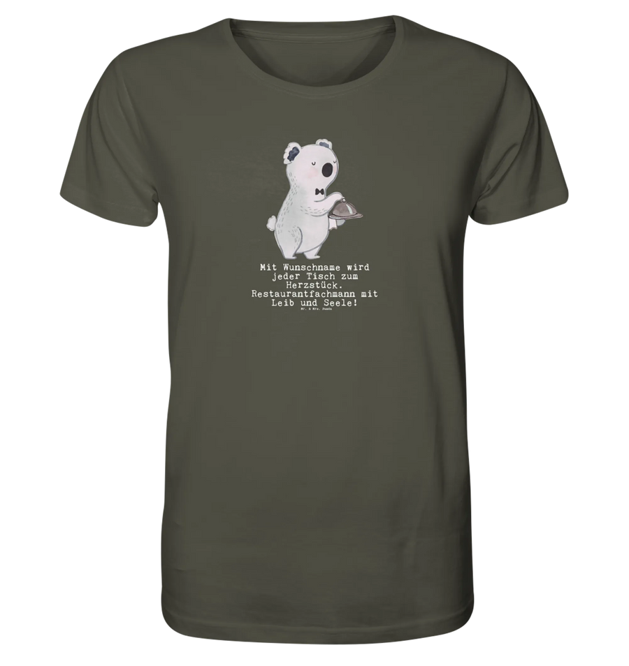 Das personalisierte Shirt für Herren mit dem Motive 'Restaurantfachmann mit Herz' ist das ideale Geschenk für alle, die in der Gastronomie tätig sind oder eine Ausbildung in diesem Bereich absolvieren. Mit einem süßen, handgezeichneten Koala, der begeistert Essen serviert, ist dieses Shirt sowohl lustig als auch originell.