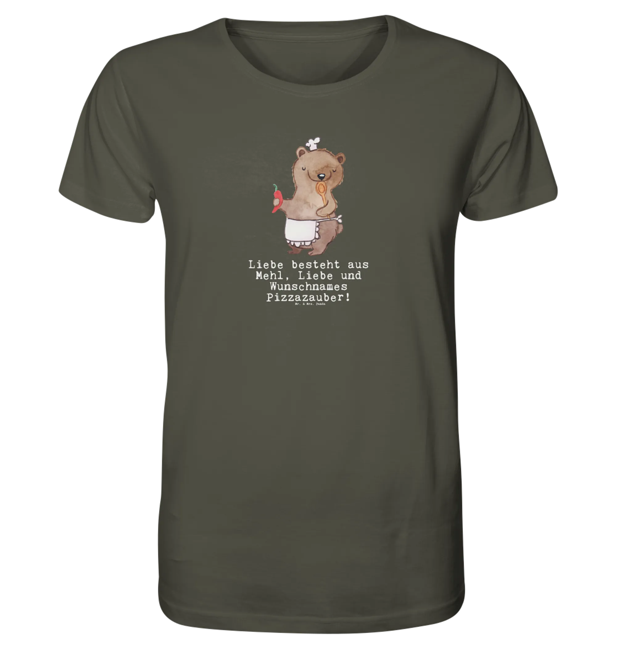 Entdecke unser liebevoll gestaltetes personalisiertes Shirt Herren - Pizzabäcker mit Herz! Dieses T-Shirt ist das perfekte Geschenk für alle, die den Beruf des Pizzabäckers ausüben oder einfach ein großes Herz für Pizza haben. Der süße Bär mit Kochschürze, Kochlöffel und Chili bringt nicht nur Freude beim Tragen, sondern zeigt auch die Leidenschaft für die italienische Köstlichkeit!