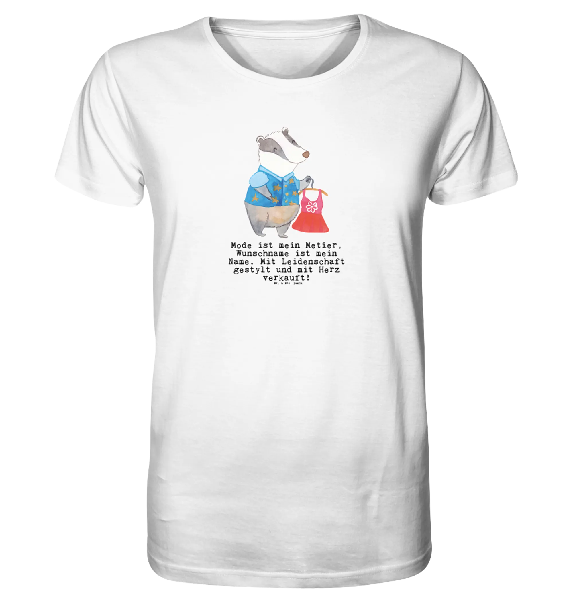 Die kreative Berufe Kollektion von Mr. & Mrs. Panda vereint hübsche Aquarellzeichnungen und ansprechende Sprüche. Der süße Dachs, der ein feines Kleid präsentiert, wird jedem Modeverkäufer ein Lächeln ins Gesicht zaubern. Schenke dieses T-Shirt einem lieben Kollegen oder vielleicht sogar dir selbst!