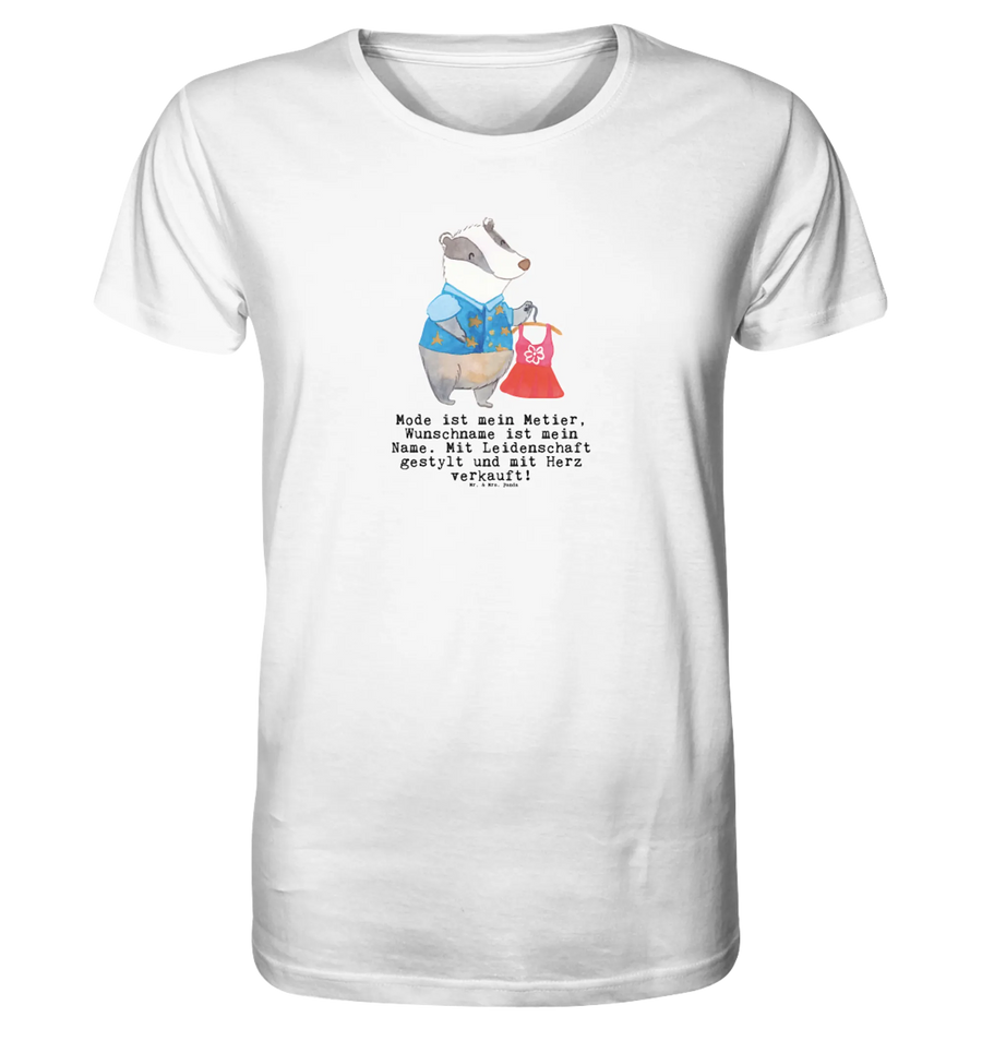 Das personalisierte Shirt Herren mit dem süßen Motiv 'Modeverkäufer mit Herz' aus der kreativen Berufe Kollektion von Mr. & Mrs. Panda ist das ideale Geschenk für jeden Modeverkäufer!