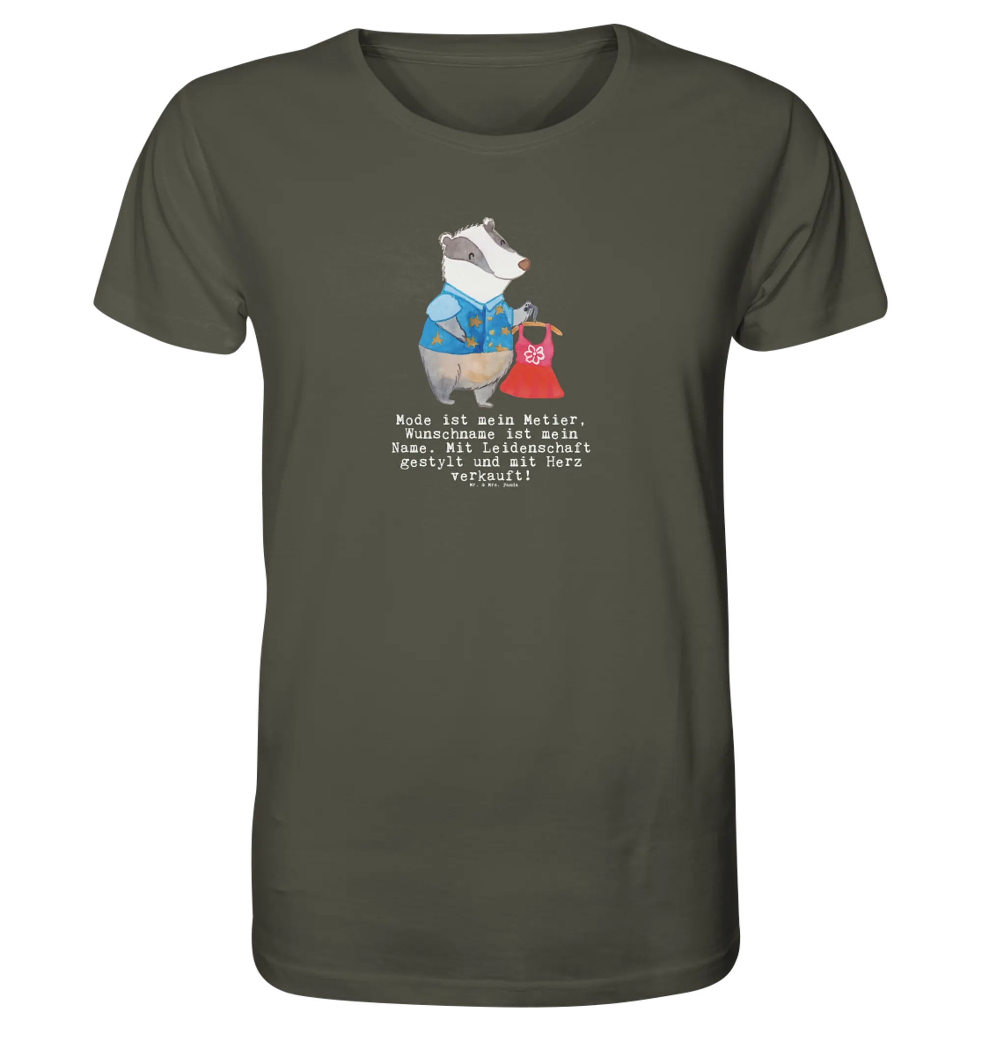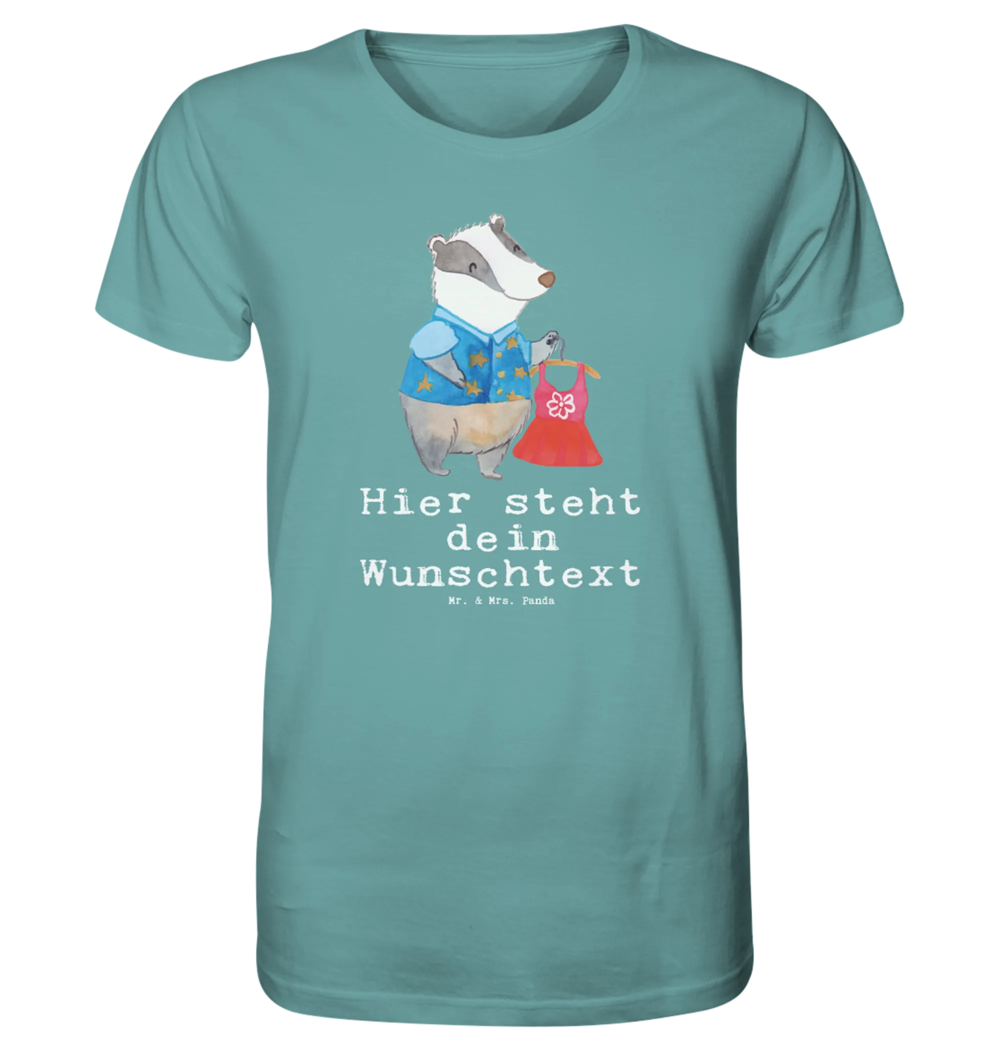 Das Motiv zeigt einen süßen Dachs in einem stilvollen Outfit, der ein schönes Kleid präsentiert. Mit dem personalisierten Shirt zeigst du nicht nur deinen Berufsstolz, sondern auch deine Leidenschaft für die Mode. Es ist ein cooles Geschenk für Männer und Frauen gleichermaßen und lässt sich perfekt mit anderen Produkten aus der Berufe Kollektion von Mr. & Mrs. Panda kombinieren.