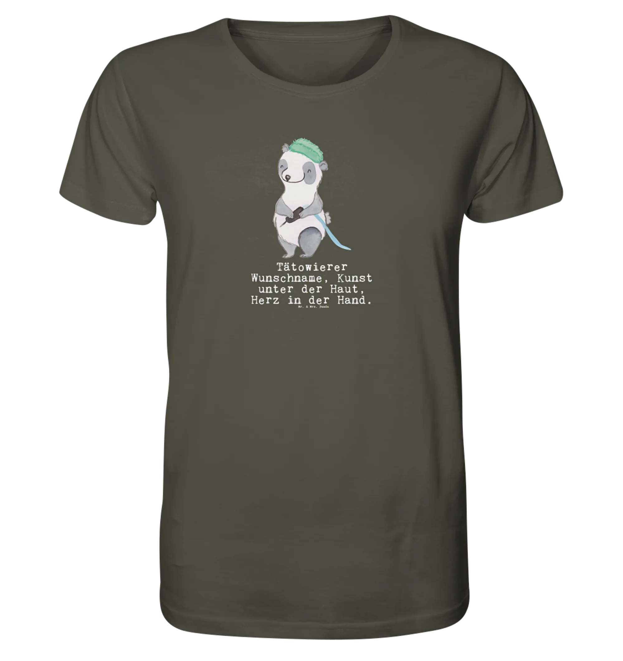 Das personalisierte Shirt für Herren mit dem Motiv 'Tätowierer mit Herz' ist das perfekte Geschenk für alle Tattoo-Liebhaber und kreativen Köpfen. Mit einem süßen Panda, der eine Tätowiermaschine in der Hand hält, bringt dieses Shirt nicht nur Freude, sondern auch eine Botschaft: 'Du bist nur ein halber Mensch, wenn du kein Tätowierer bist.'
