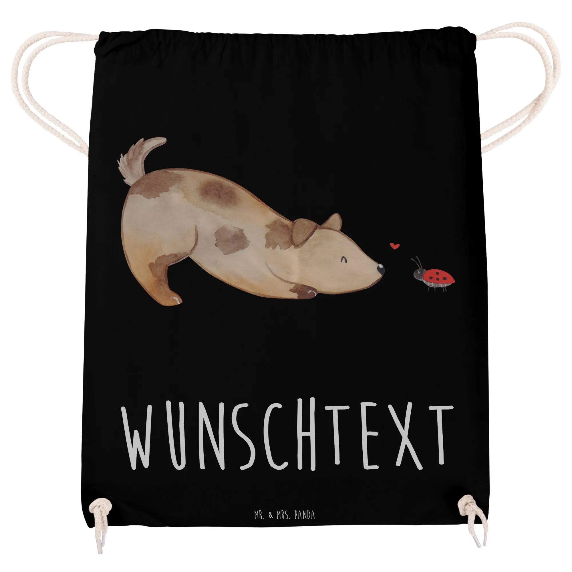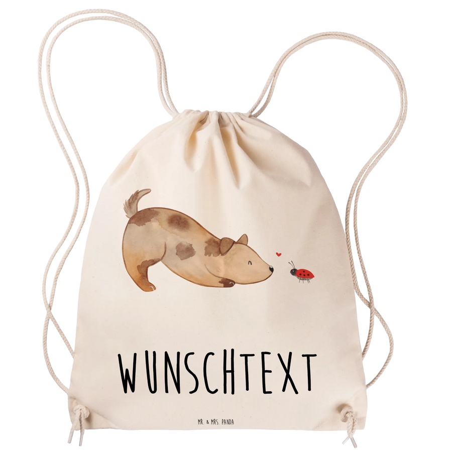 Der personalisierte Sportbeutel von Mr. & Mrs. Panda ist das perfekte Geschenk für Tierliebhaber und Hundebesitzer! Mit dem niedlichen Motiv eines Hundes, der enthusiastisch vor einem kleinen Marienkäfer sitzt, zaubert dieser Beutel jedem ein Lächeln ins Gesicht.