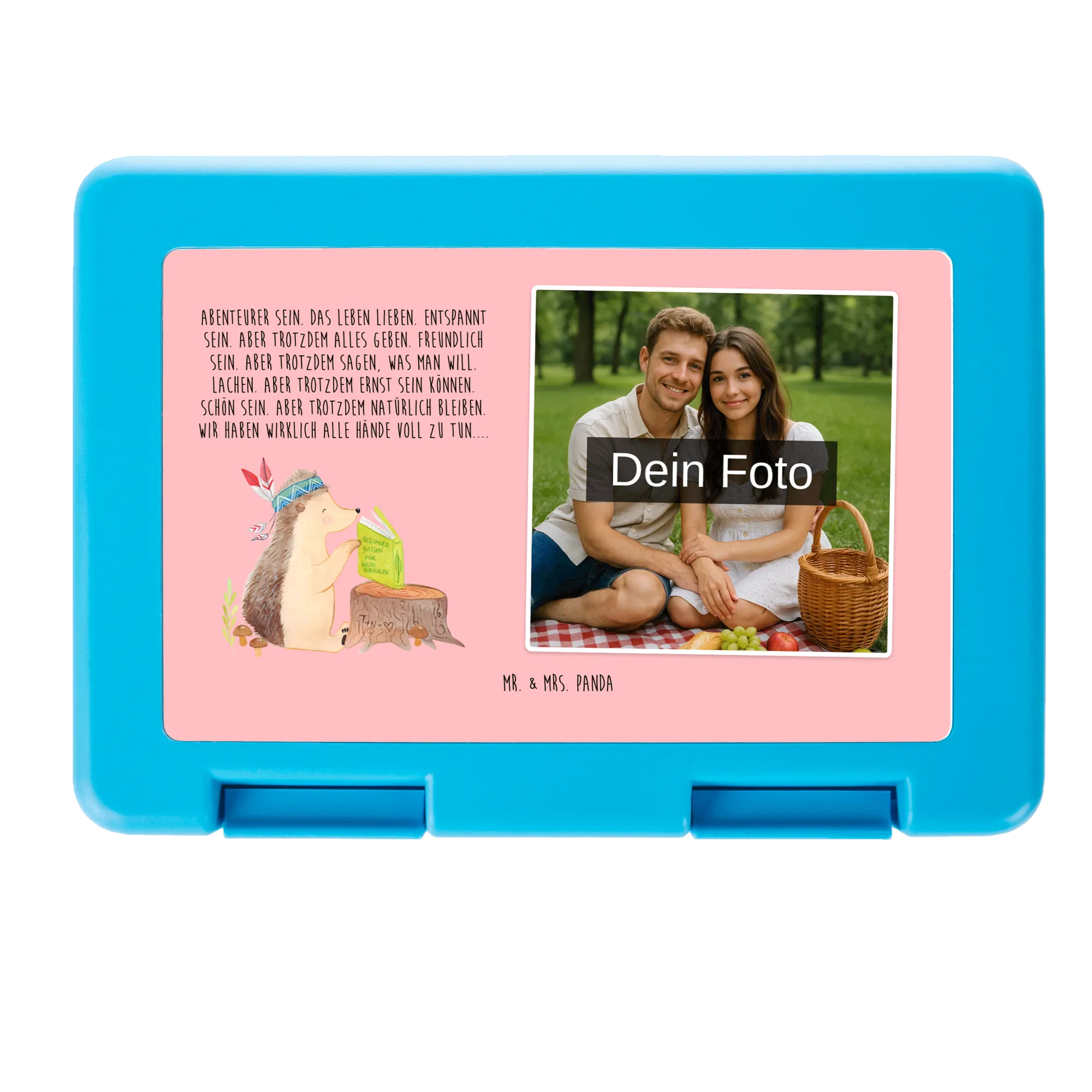 Personalisierte Foto Brotdose Igel Federschmuck - Blau Pastell