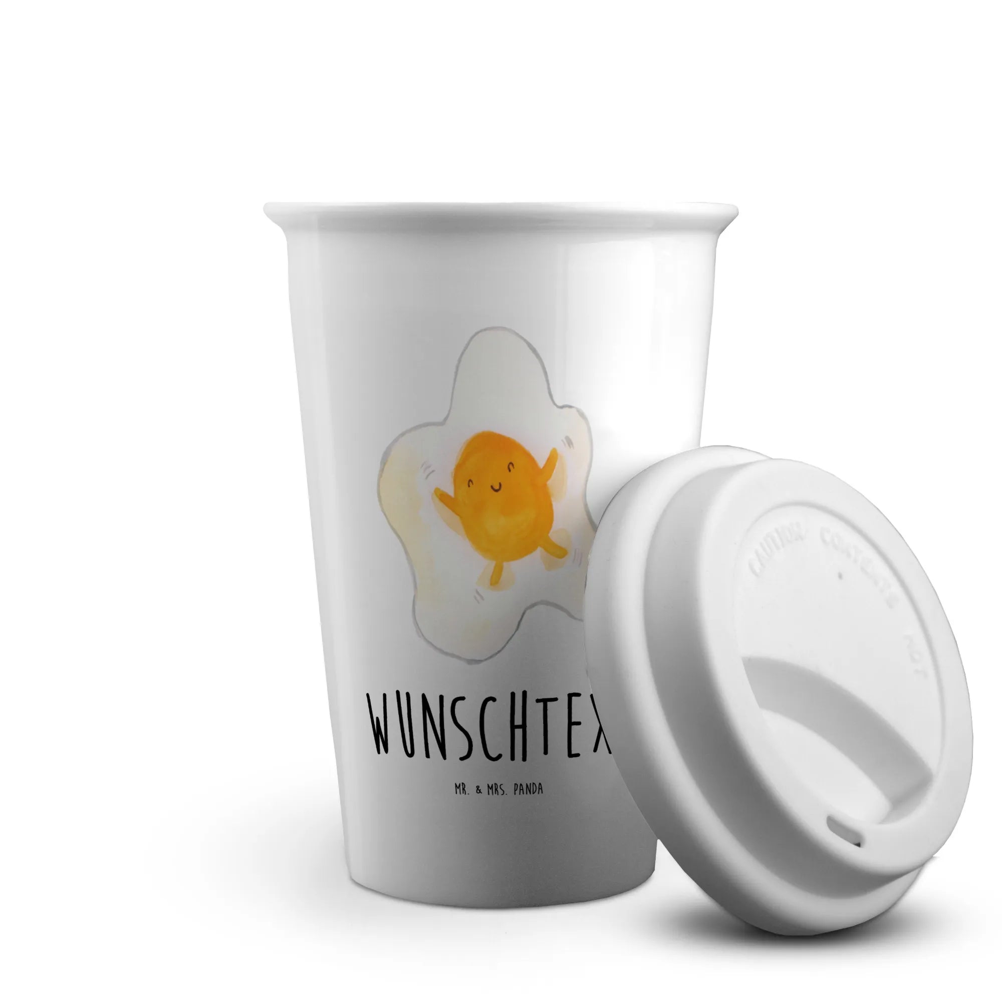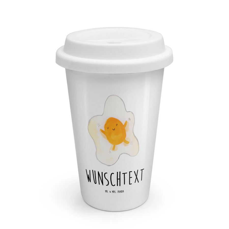 Erlebe selbst, wie der personalisierte To Go Becher mit Spiegelei-Motiv nicht nur Deine Laune hebt, sondern auch alle um Dich herum begeistert.