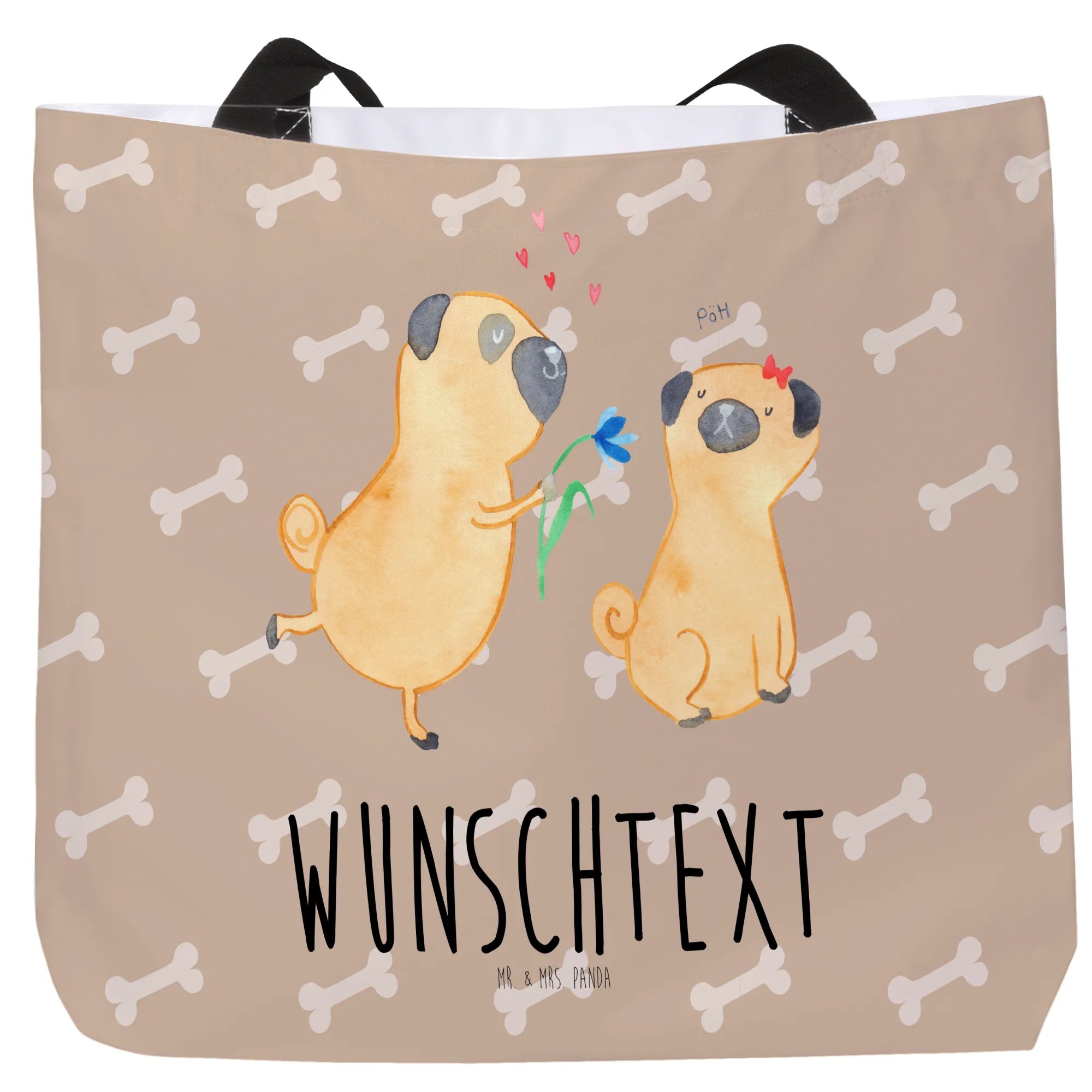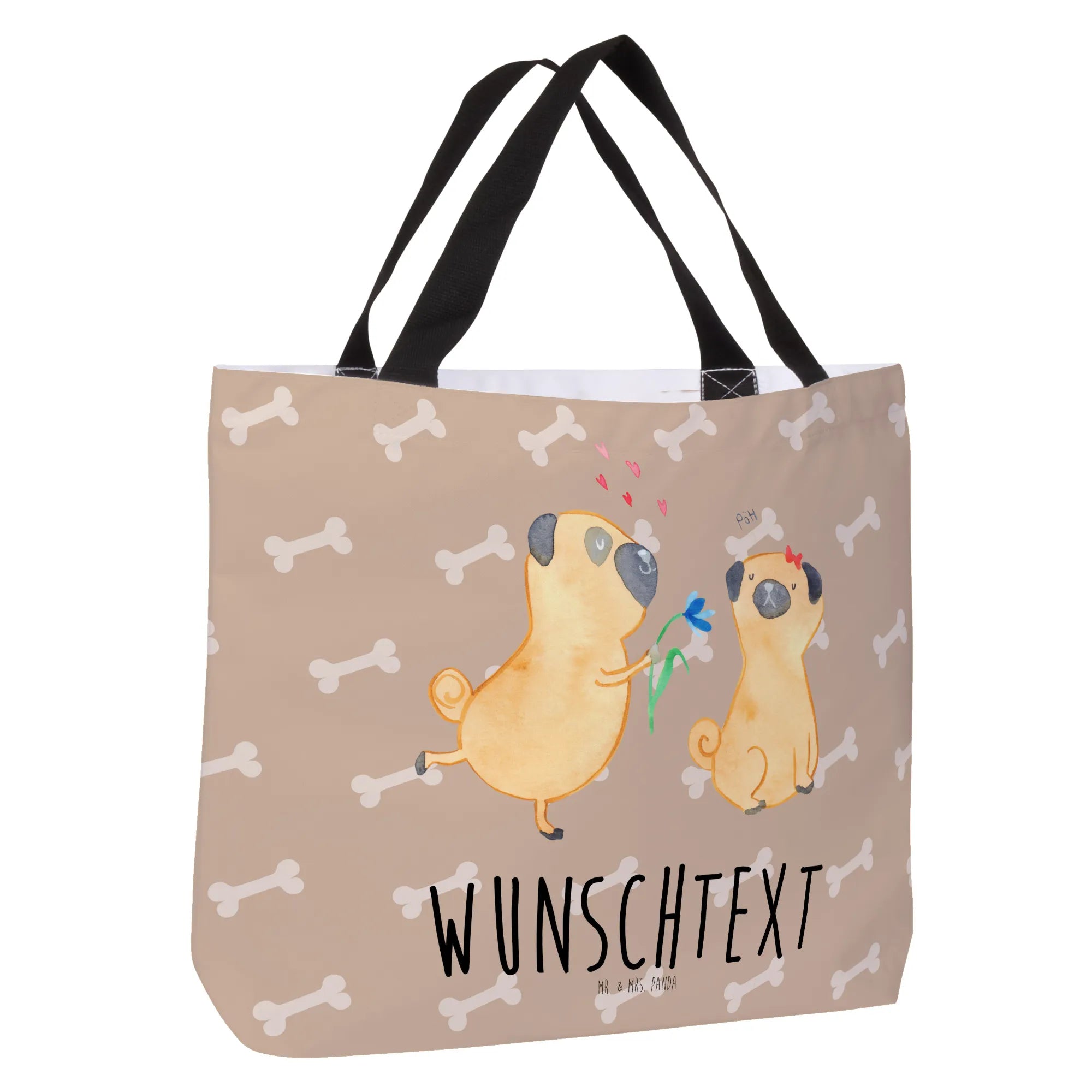 Du suchst das perfekte Geschenk für einen Hundeliebhaber oder möchtest dir selbst etwas Gutes tun? Dann ist die personalisierte Shopper-Tasche "Mops verliebt" aus der Hunde Kollektion von Mr. & Mrs. Panda genau das Richtige für dich! Diese wunderschöne Tasche zeigt zwei niedliche Möpse, die verliebt sind und einem anderen Mops eine Blume schenken. Ein Bild, das nicht nur Herzen erweicht, sondern auch durch seinen Spruch "Du bist alles für mich. Wenig Worte, viel Bedeutung." besticht.