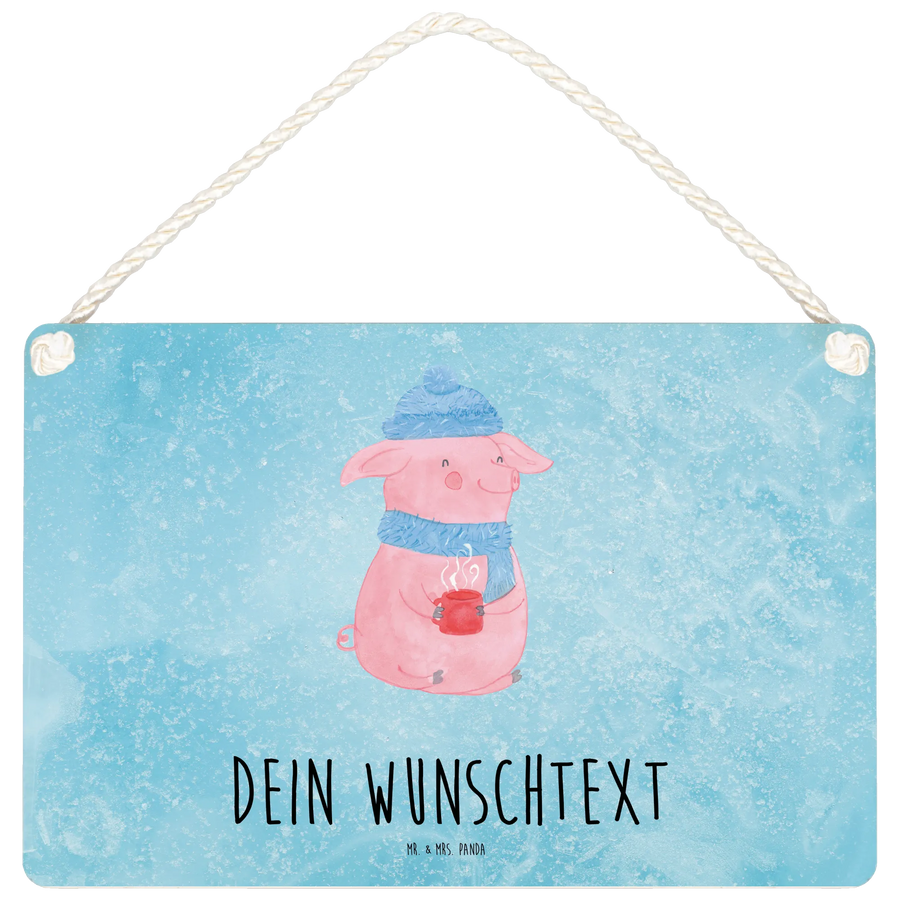 Mit dem fröhlichen Glühschwein, das in einem blauem Schal und einer Mütze gekleidet ist, sowie einer warmen Tasse in der Hand, zaubert dieses Schild ein gemütliches Gefühl, ideal für die kalte Jahreszeit.