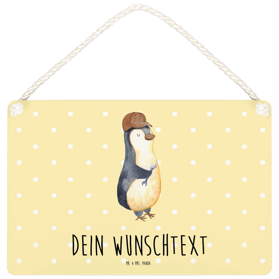 Das lustige Motiv eines Pinguins mit einem Werkzeug in der Hand bringt Freude in jedes Zuhause und wird sicherlich zum Blickfang. Das Schild lässt sich auch personalisieren: Du kannst zusätzlich deinen Wunschnamen anbringen lassen, um es noch individueller zu gestalten.