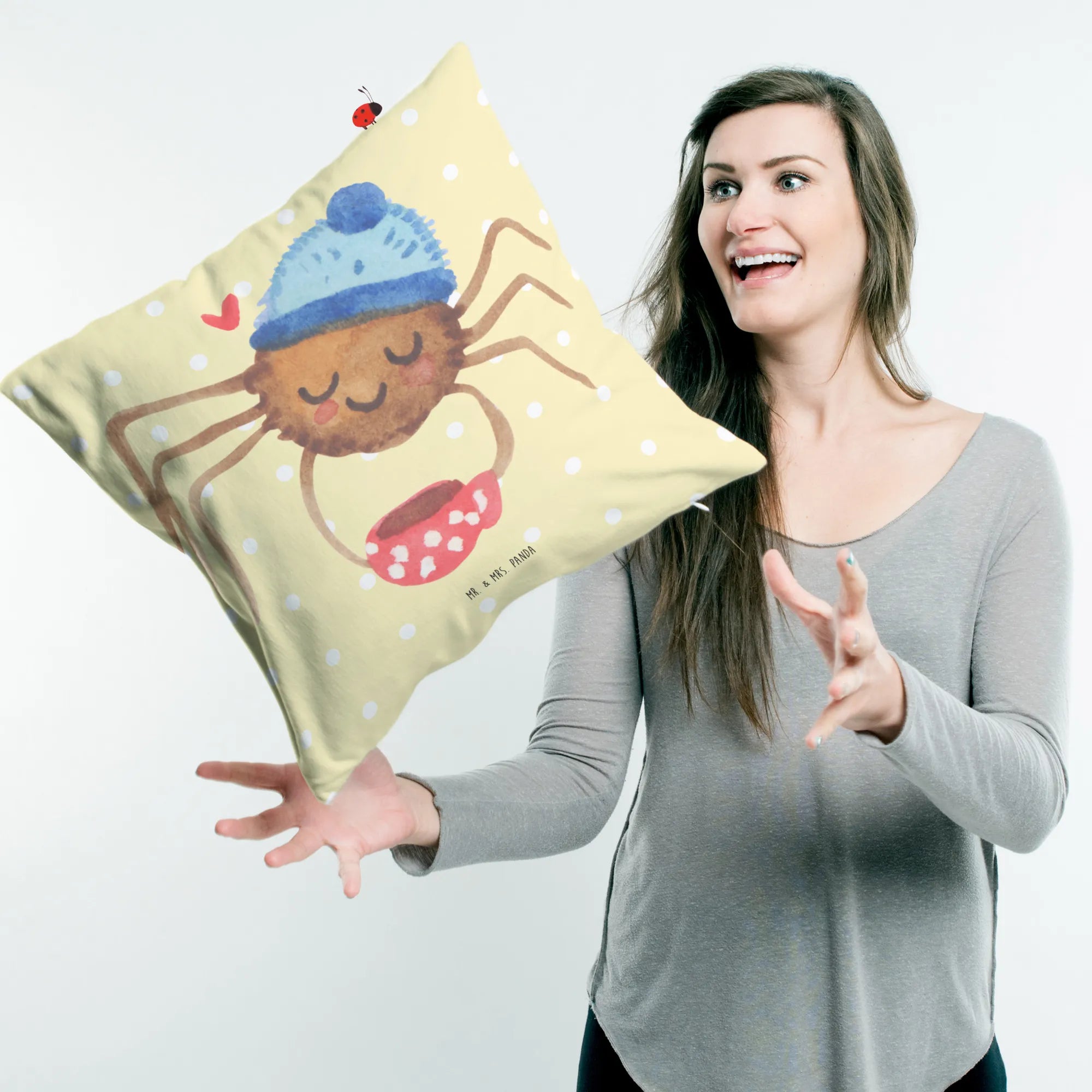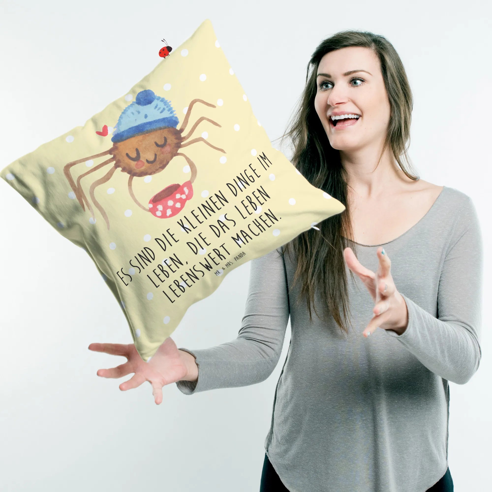 Es ist Teil der beliebten Spinne Agathe Kollektion, die durch die Social Media-Kanäle von Mr. & Mrs. Panda berühmt wurde, als Nora, alias Mrs. Panda, eine besondere Beziehung zu Agathe aufbaute. Das Kissen strahlt Lebensfreude und die Botschaft aus, dass es die kleinen Dinge im Leben sind, die zählen.