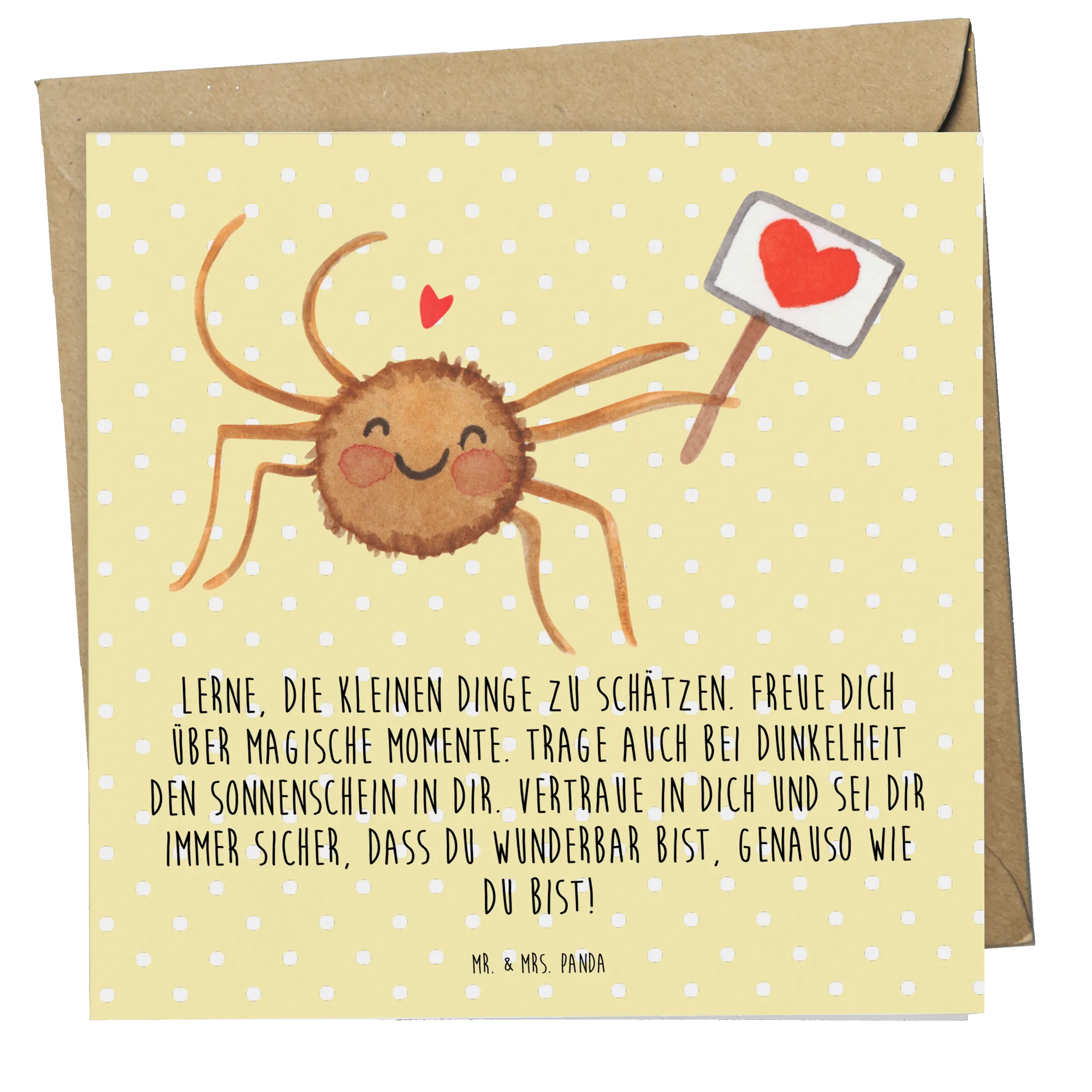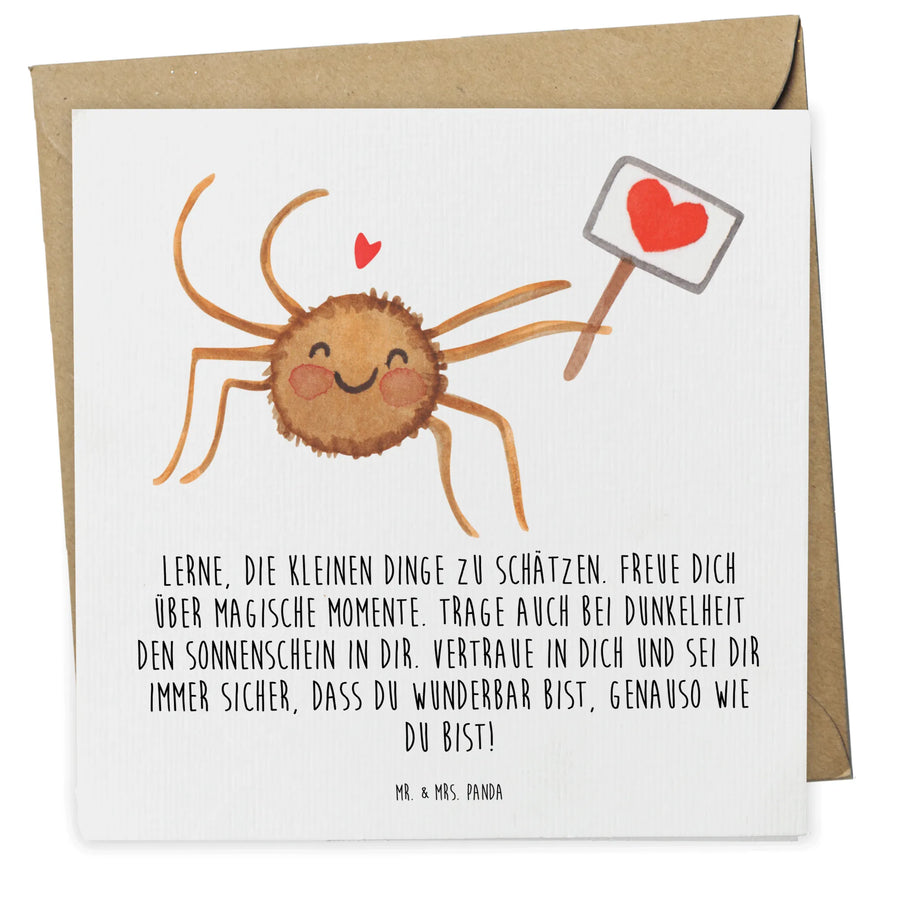 Die Deluxe Karte Spinne Agathe Motivation von Mr. & Mrs. Panda ist das perfekte Geschenk für jeden, der Motivation, Glück und Vertrauen in seinem Leben braucht. Diese wunderschöne und besonders hochwertige quadratische Karte ist genau richtig, um einem lieben Menschen 'Danke' zu sagen, ihn zum Geburtstag zu beglückwünschen oder einfach nur eine kleine Freude zu bereiten.