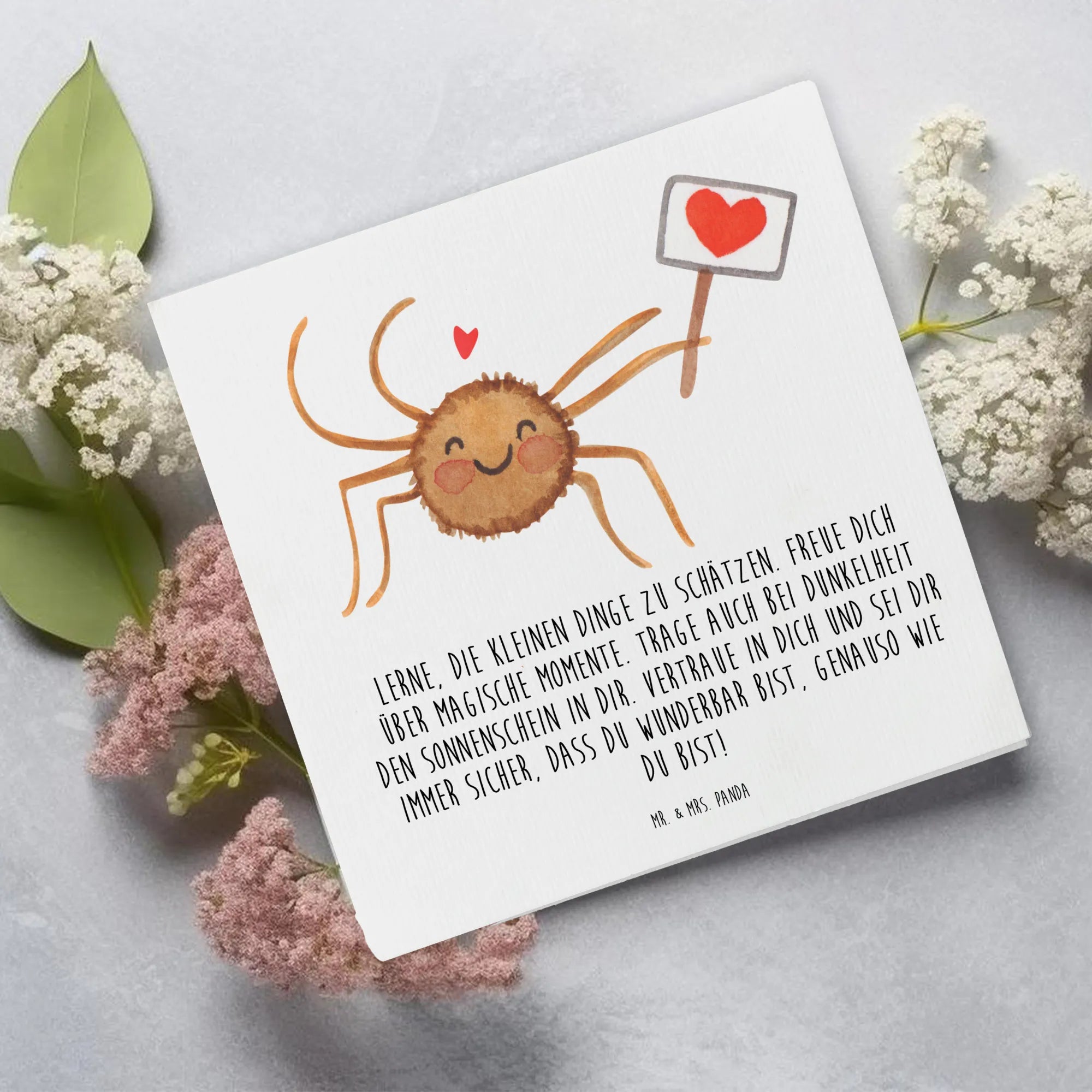Mit den Maßen 140 mm x 140 mm und dem hochwertigen Karton von 300 Gramm wird sie zu einer echten Besonderheit. Auf der Vorderseite lächelt die freundliche Spinne Agathe und hält ein herzchenbeschriftetes Schild, das einfach gute Laune macht. Der Spruch auf der Karte - 'Lerne, die kleinen Dinge zu schätzen. Freue dich über magische Momente.' - inspiriert dazu, optimistisch in die Zukunft zu blicken.