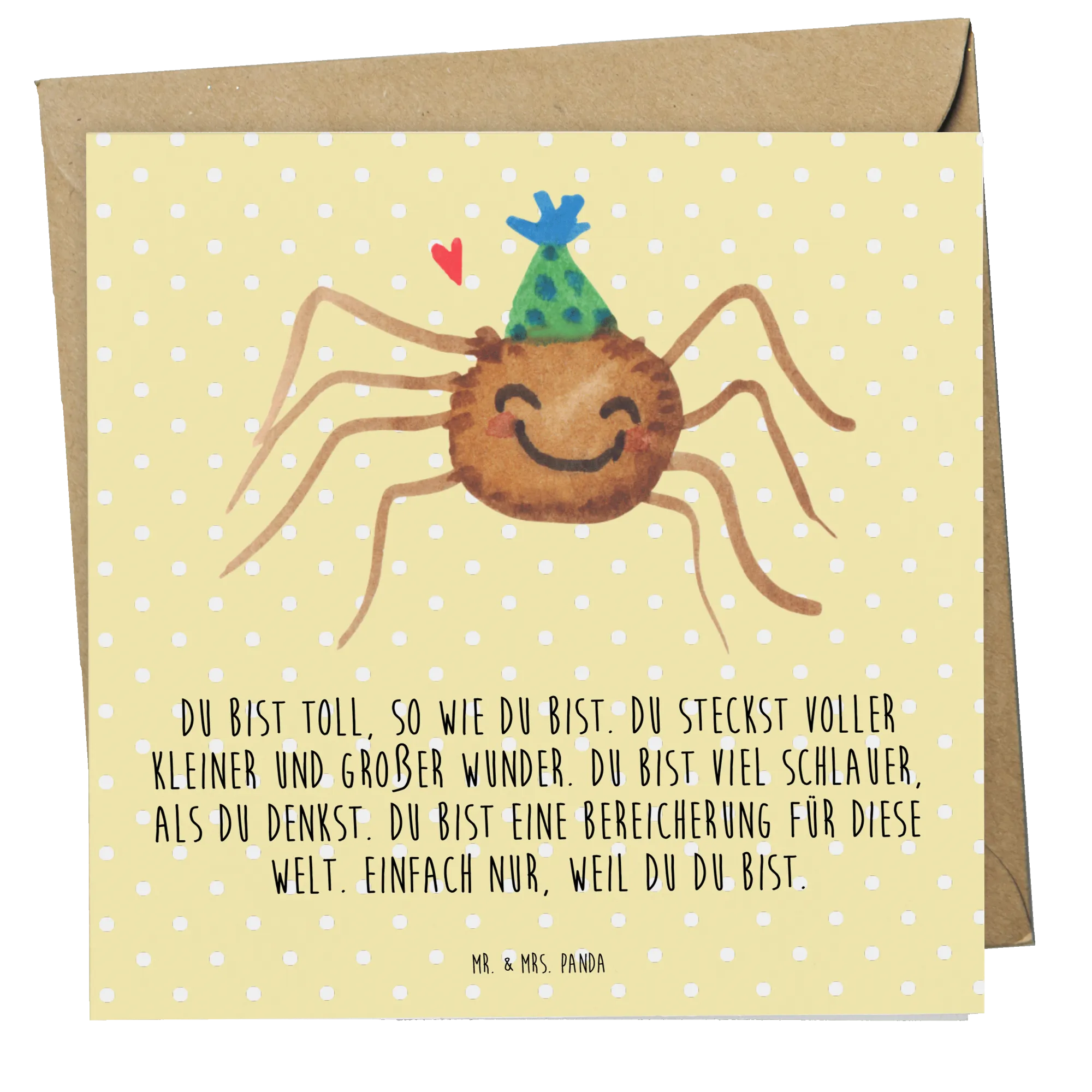 Die Deluxe Karte 'Spinne Agathe Party' von Mr. & Mrs. Panda ist das perfekte Geschenk für all jene, die ein wenig Freude und Selbstliebe verbreiten möchten. Ob zu Geburtstagen, Hochzeiten oder anderen festlichen Anlässen, diese hochwertige quadratische Karte ist ein echter Hingucker.