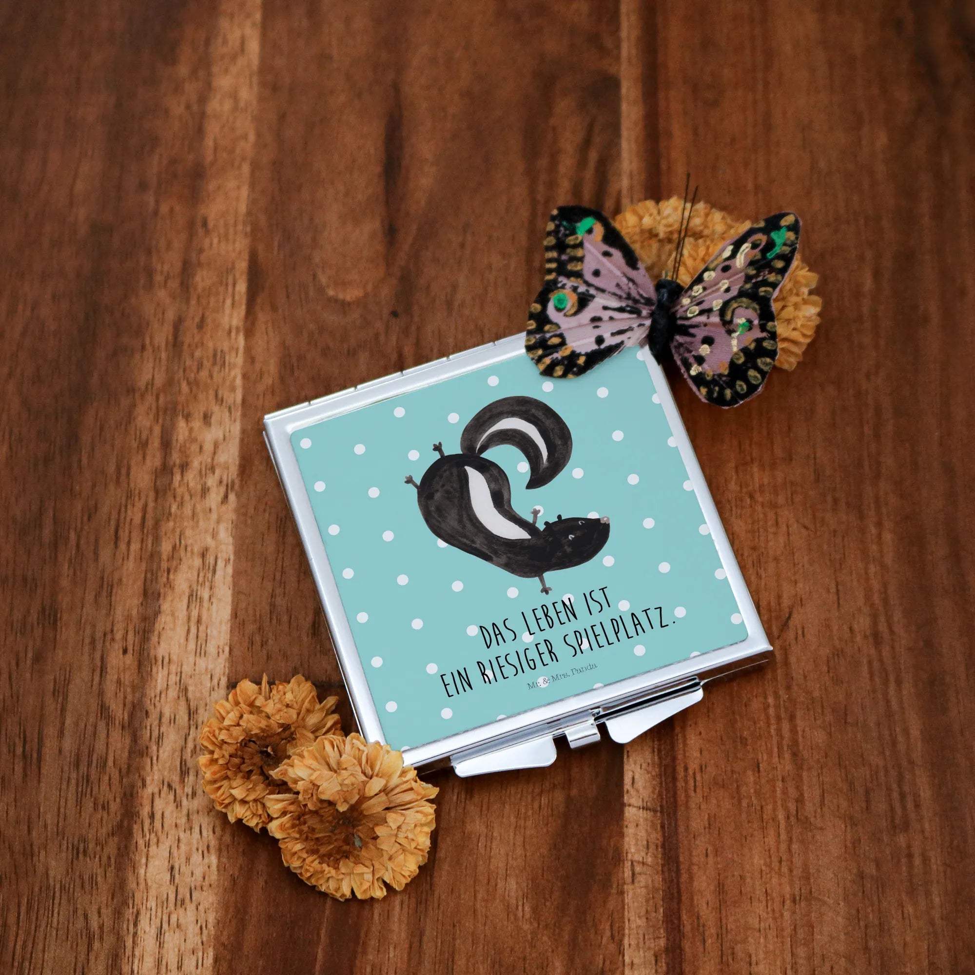 Kwadratowe lusterko do torebki skunks stojka - z napisem - pastelowy turkus