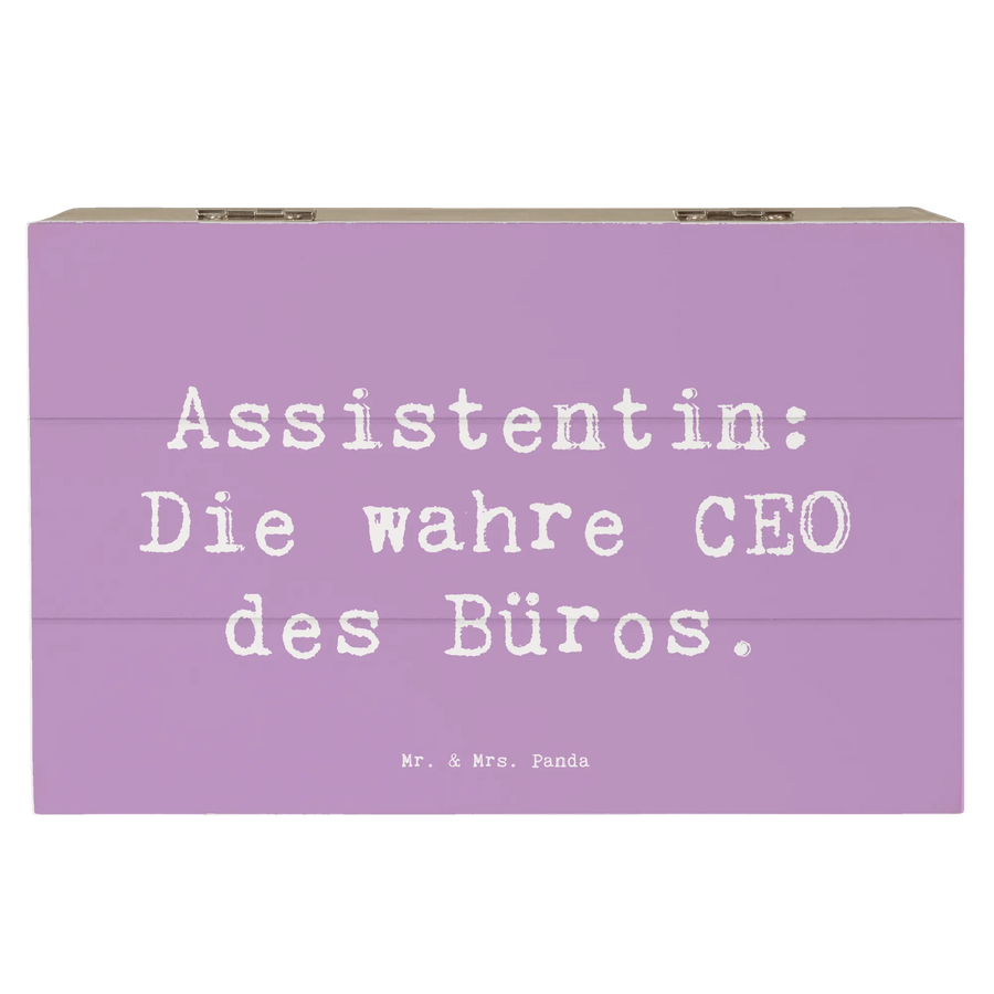 Entdecke die bezaubernde Holzkiste mit dem Slogan "Assistentin: Die wahre CEO des Büros" von Mr. & Mrs. Panda! Diese wunderschöne Erinnerungskiste ist perfekt, um all deine wertvollen Schätze aufzubewahren.