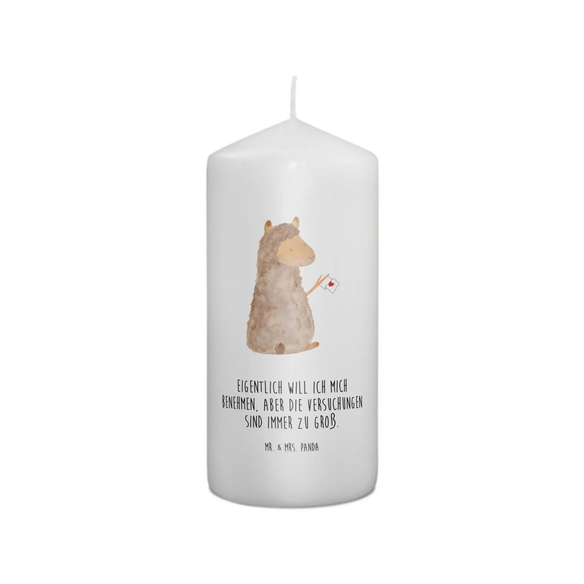 Die wunderschöne Taufkerze mit dem liebevollen Alpaka-Motiv von Mr. & Mrs. Panda ist das perfekte Geschenk für besondere Anlässe. Mit der tollen Fahne in der Hand und dem herzlichen Spruch 'Eigentlich will ich mich benehmen, aber die Versuchungen sind immer zu groß' verzaubert diese Kerze jeden Raum und sorgt für eine fröhliche Stimmung.