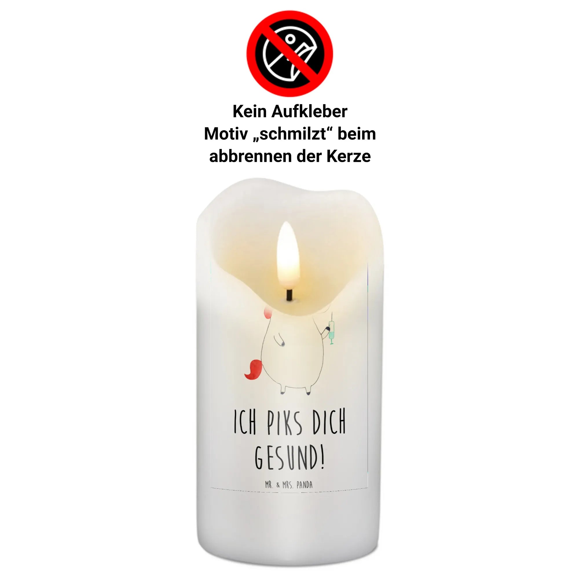 Die hochwertige Verarbeitung und die liebevollen Details machen sie unverwechselbar. Der Slogan „Ich piks dich gesund!“ verbindet auf humorvolle Art und Weise das Thema Gesundheit mit dem charmanten Einhorn-Motiv. So wird diese Kerze nicht nur für Licht im Raum sorgen, sondern auch für eine besondere Stimmung bei jedem Anlass.