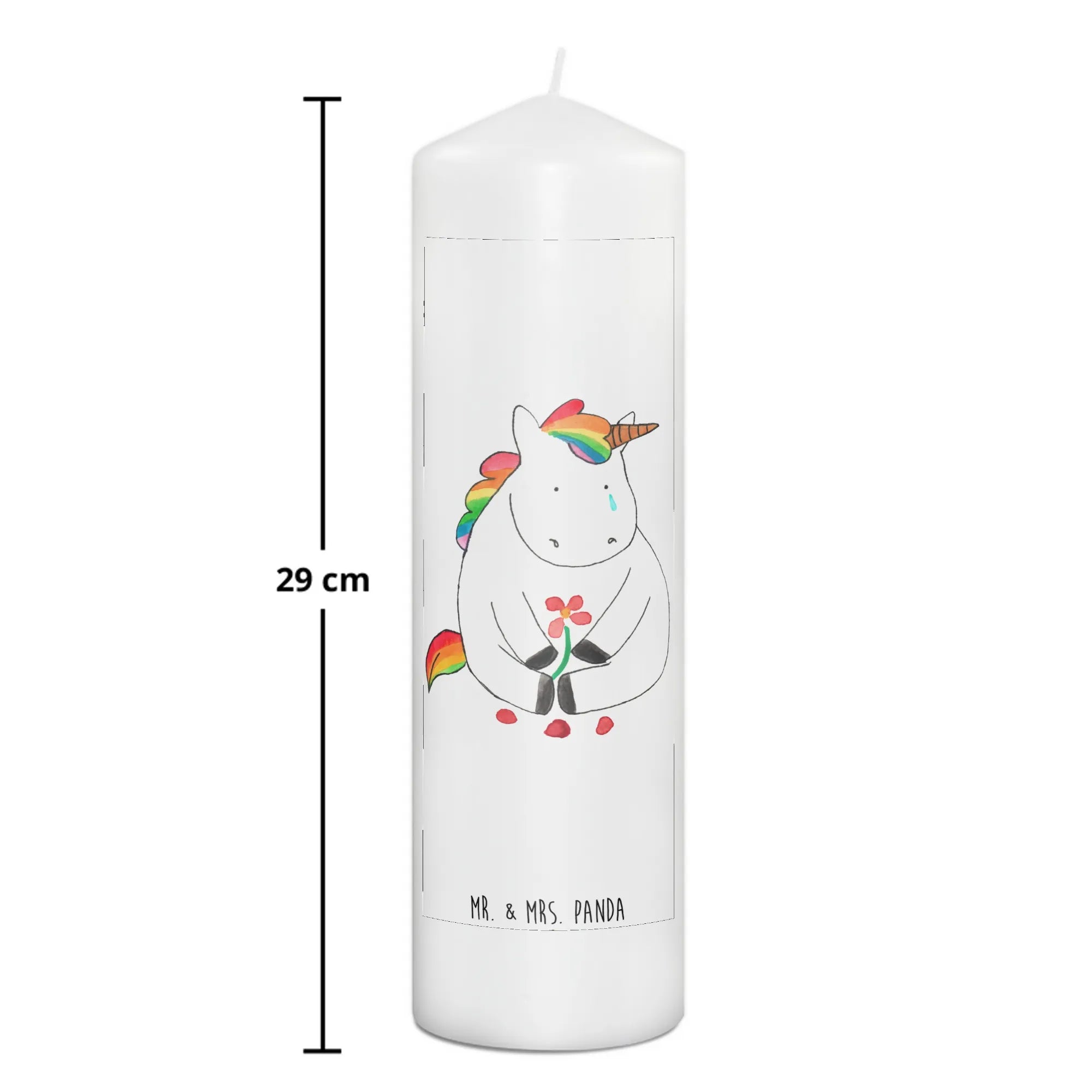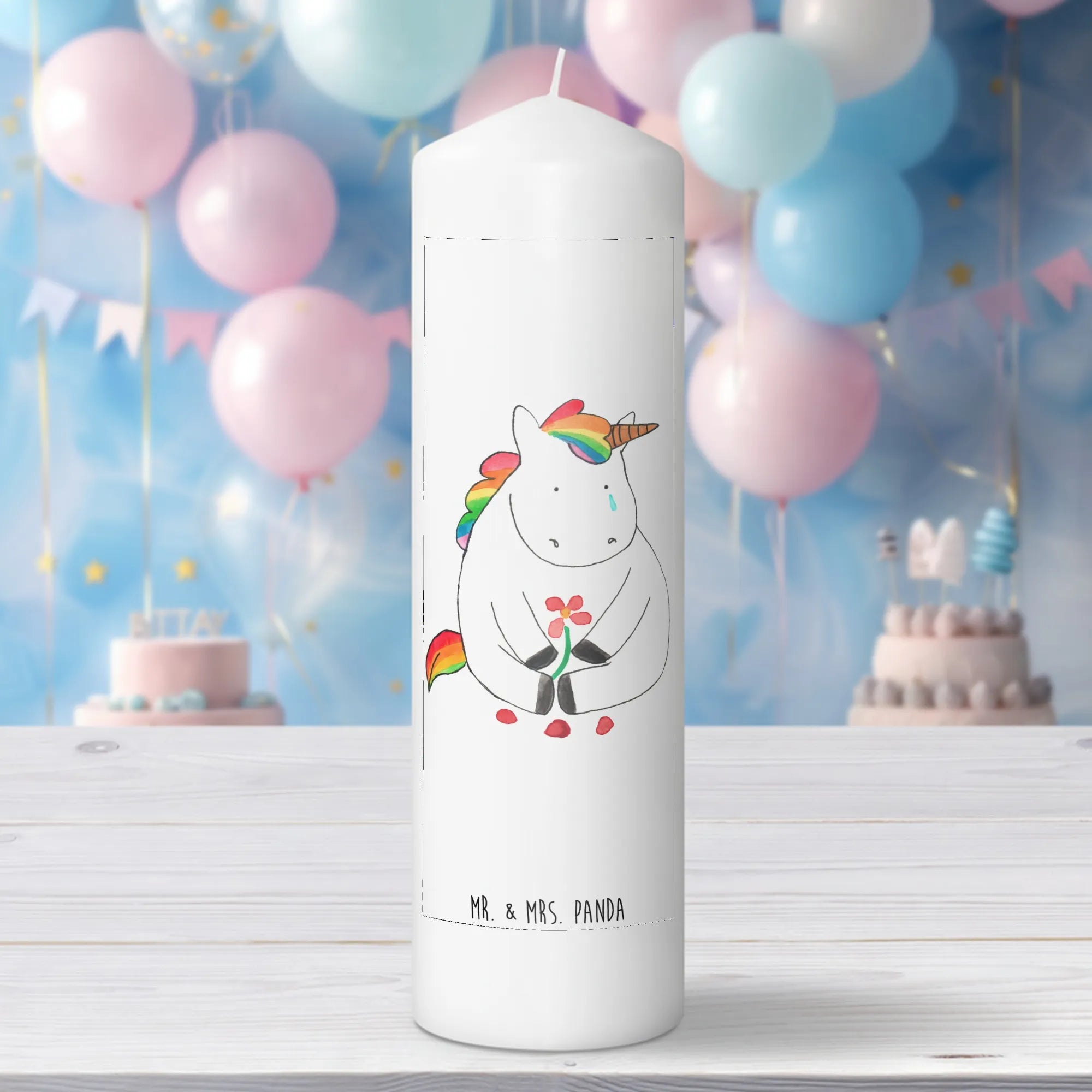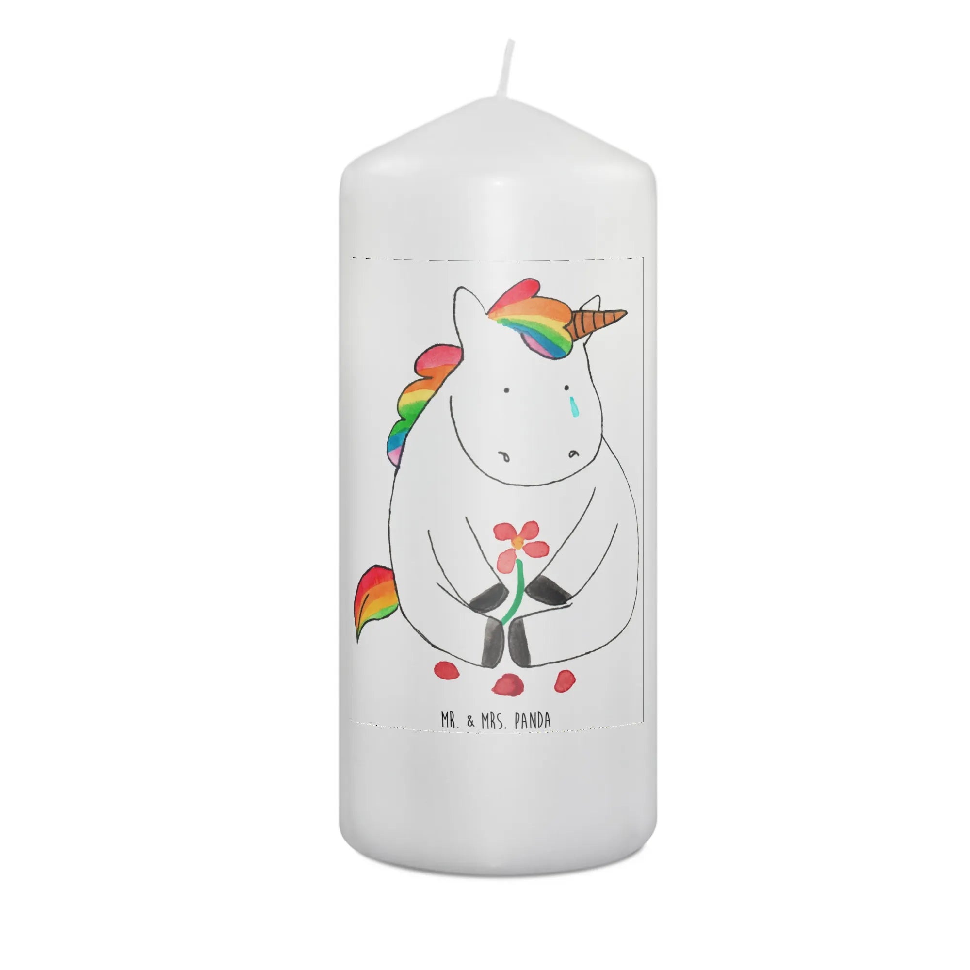 Du suchst das perfekte Geschenk für einen besonderen Anlass? Unsere zauberhafte Taufkerze mit dem Motiv "Einhorn Traurig" aus der Einhorn-Kollektion von Mr. & Mrs. Panda ist genau das Richtige!