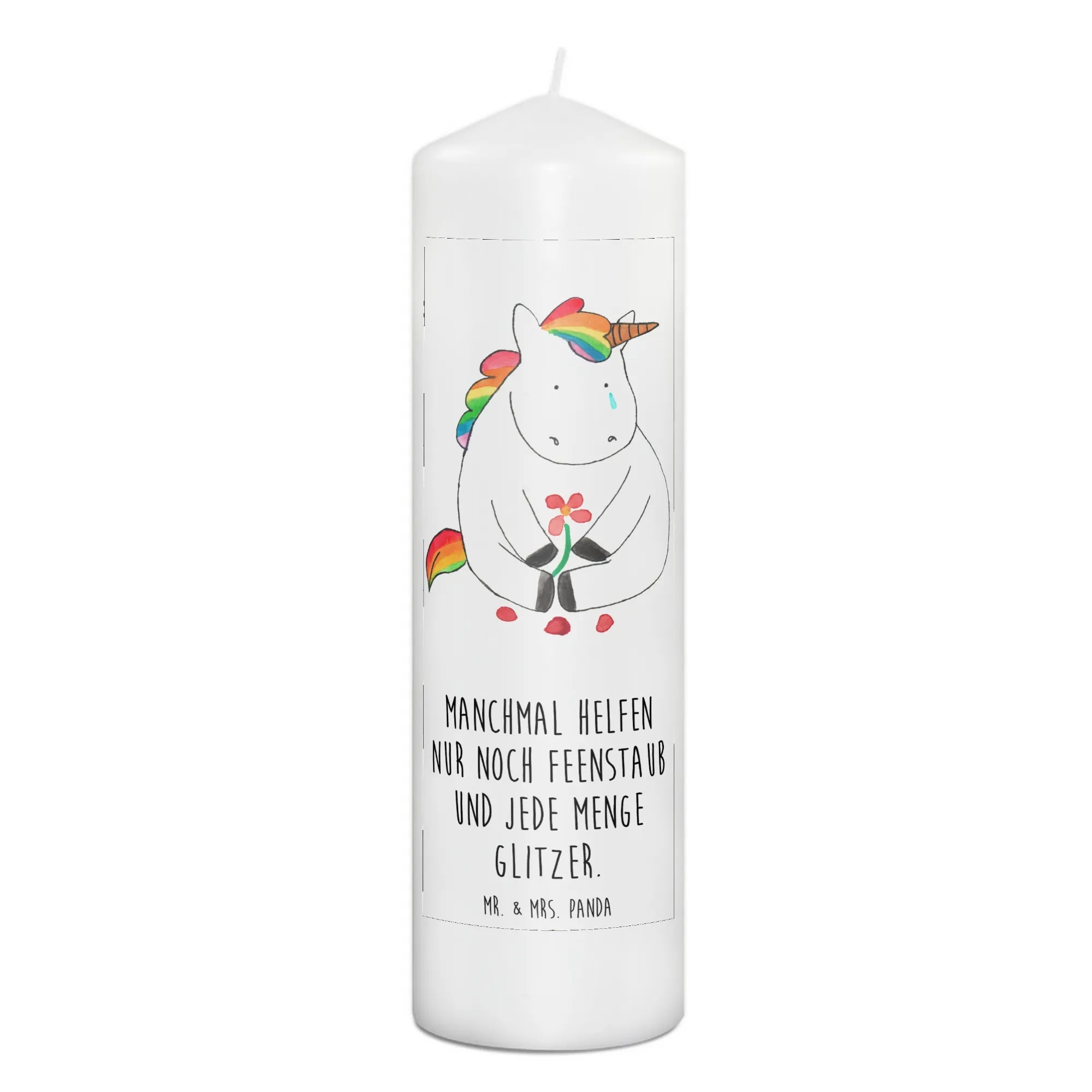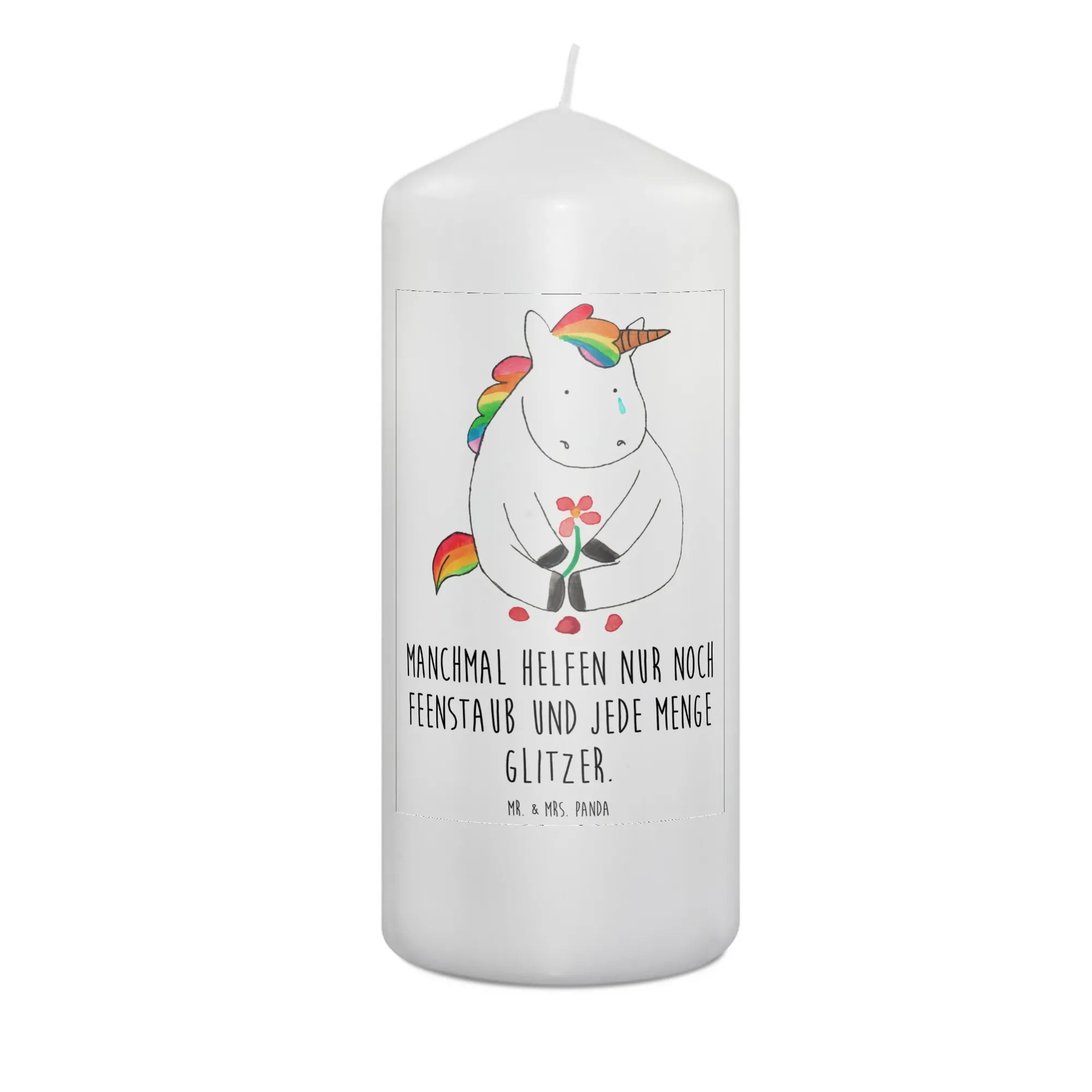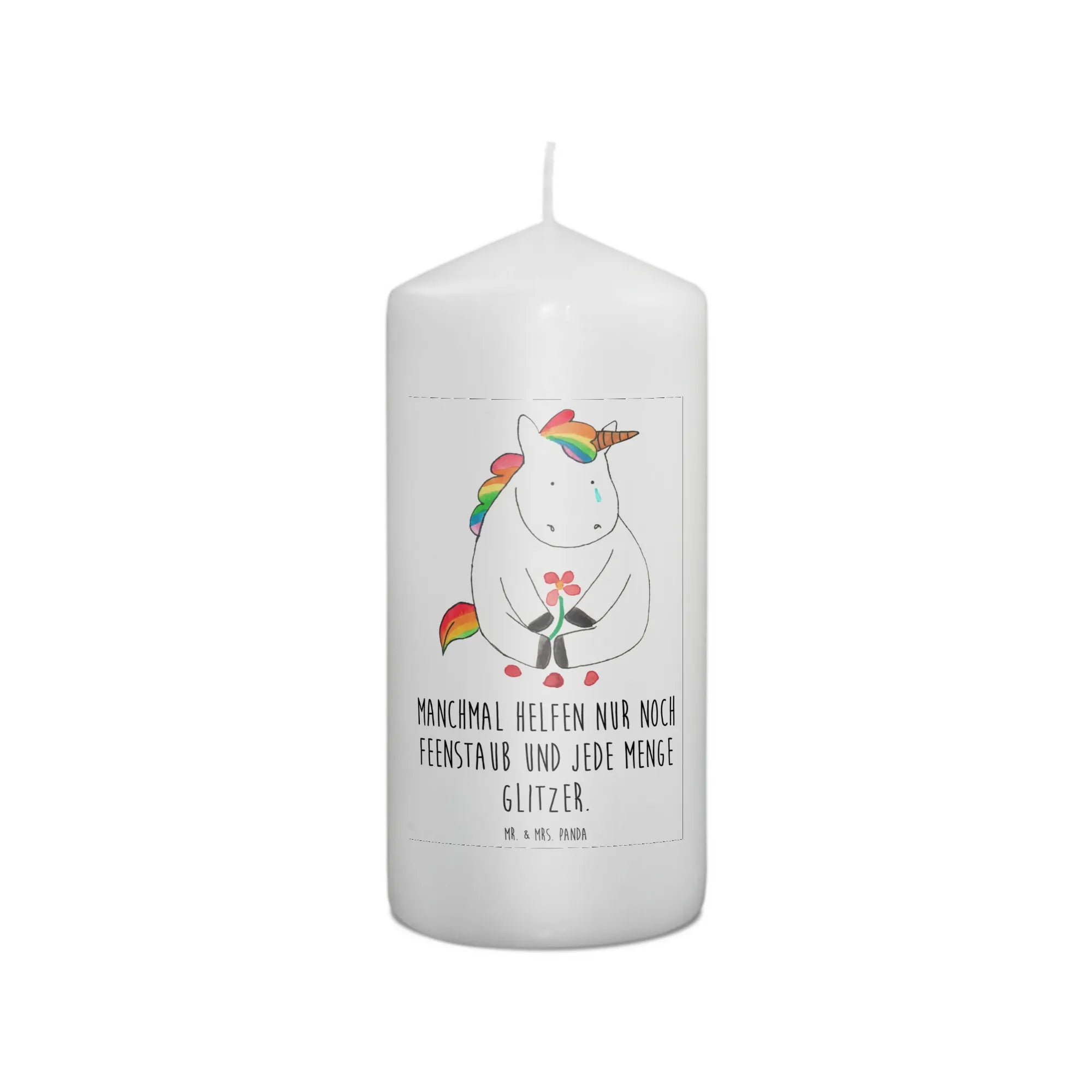 Unsere bezaubernde Kerze "Einhorn Traurig" aus der beliebten Einhorn-Kollektion von Mr. & Mrs. Panda ist das perfekte Geschenk für alle, die ein kleines Stück Glitzer in ihr Leben bringen möchten.