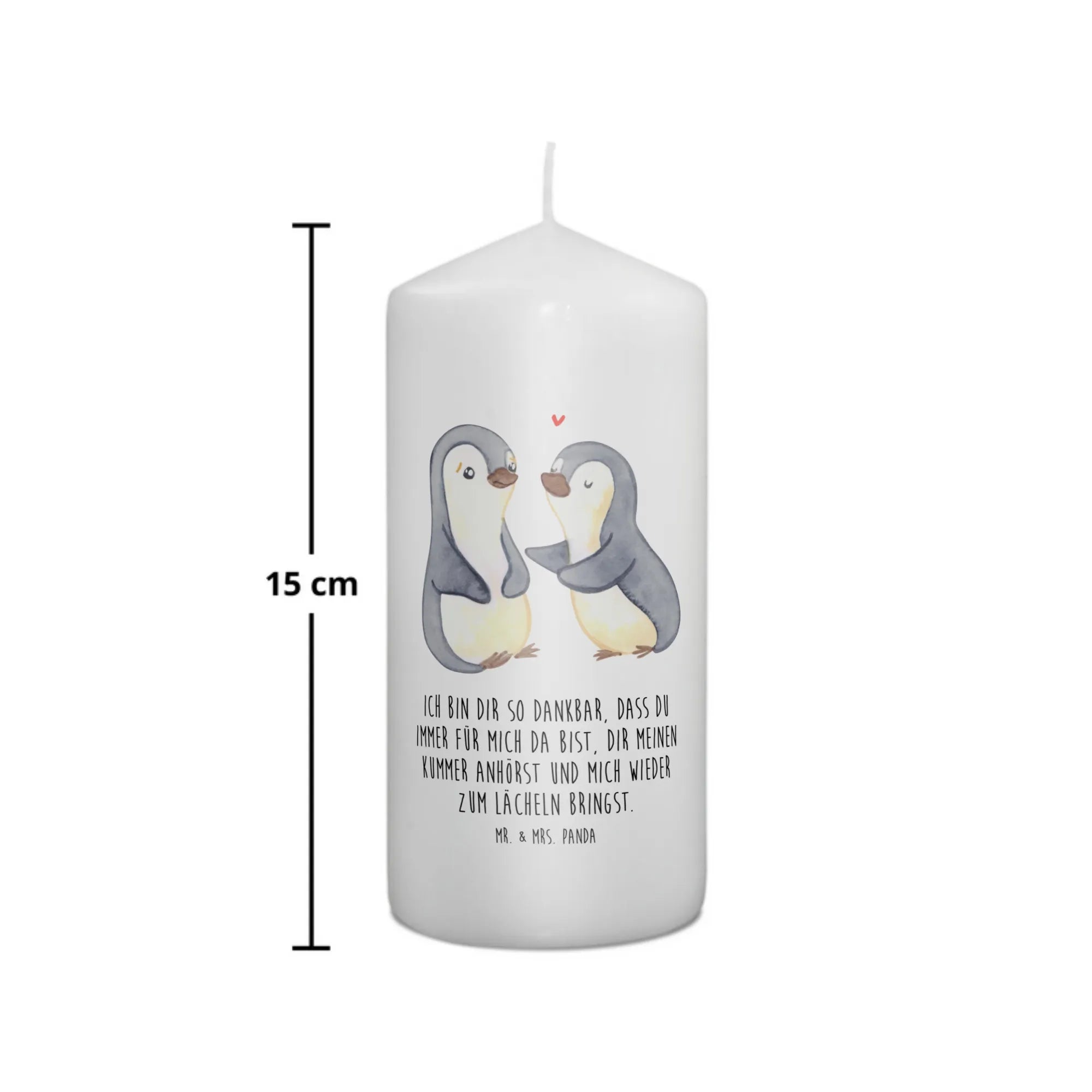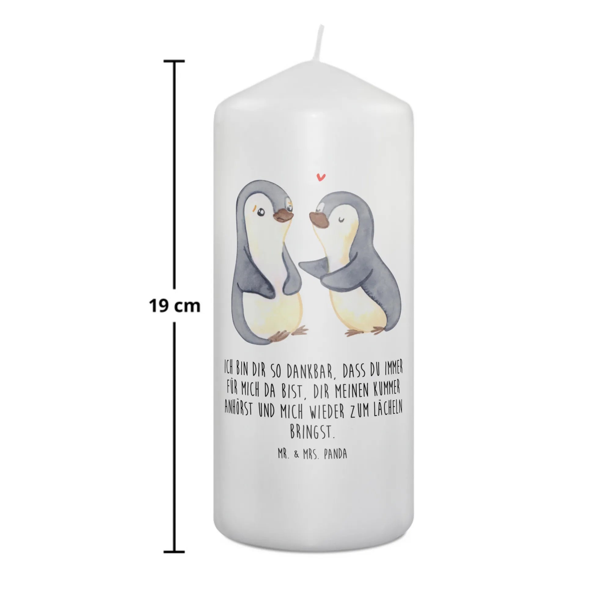 Die beiden Pinguine, die sich zärtlich zuneigen, symbolisieren Trost und Unterstützung und erzeugen so eine liebevolle, beruhigende Atmosphäre. Mit dem Spruch „Ich bin dir so dankbar, dass du immer für mich da bist, dir meinen Kummer anhörst und mich wieder zum Lächeln bringst“ transportiert diese Kerze eine herzliche Botschaft, die jedem Beschenkten ein Lächeln ins Gesicht zaubert.