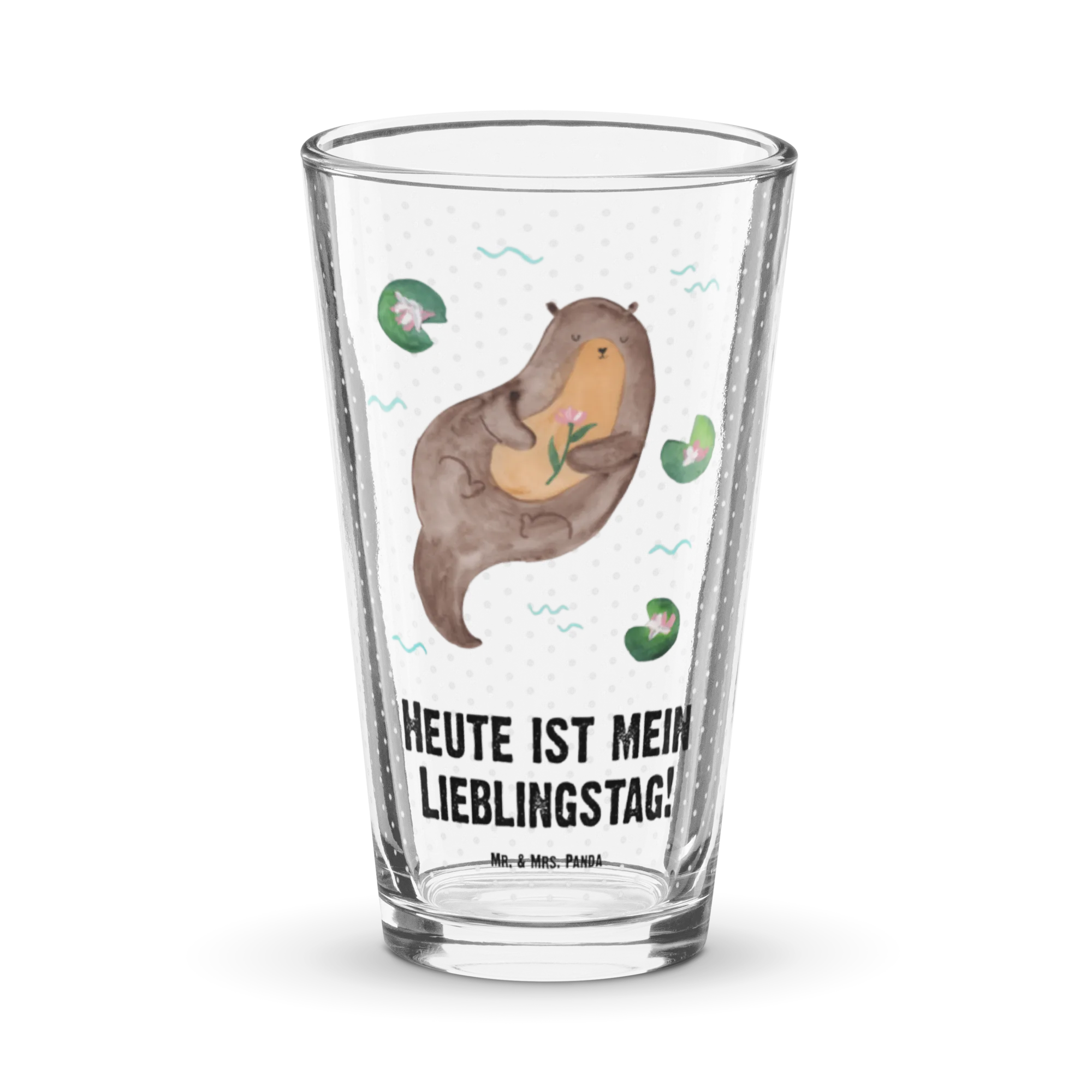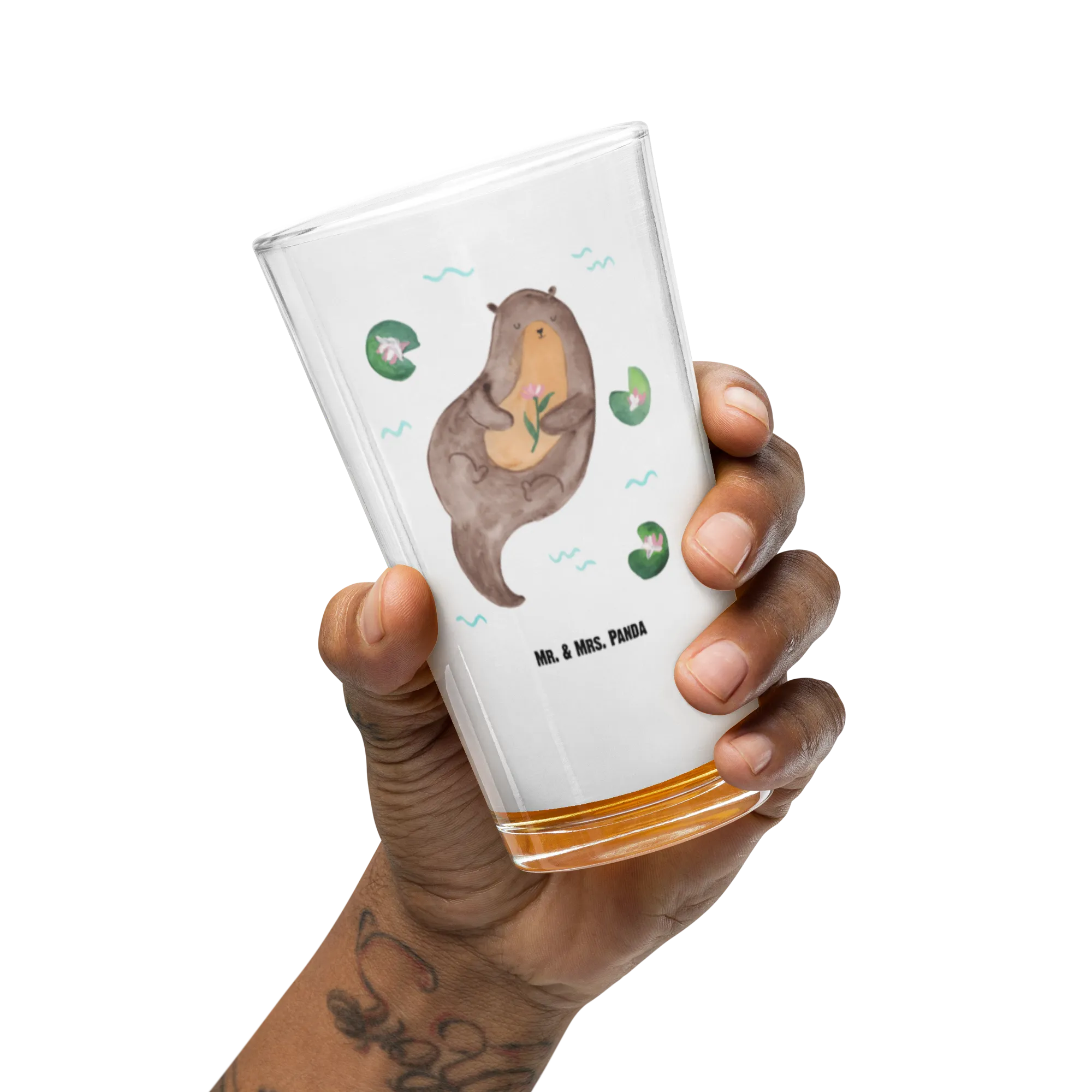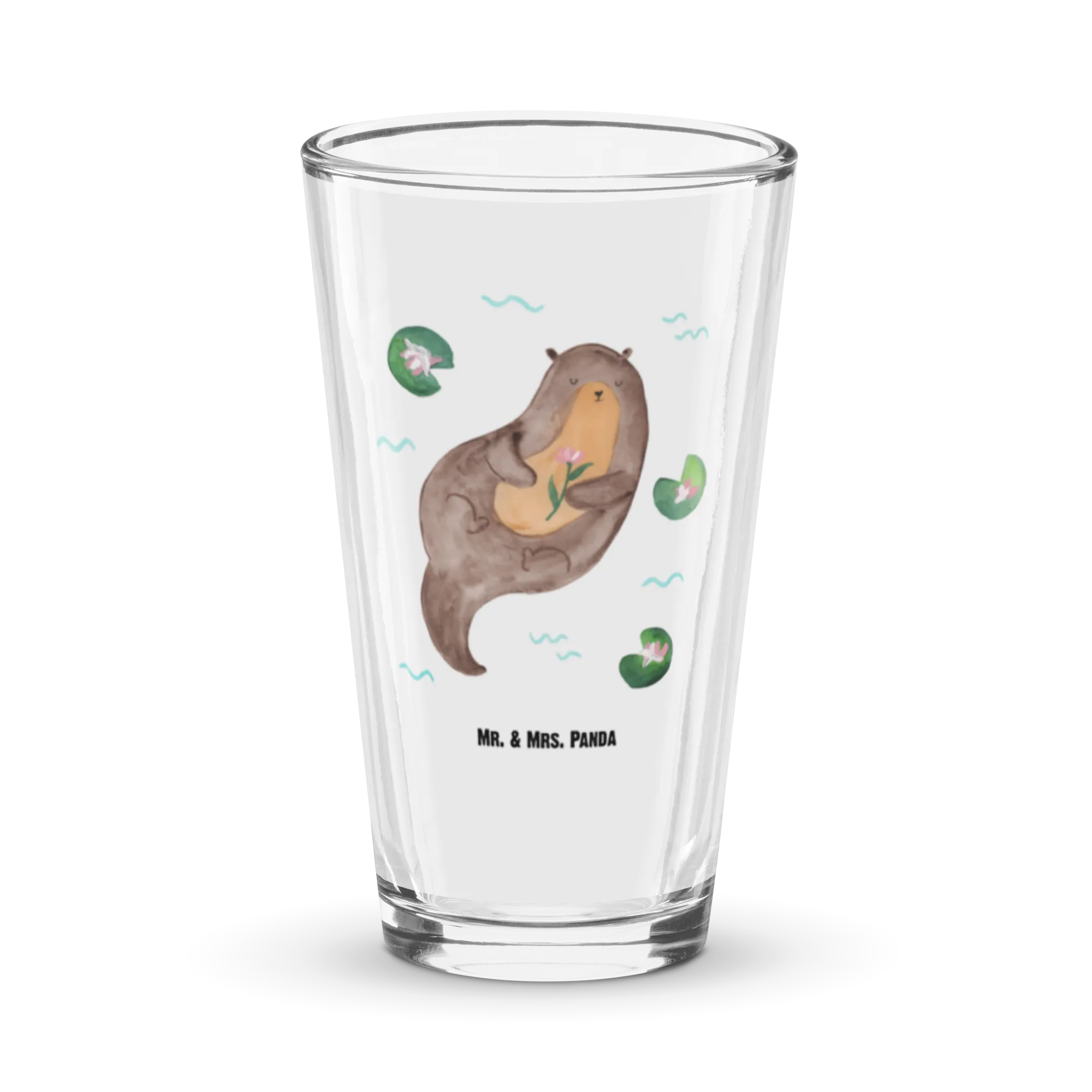 Entdecke das perfekte Geschenk mit unserem Premium Trinkglas Otter mit Seerose aus der Otter-Kollektion von Mr. & Mrs. Panda! Dieses edle und hochwertige Trinkglas begeistert mit einem zauberhaften Motiv eines Otters, der fröhlich durch Seerosen schwimmt. Ideal für all diejenigen, die die Natur und besonders Otter lieben!